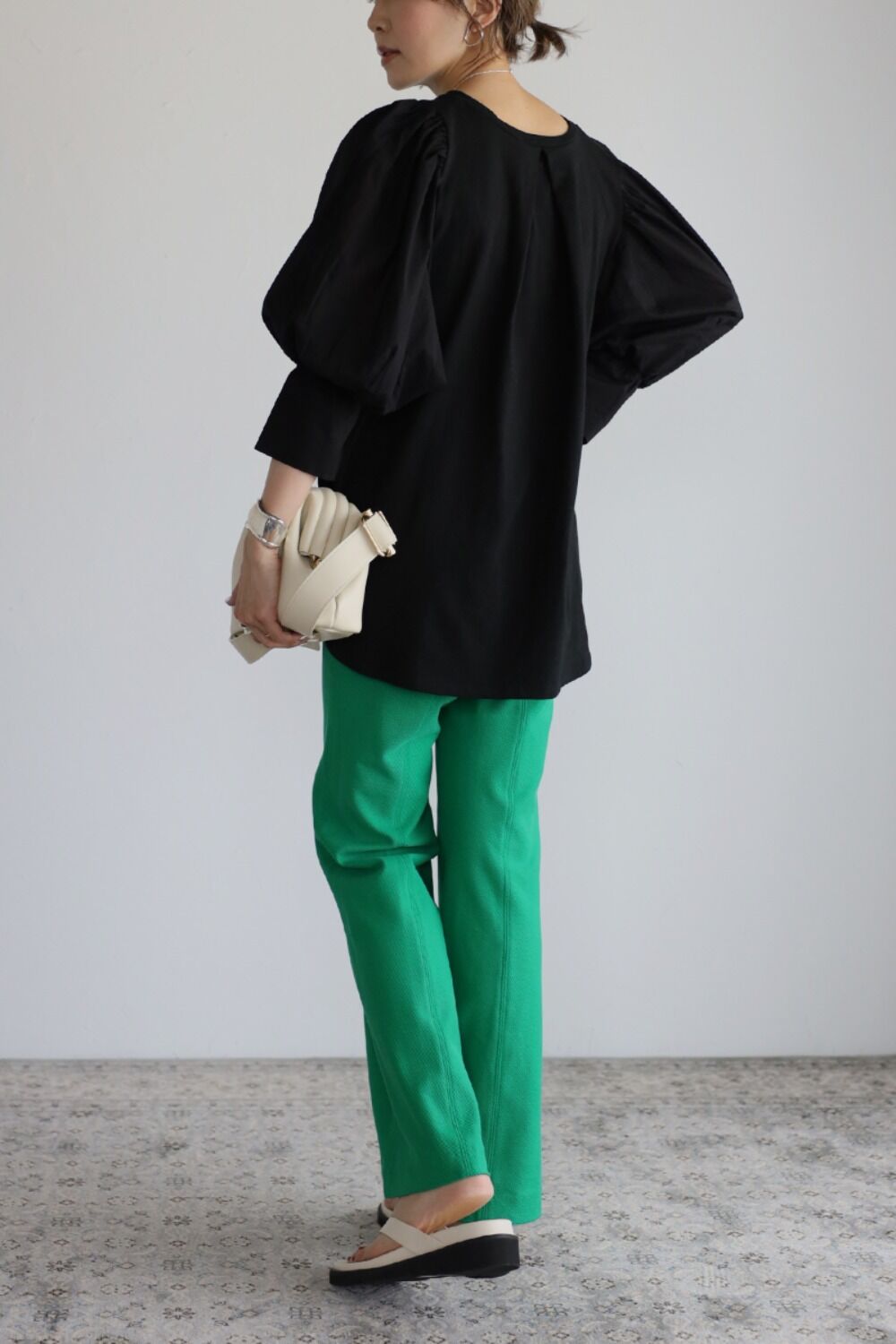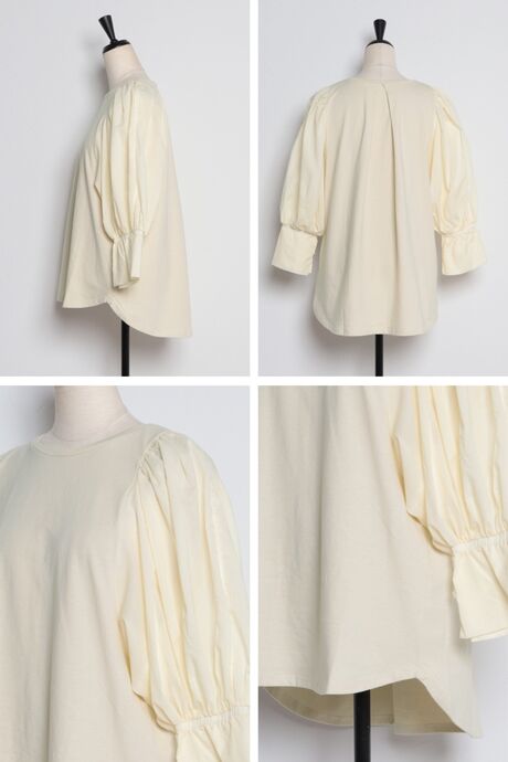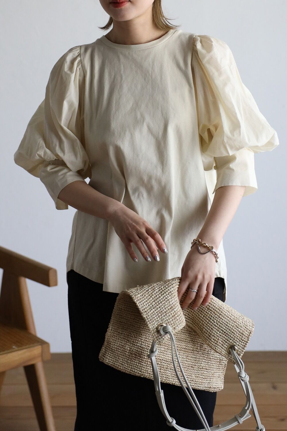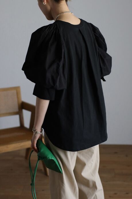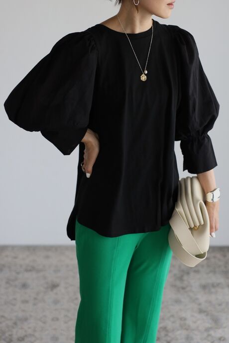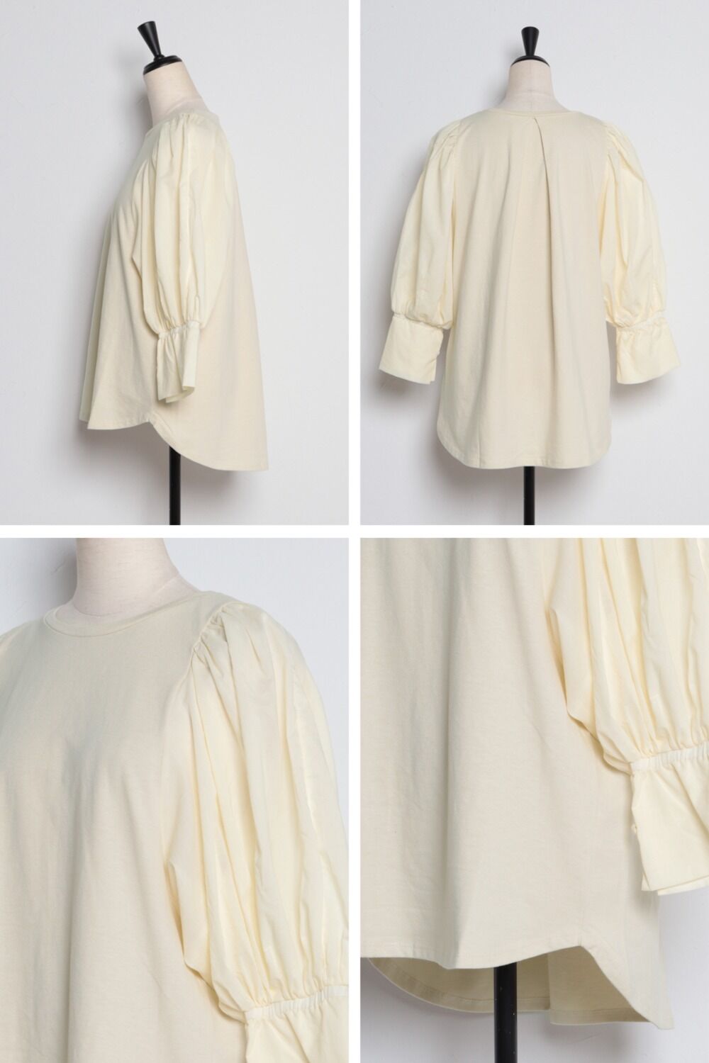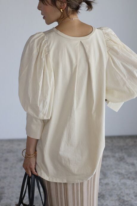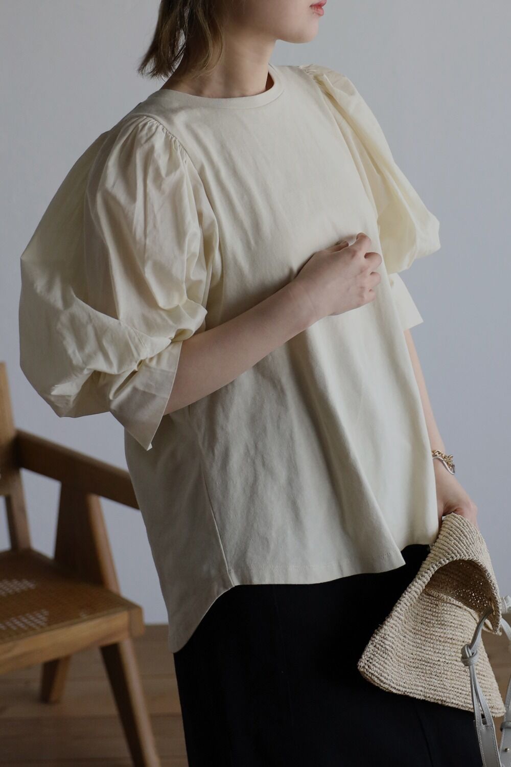 袖のふんわりとした異素材のディテールが目を惹くトップス。