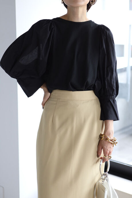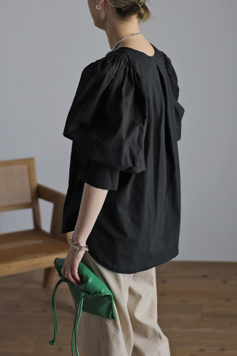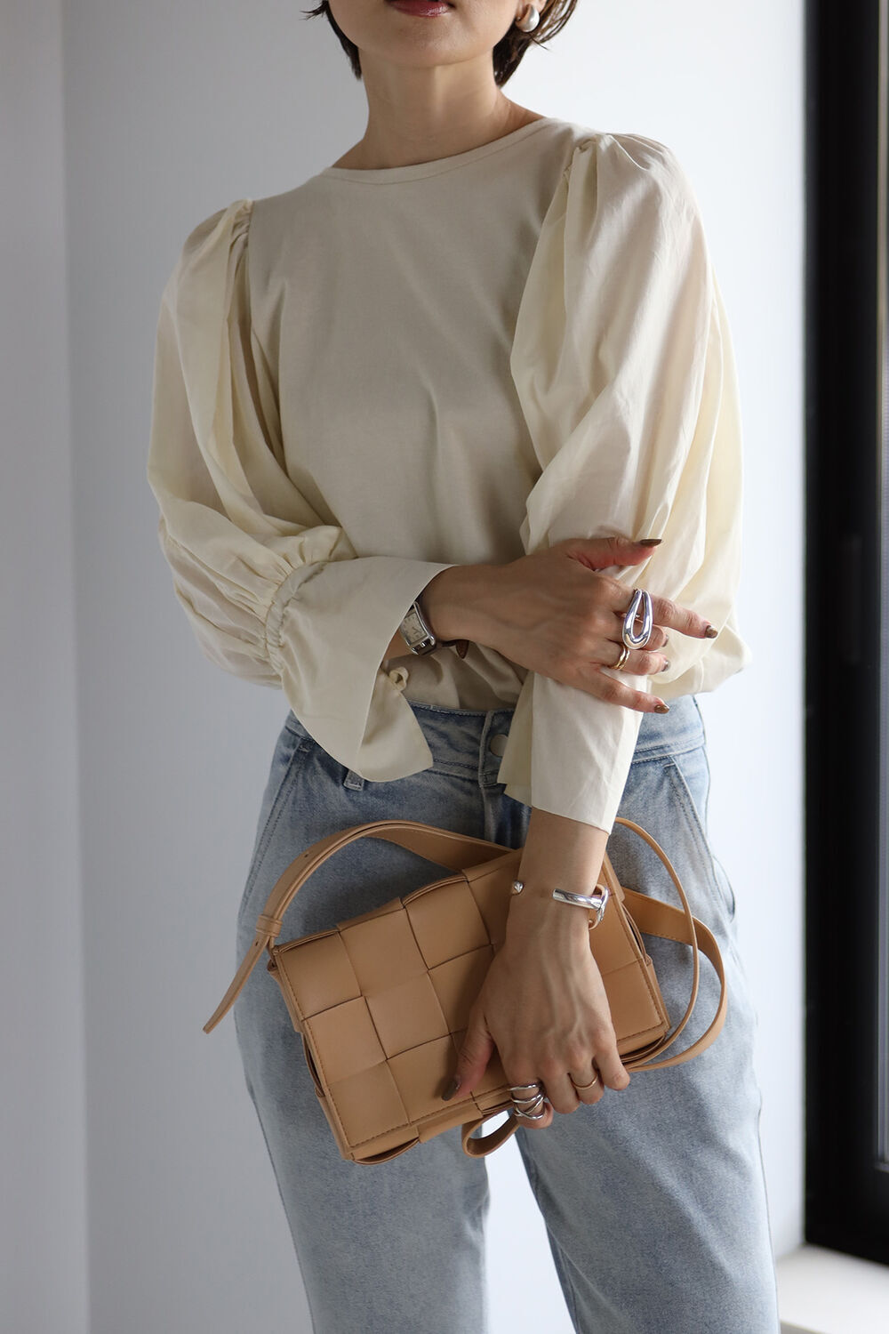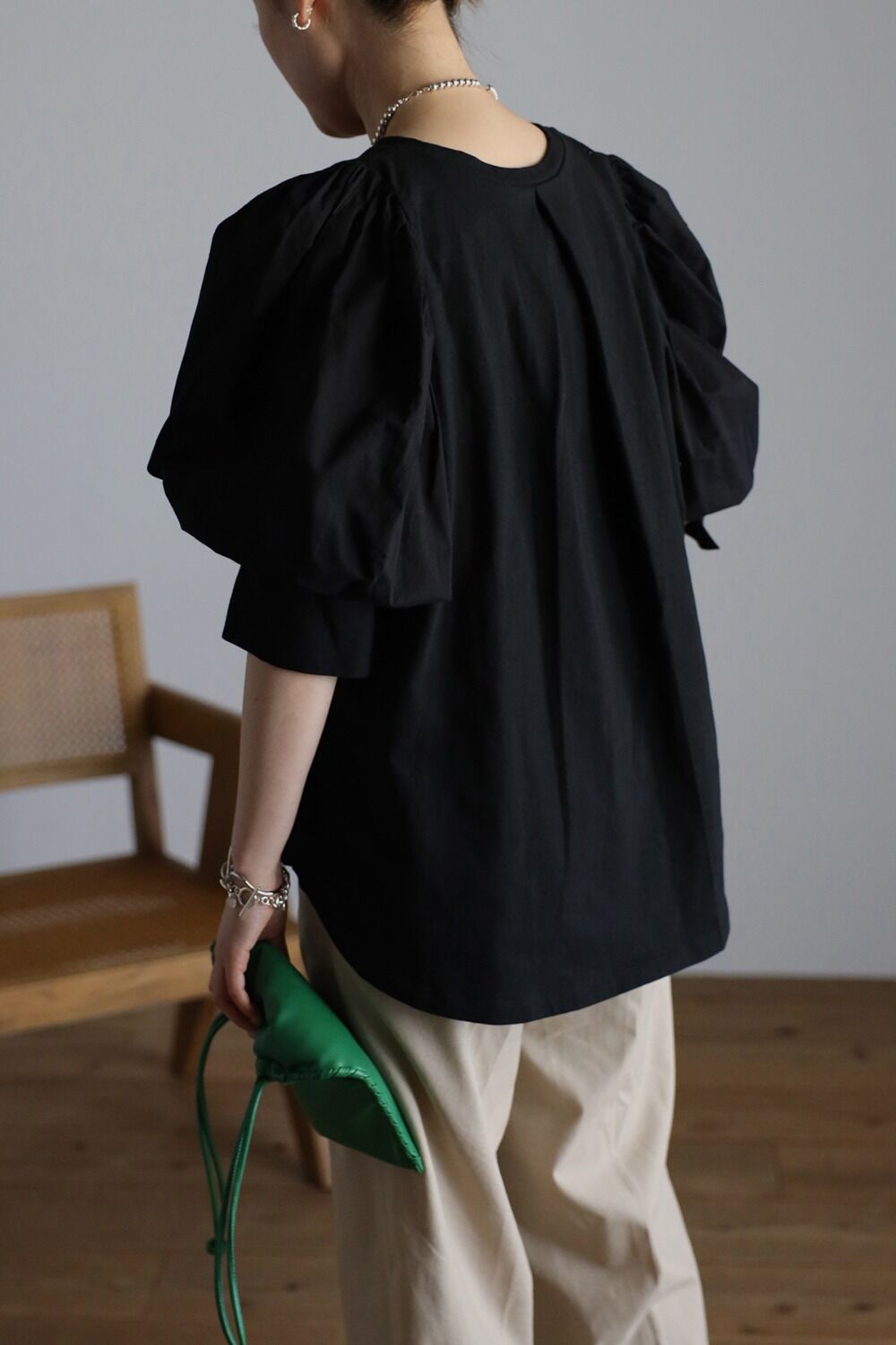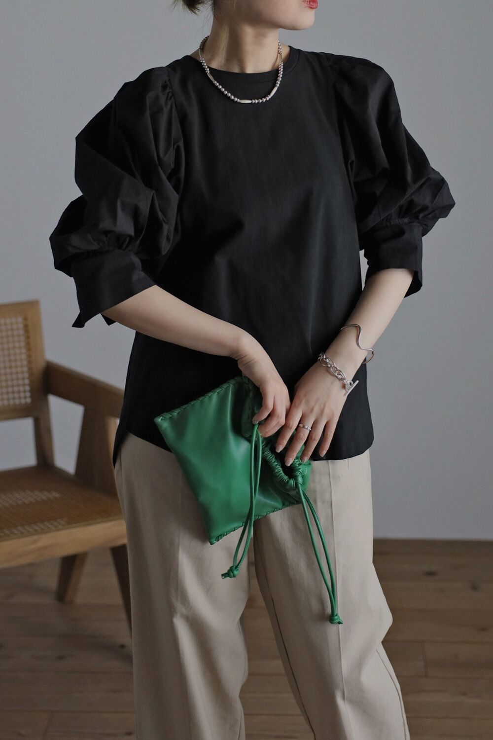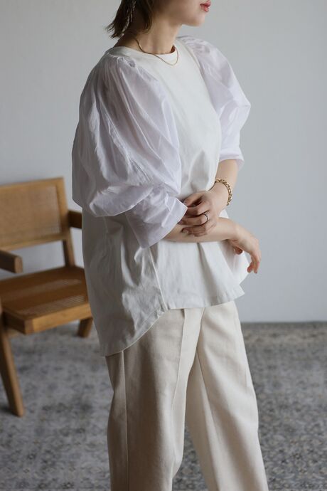 袖のふんわりとした異素材のディテールが目を惹くトップス。