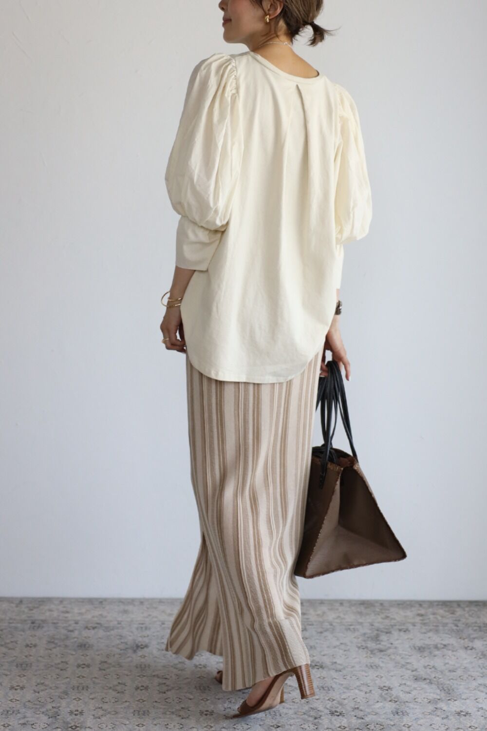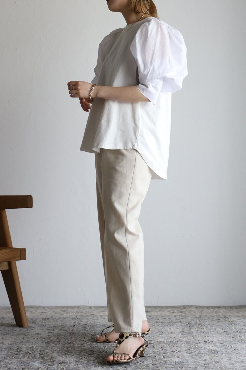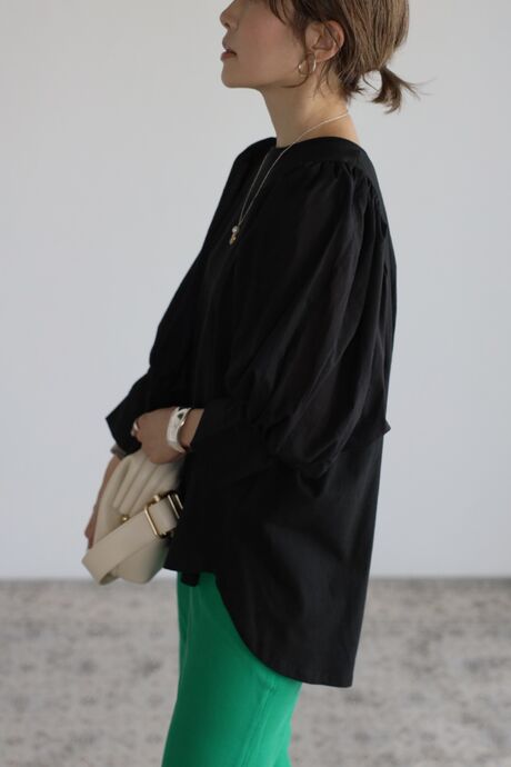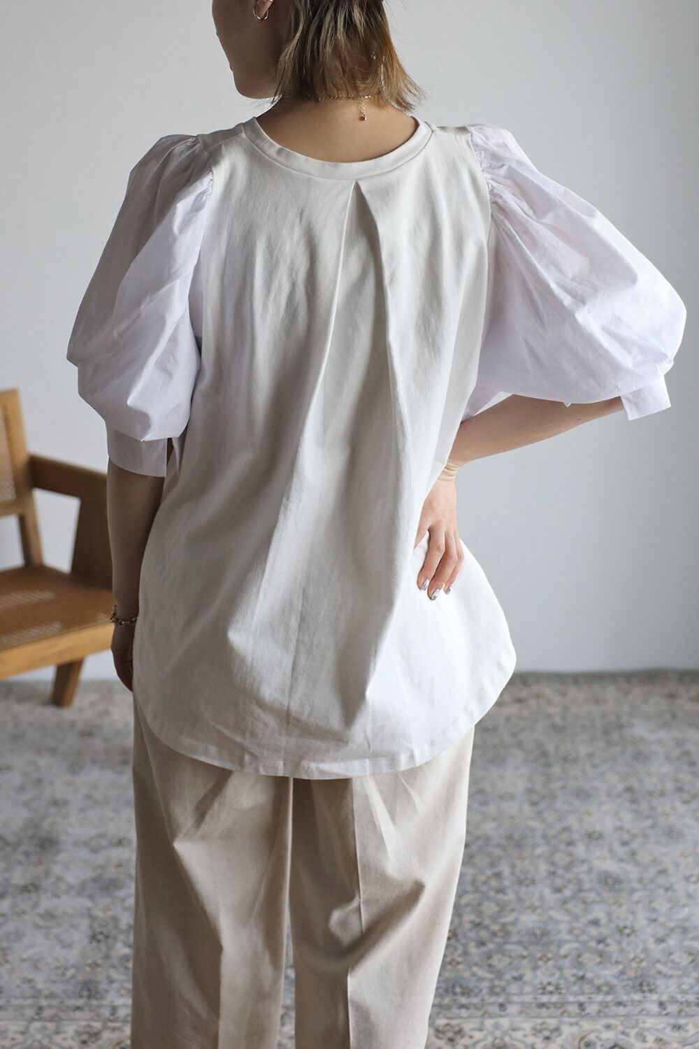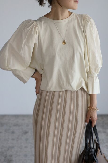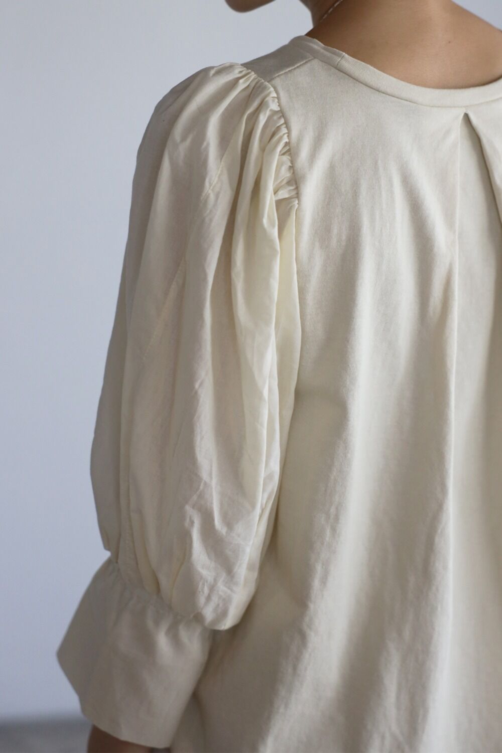 袖のふんわりとした異素材のディテールが目を惹くトップス。