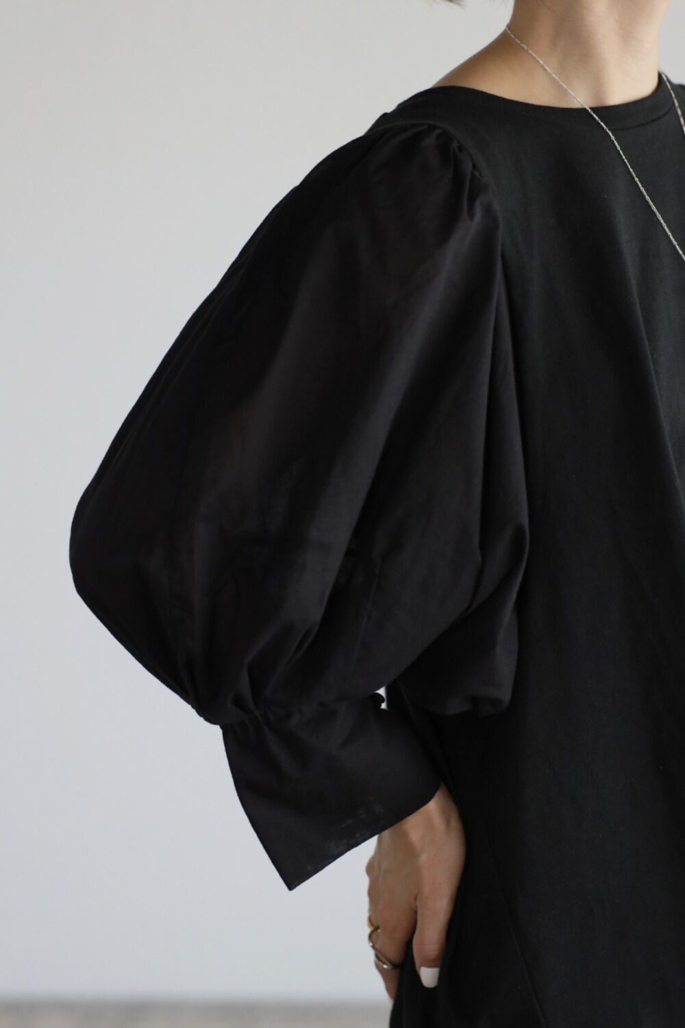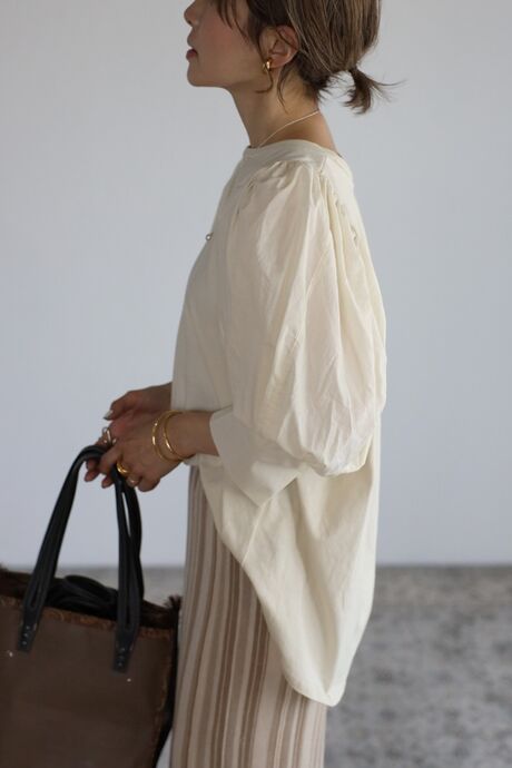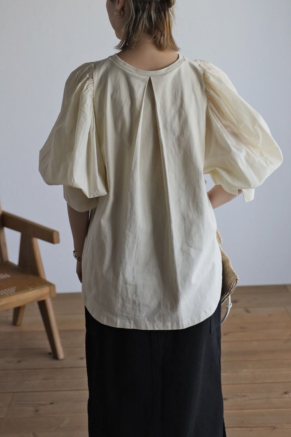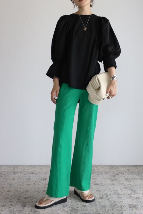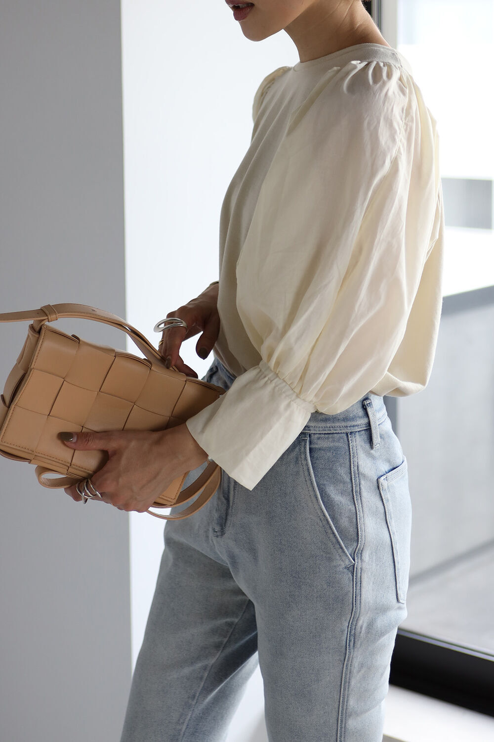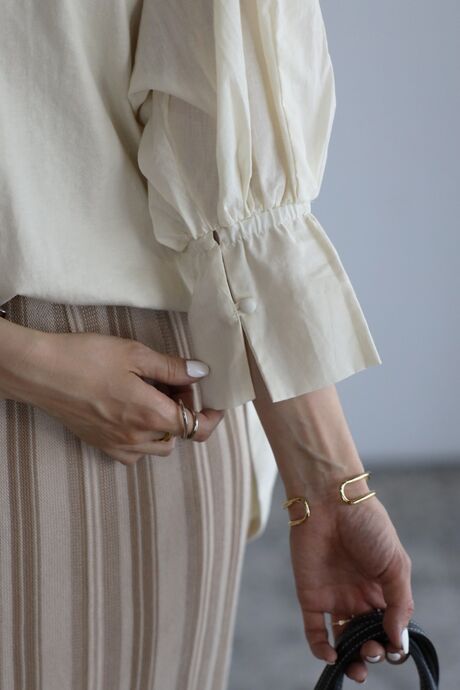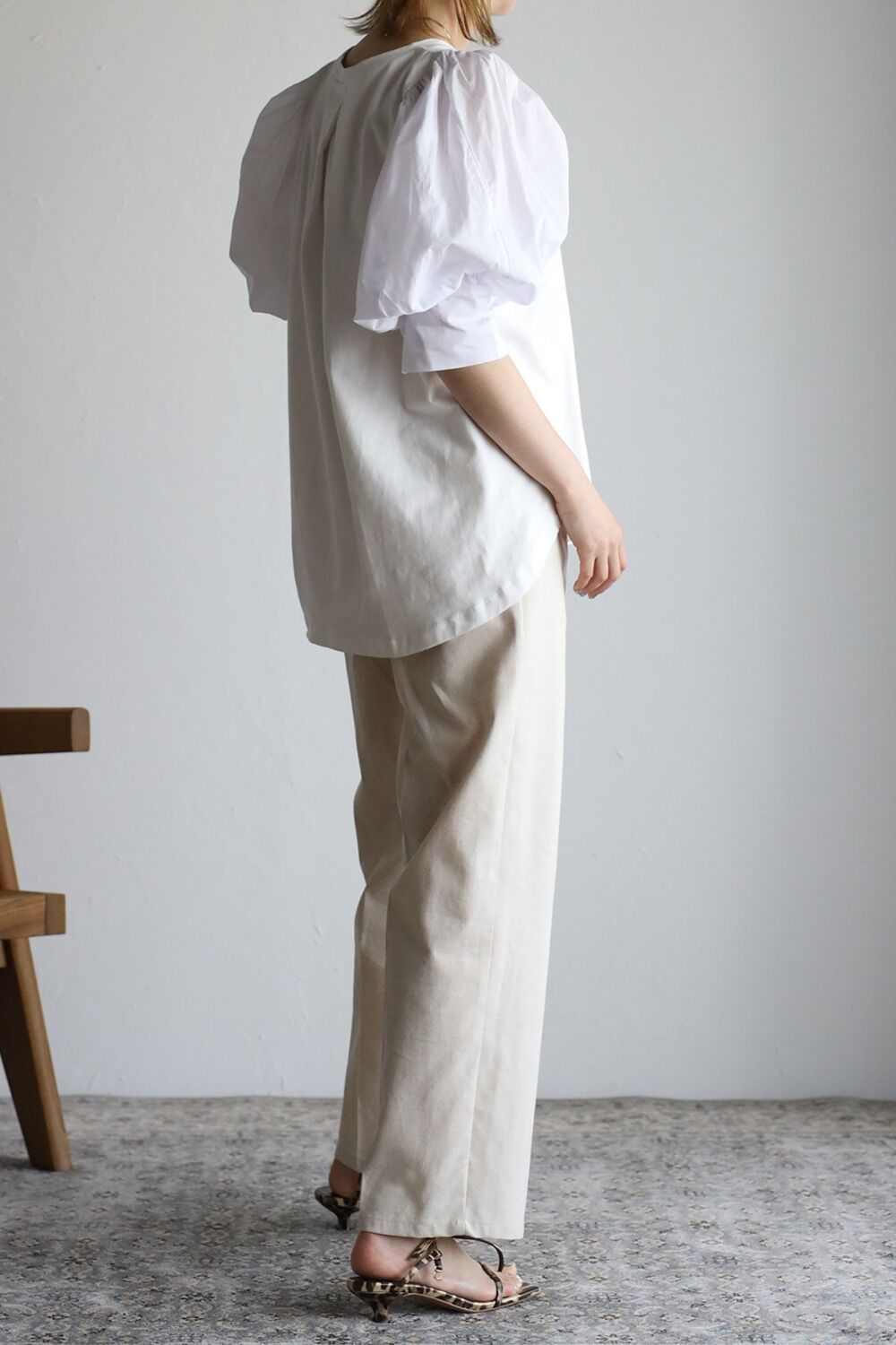 袖のふんわりとした異素材のディテールが目を惹くトップス。