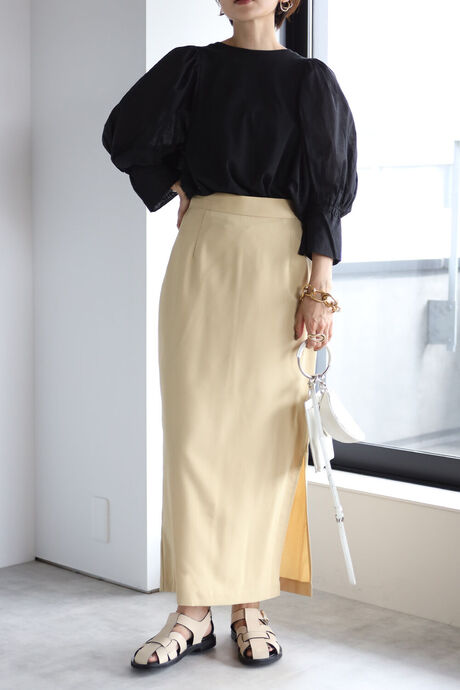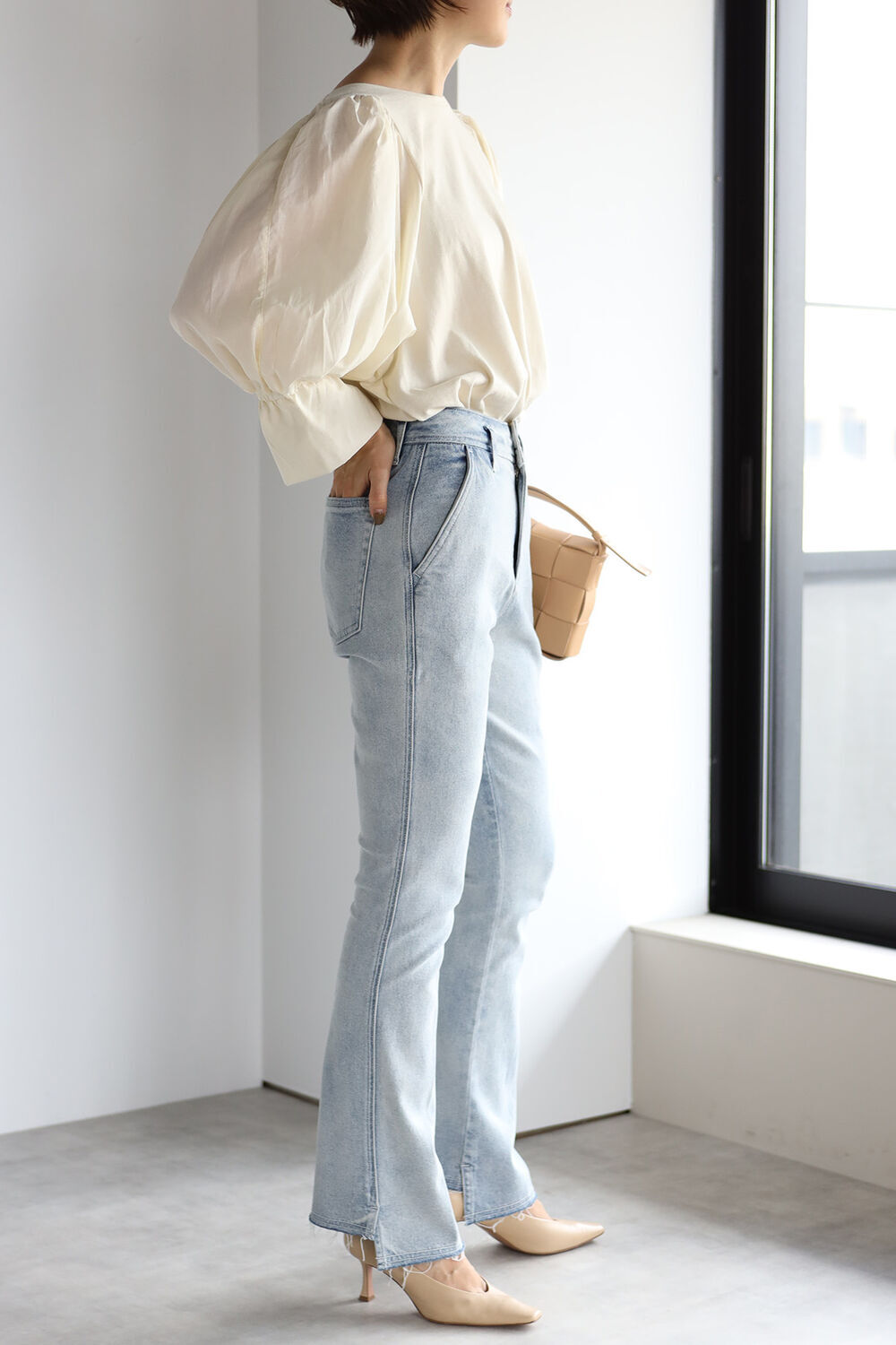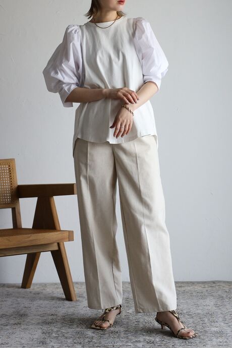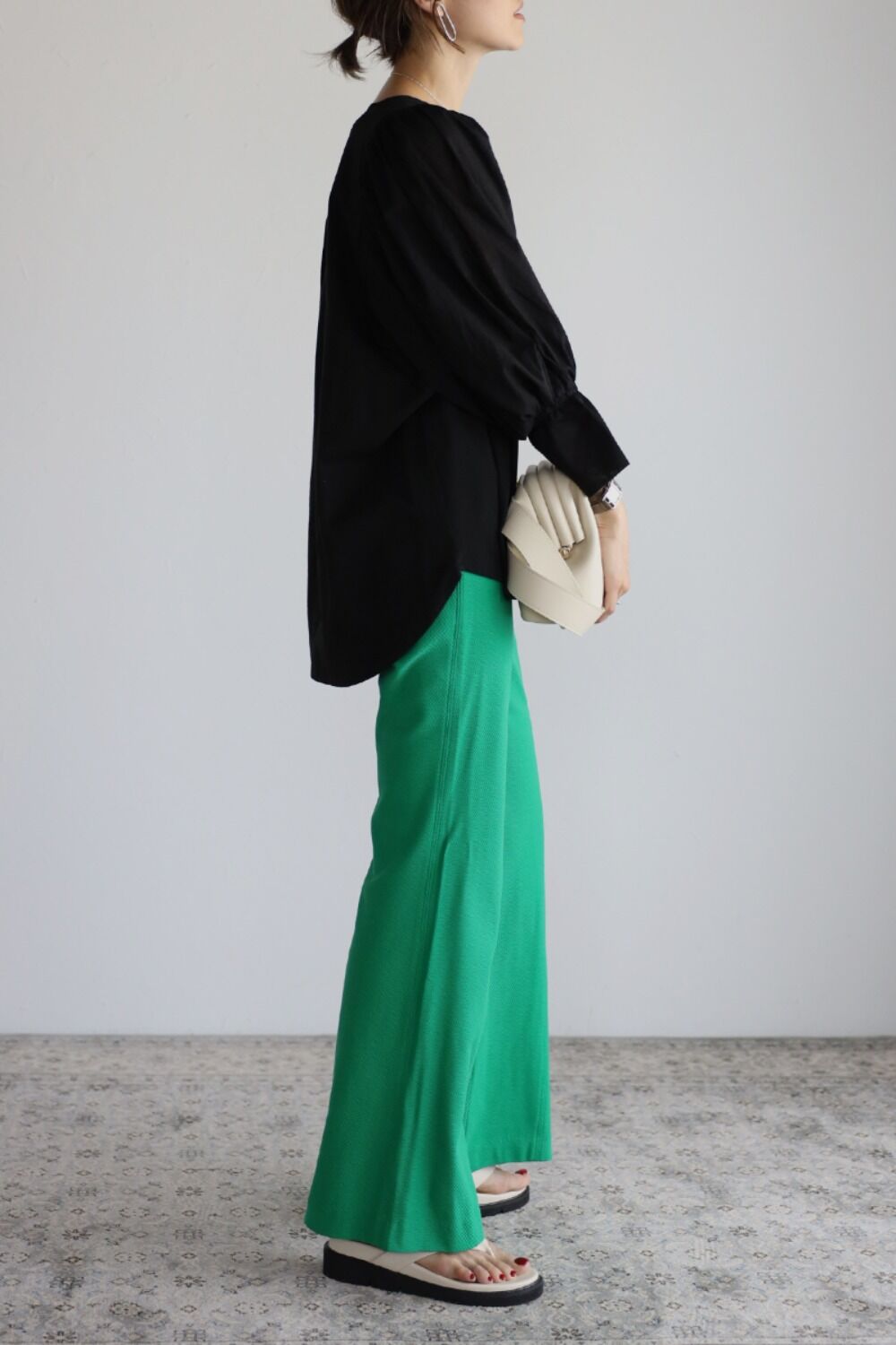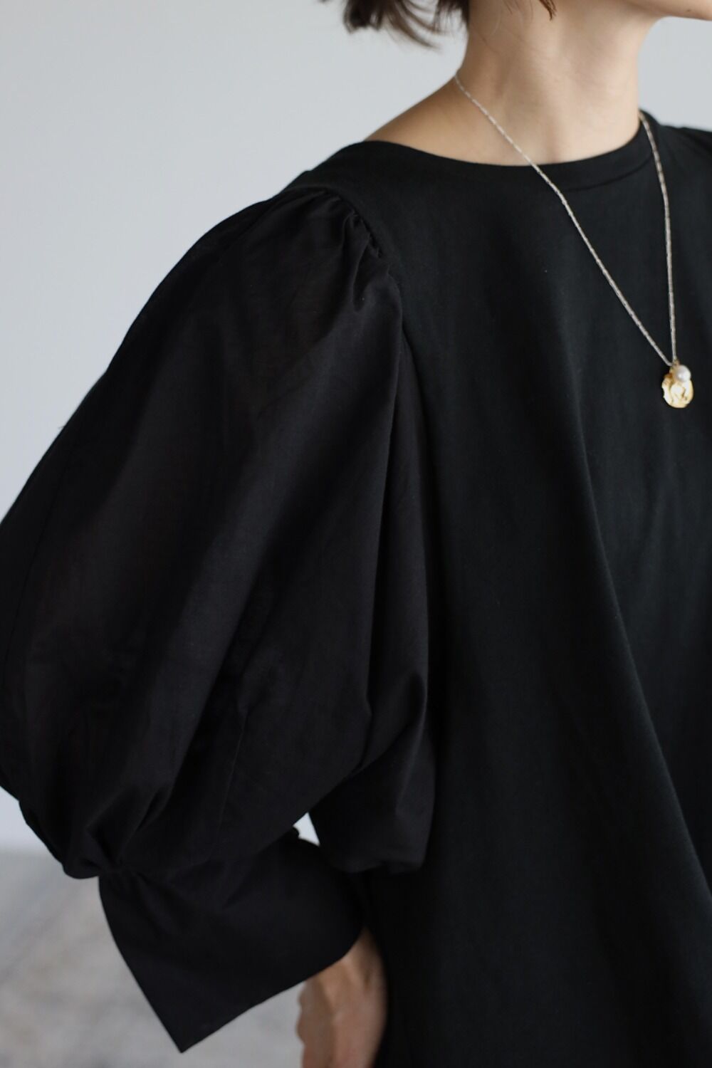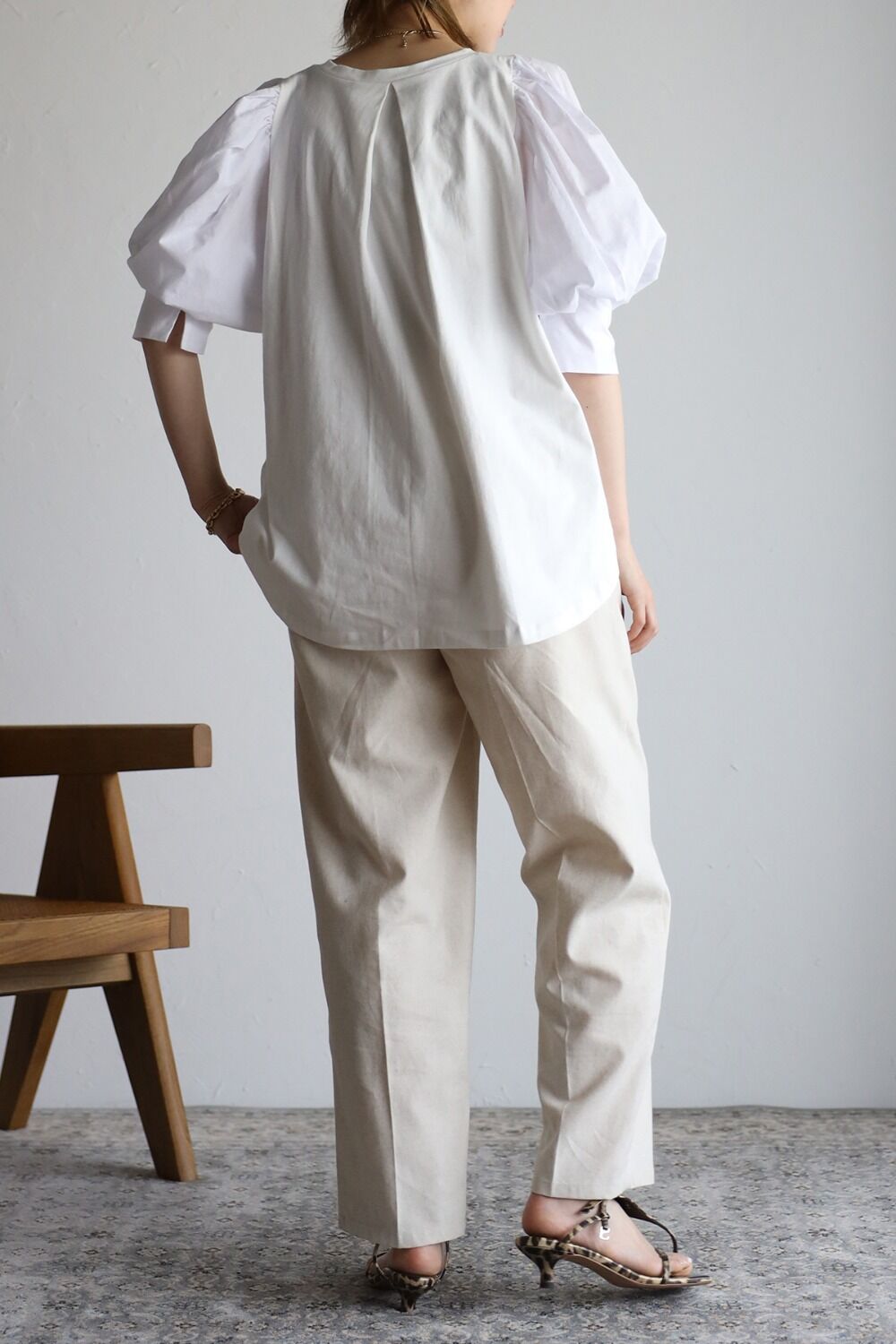 袖のふんわりとした異素材のディテールが目を惹くトップス。