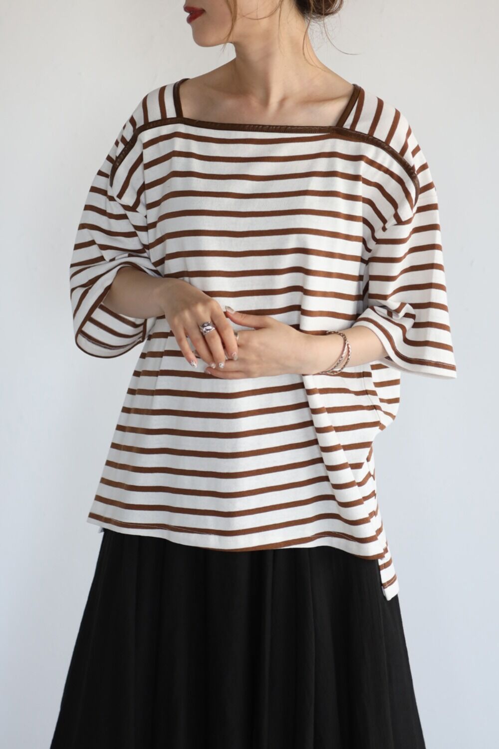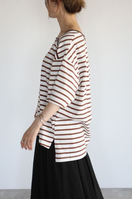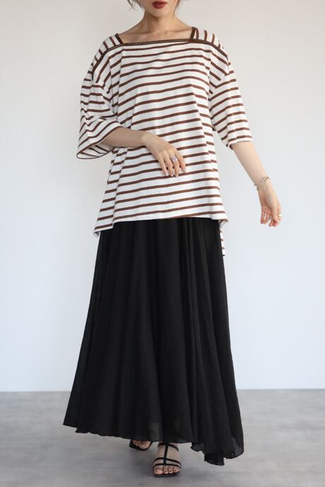 スクエアネックがキャッチーなボーダートップス。