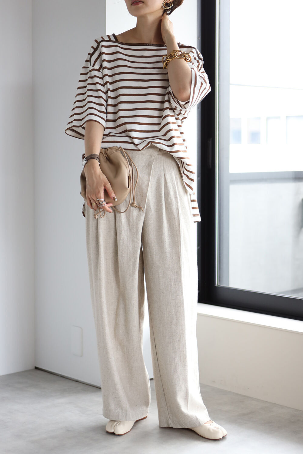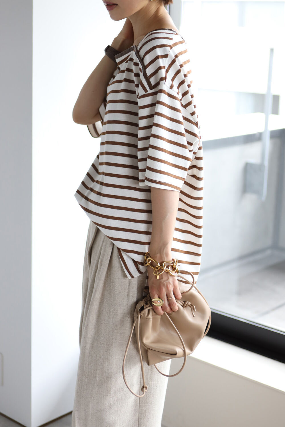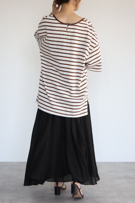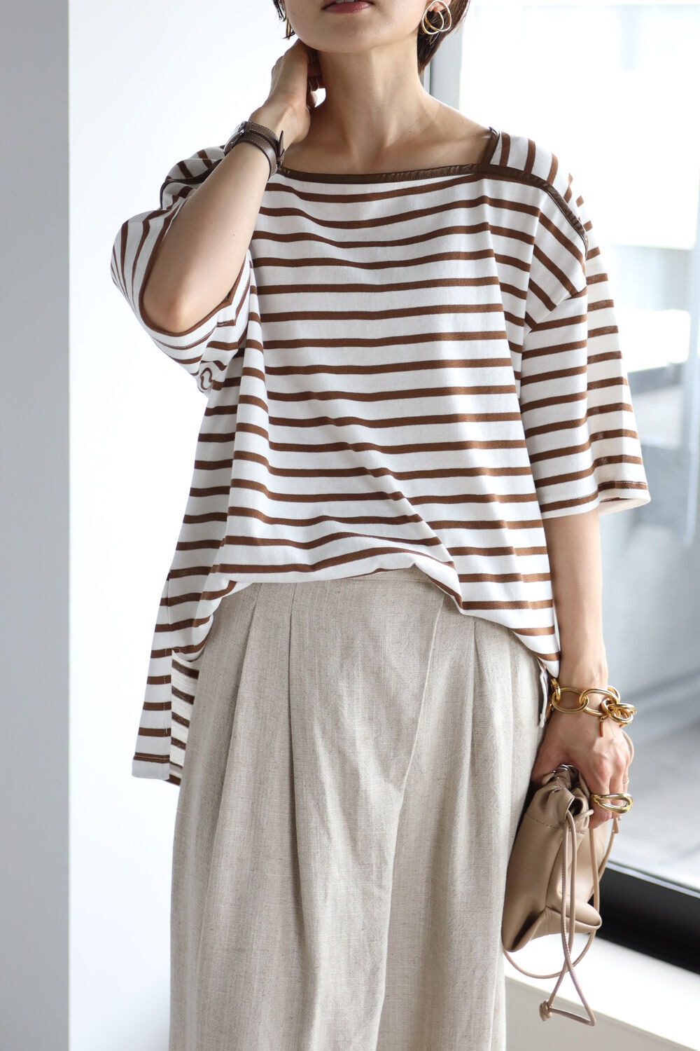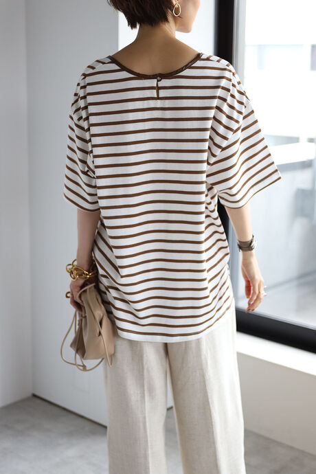 トレンドのブラウンのボーダーは大人っぽく合わせられる配色。