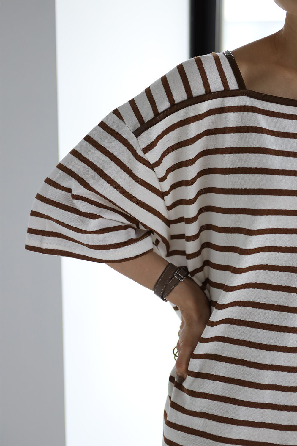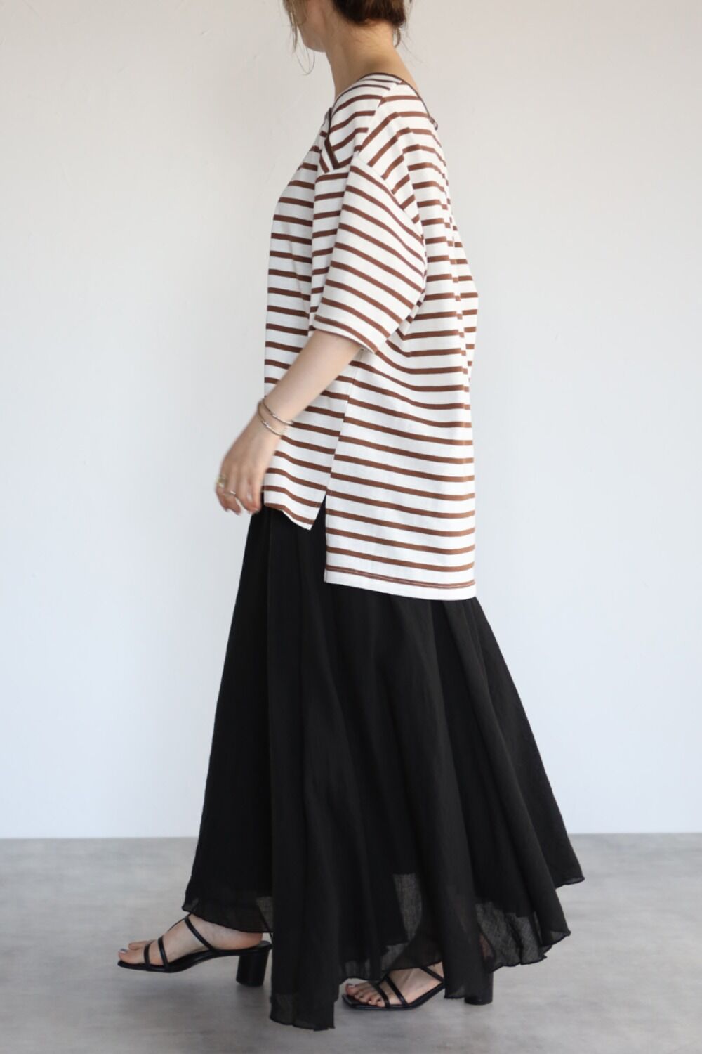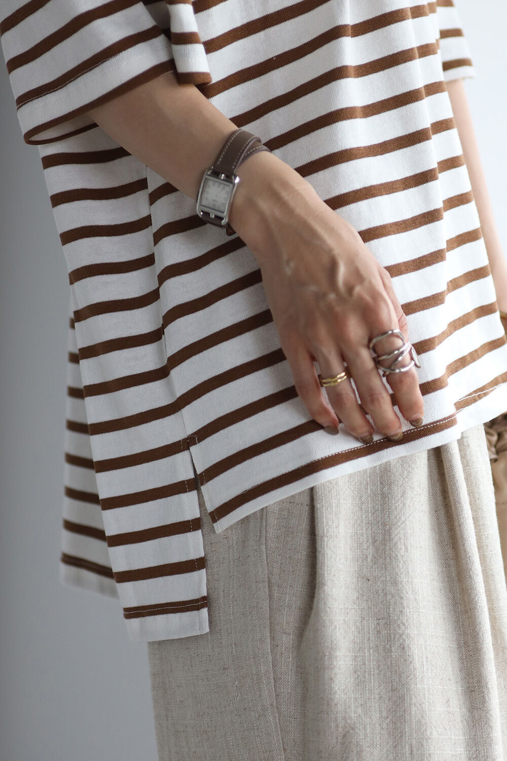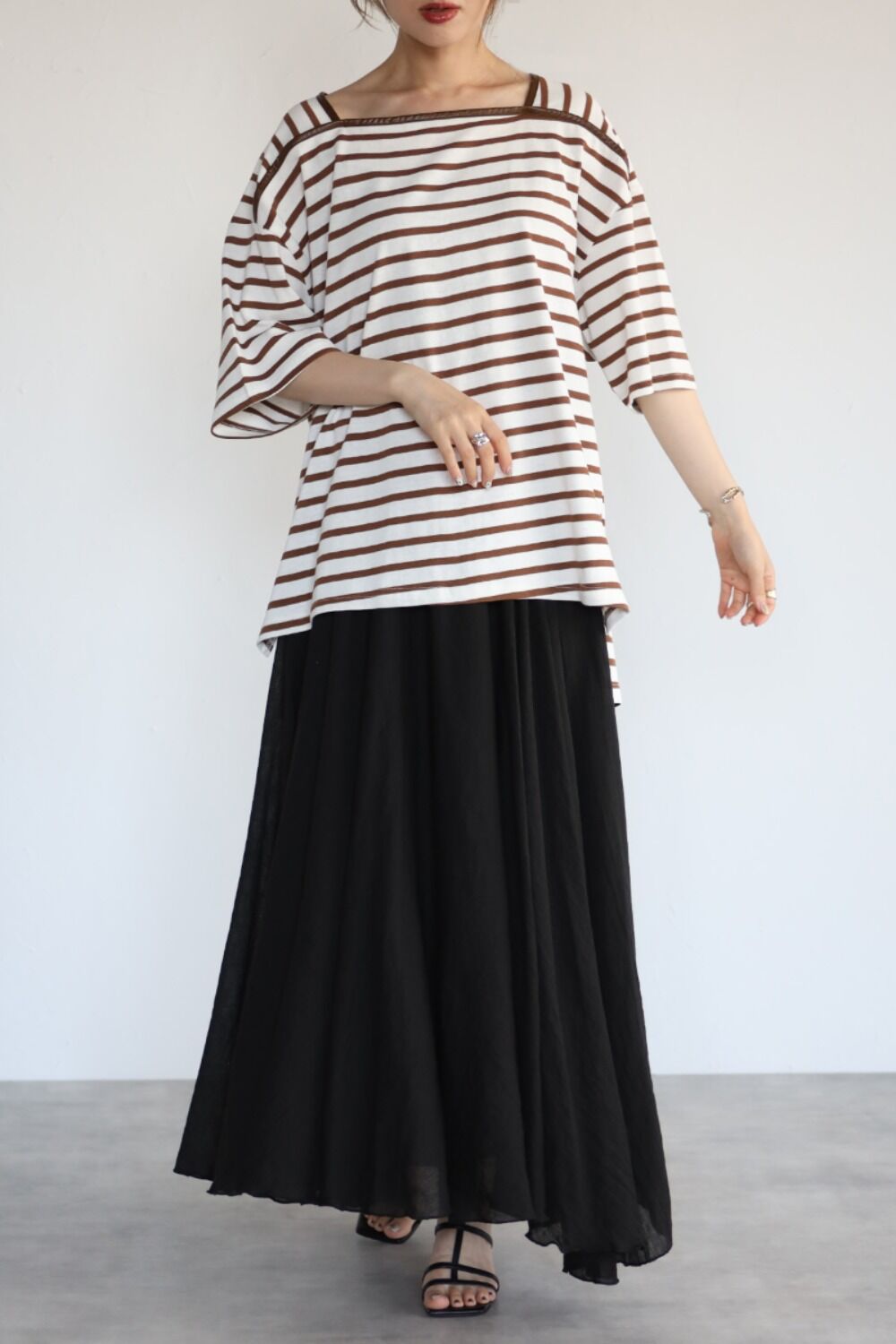 トレンドのブラウンのボーダーは大人っぽく合わせられる配色。