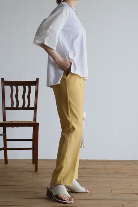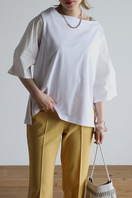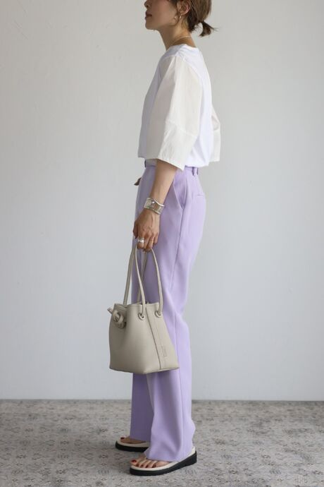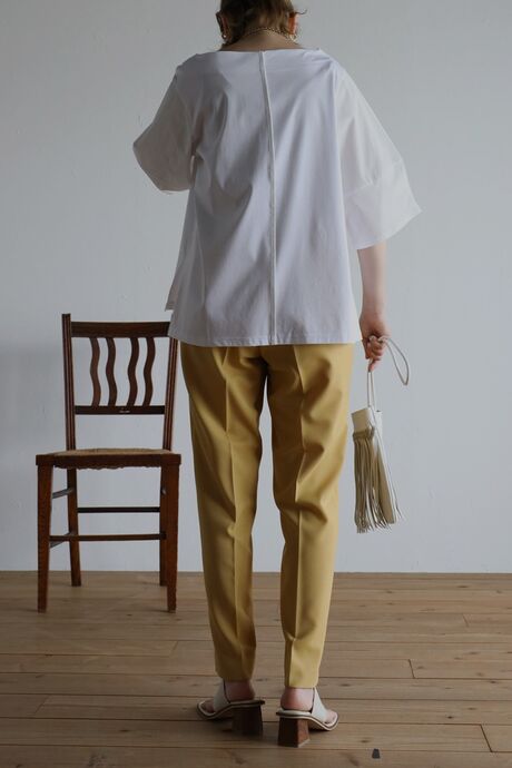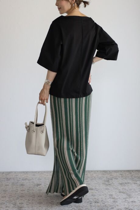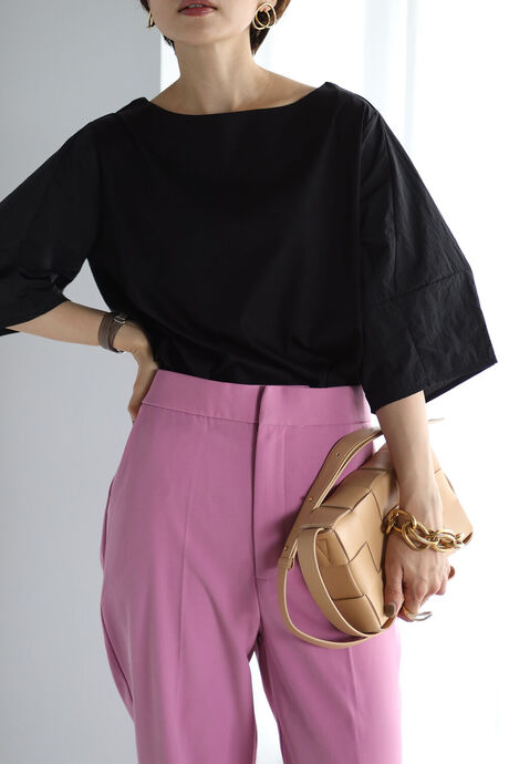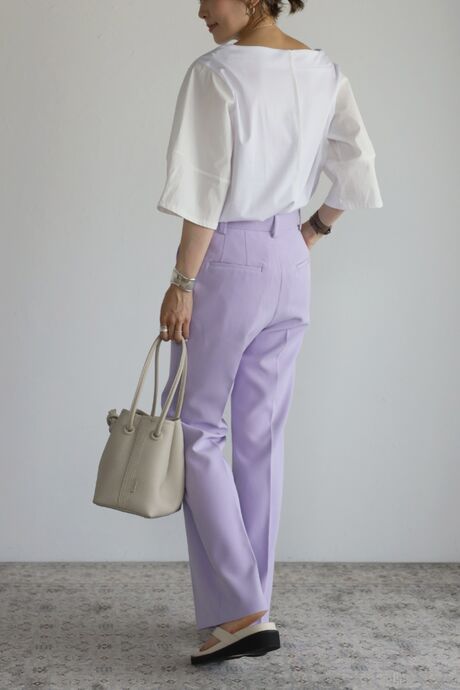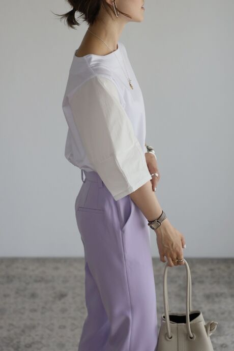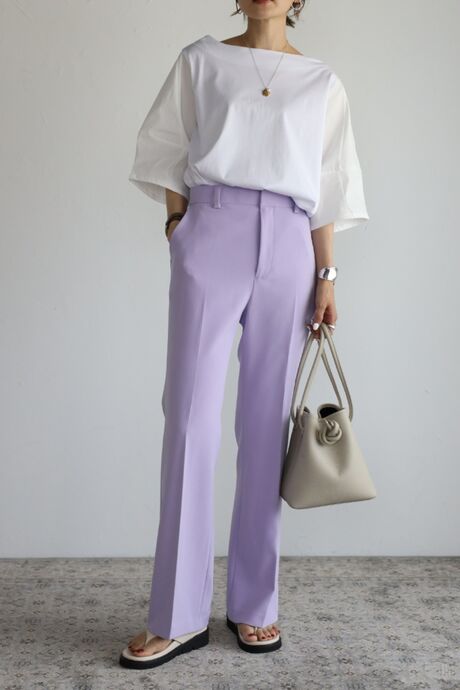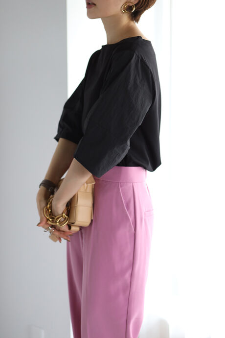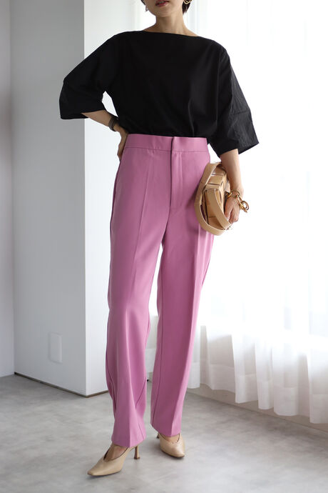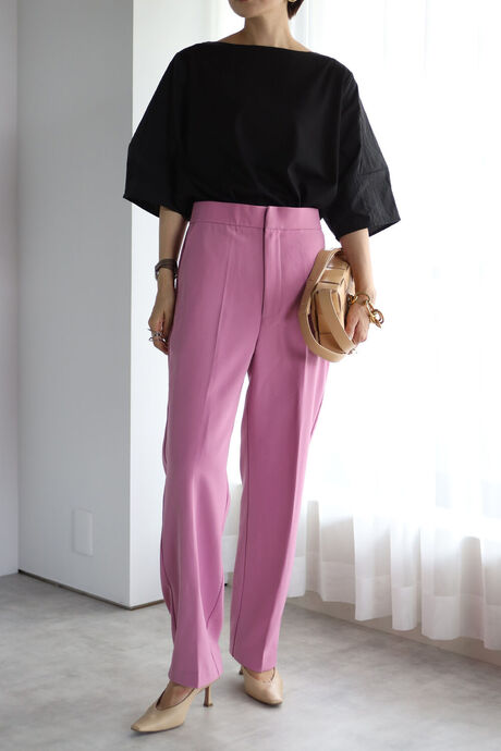 シンプルデザインなので、カラーボトムや、デザイン性のあるボトムとも相性◎