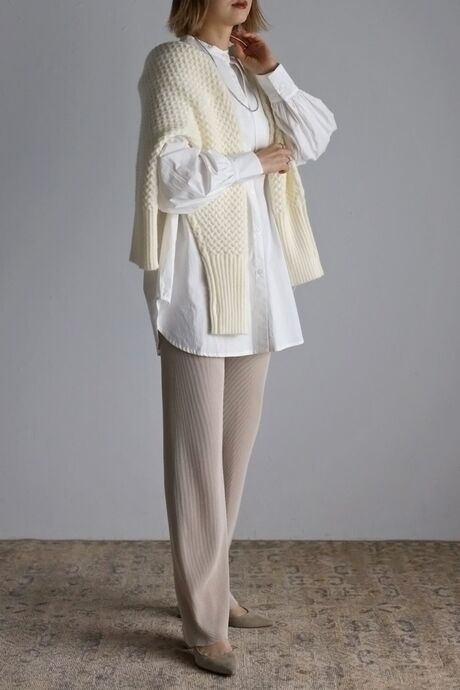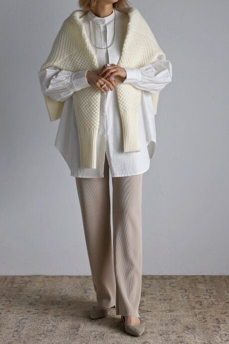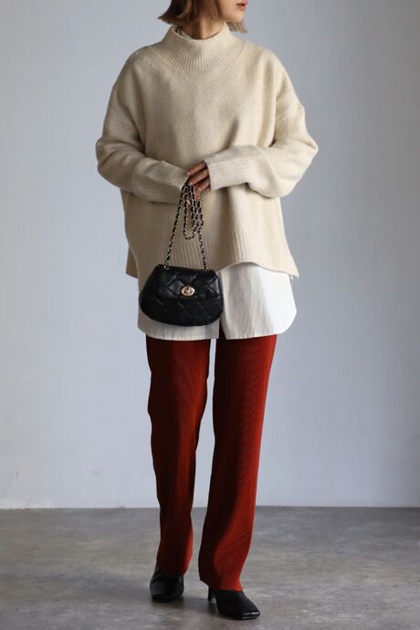 ロングシャツ×パンツリブで縦長効果があり、スタイルアップが期待できるスタイリングになります。