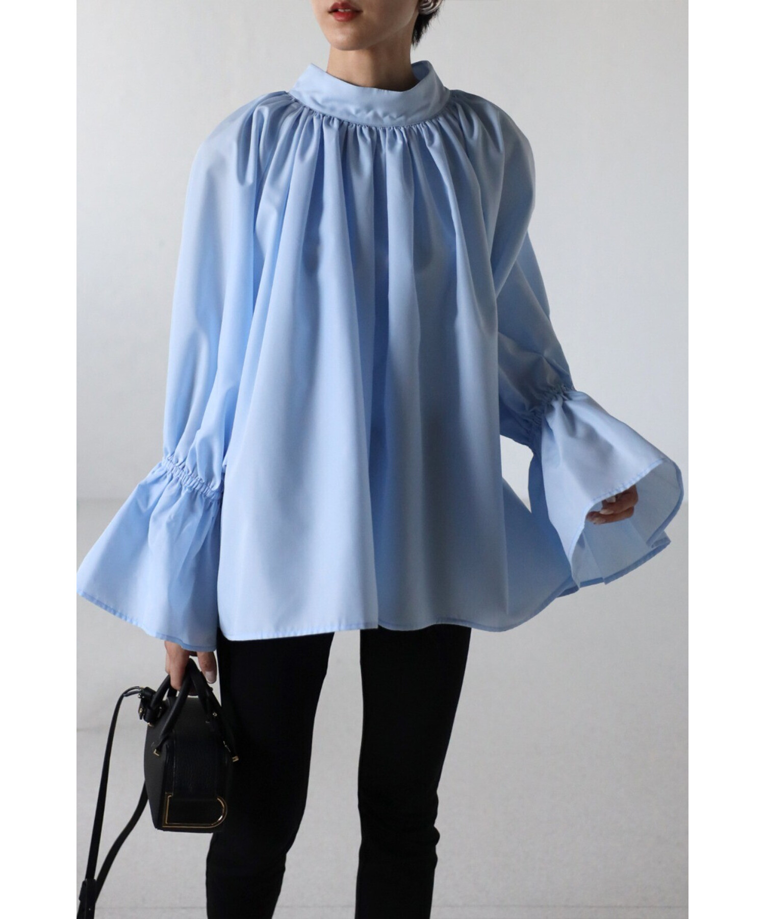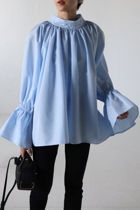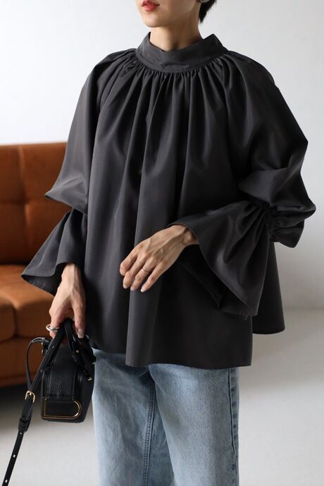 ネックギャザーから裾に広がるボリュームシルエットが華やかなギャザーブラウス。