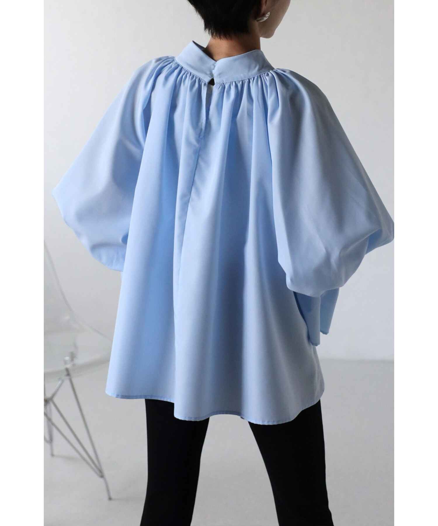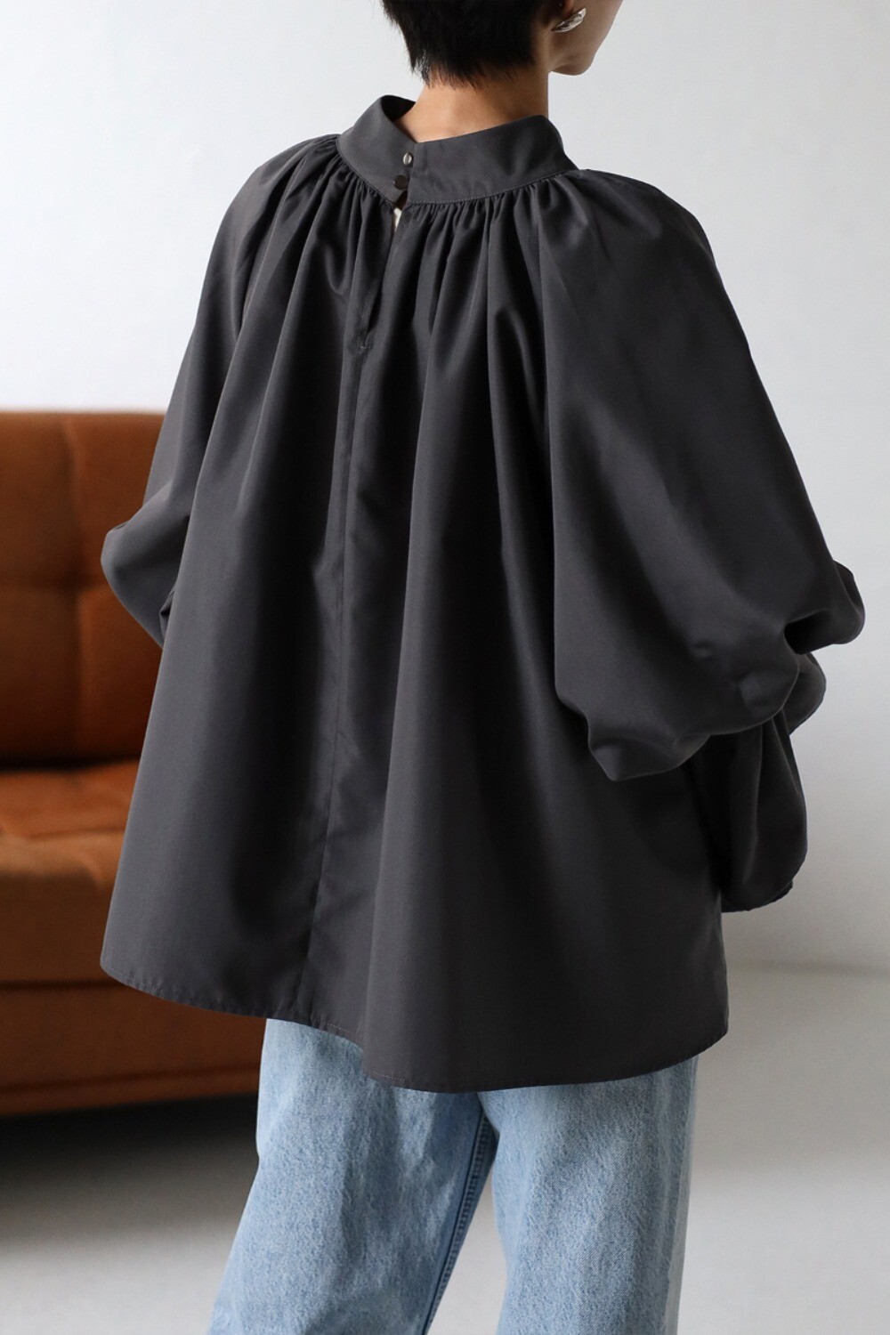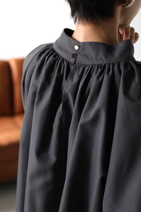 バックネックは涙開きデザインで、たっぷりギャザーなので体のラインを拾わずリラクシーな着心地です。