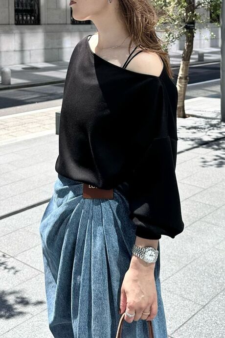 程よくデコルテが見えるネックラインで、オフショルはもちろん、ワンショルで着ても可愛いデザイン。