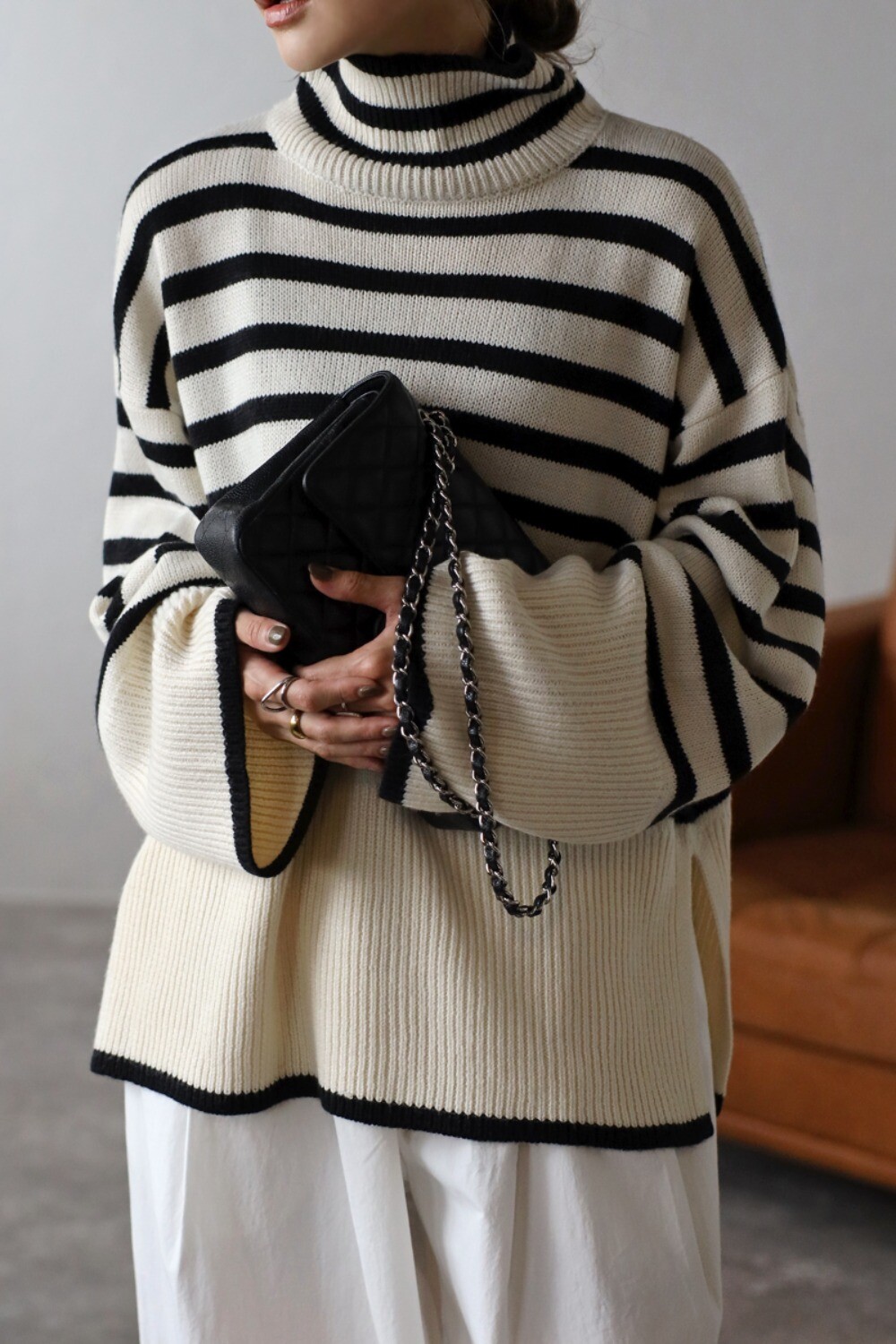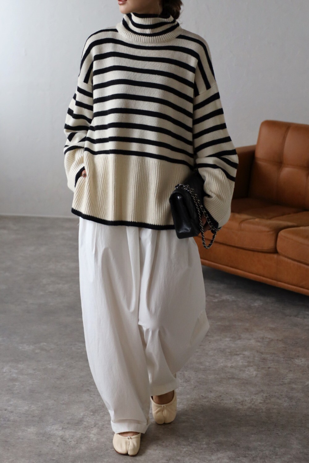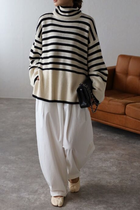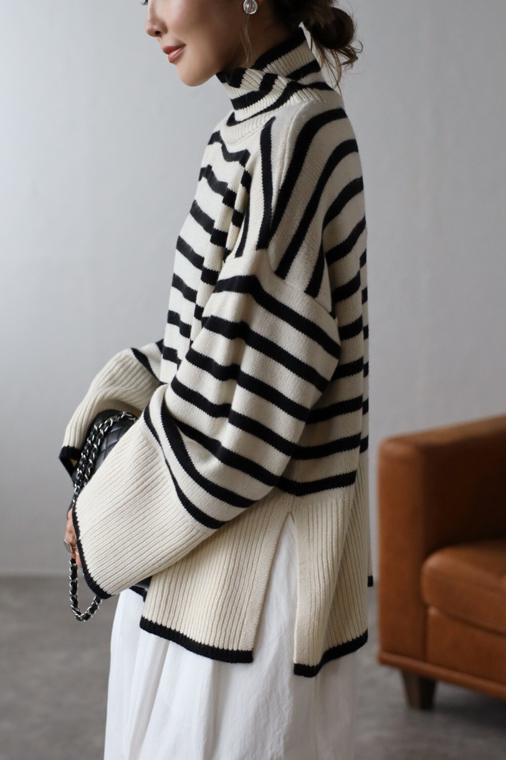 パネルボーダーが大人っぽい◎ルーズに着映えるタートルニット