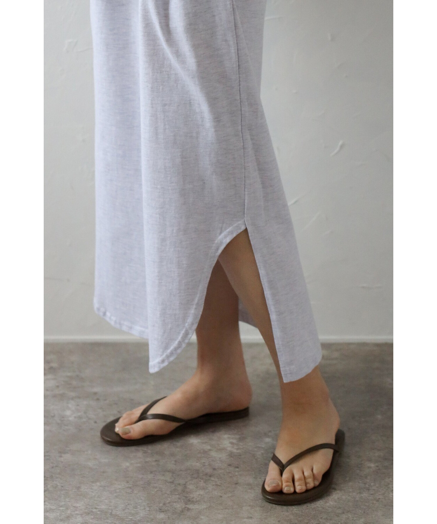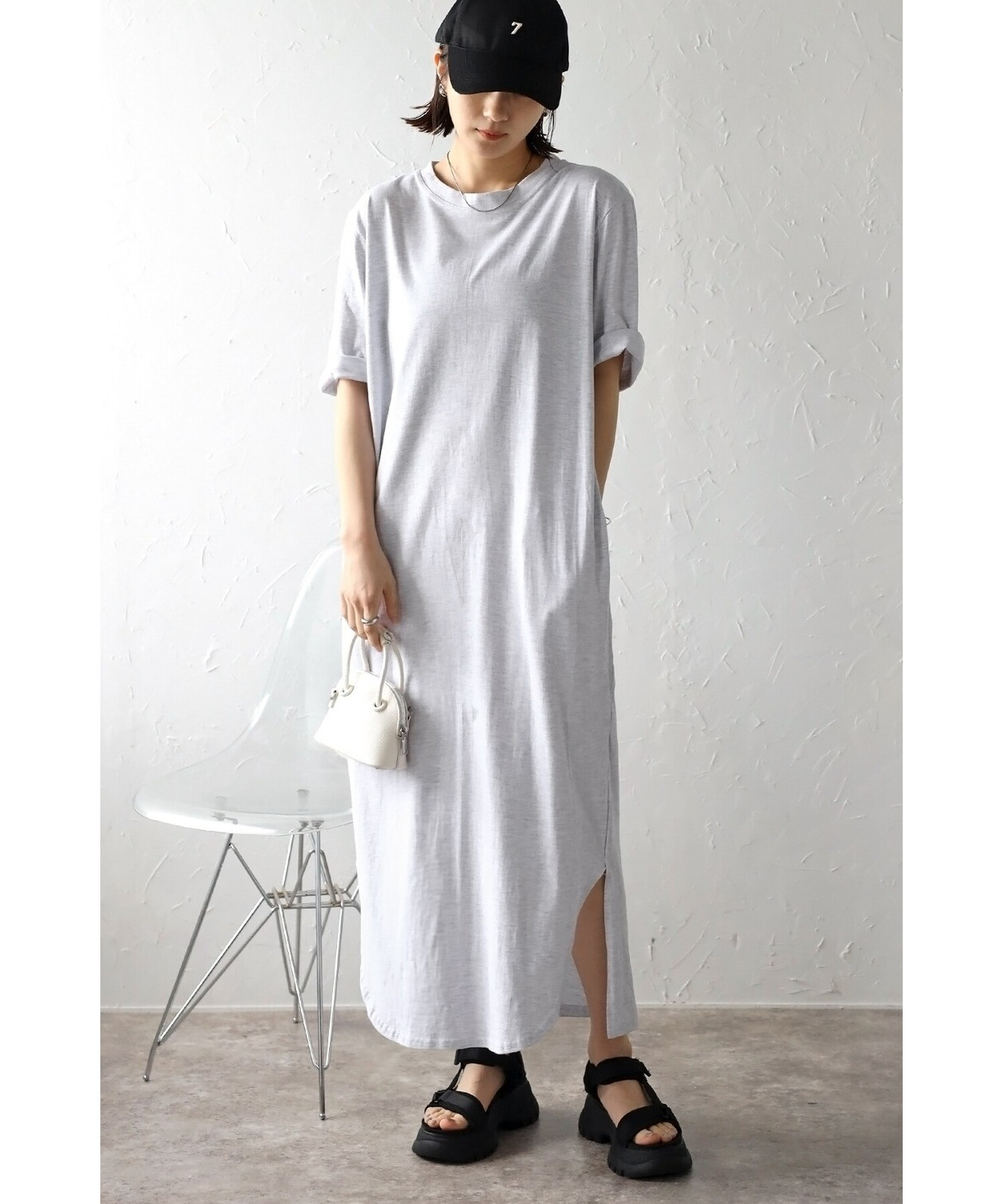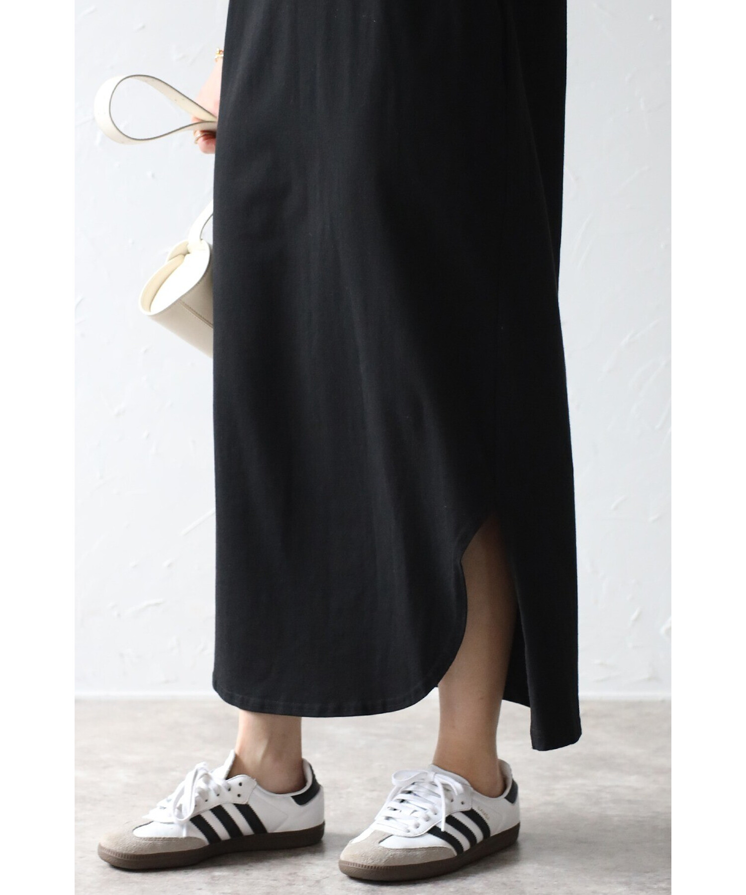 サイドスリットの入った、前後でカットの違う裾デザインがこなれ感を演出。