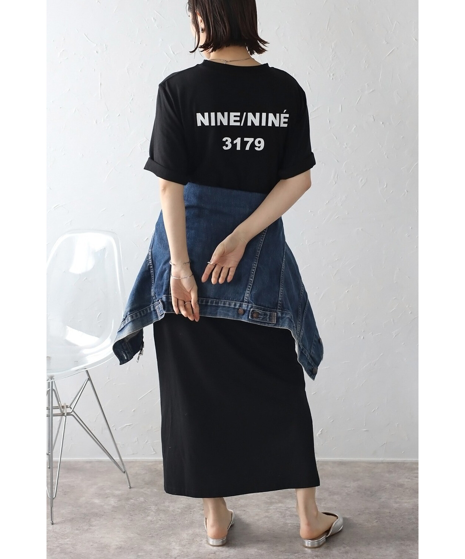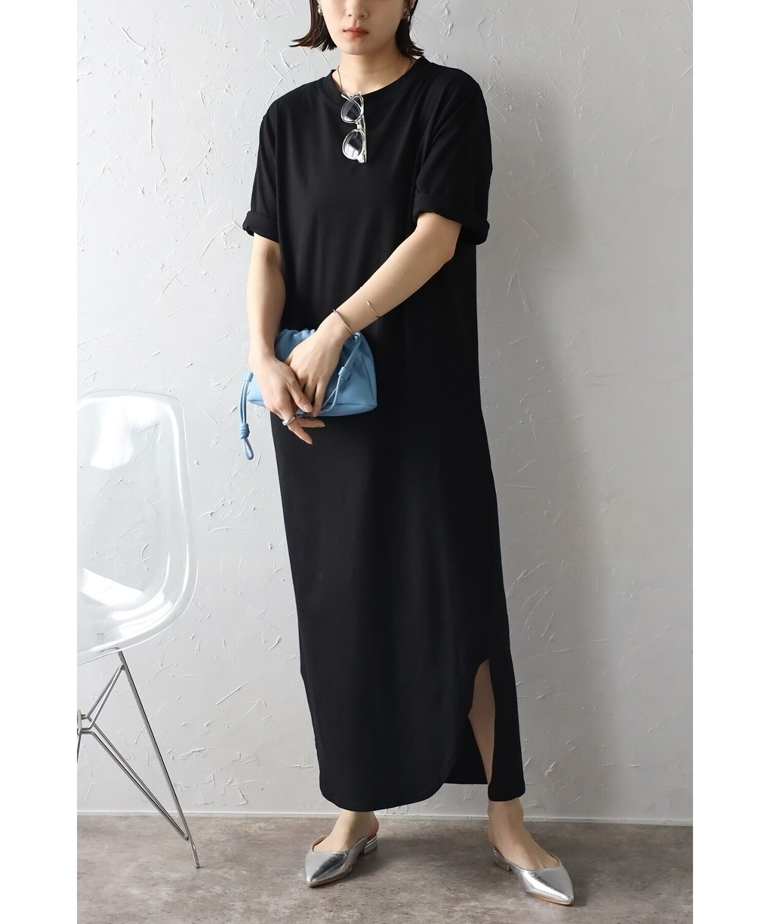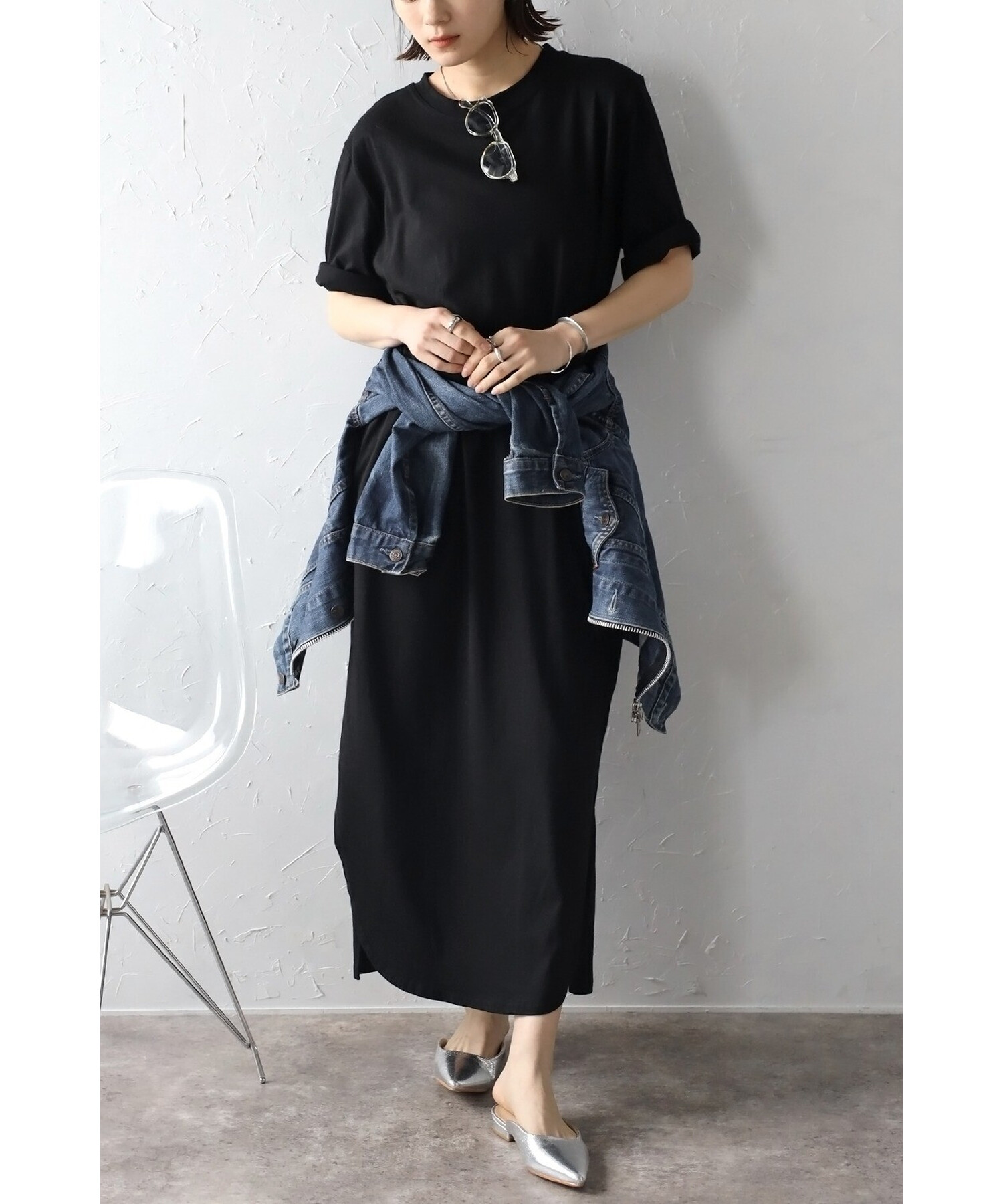サイドスリットの入った、前後でカットの違う裾デザインがこなれ感を演出。