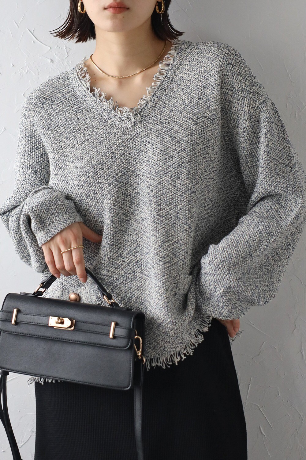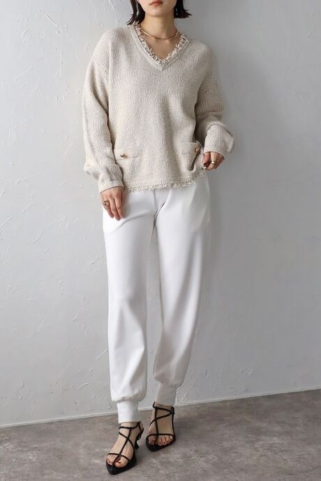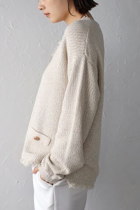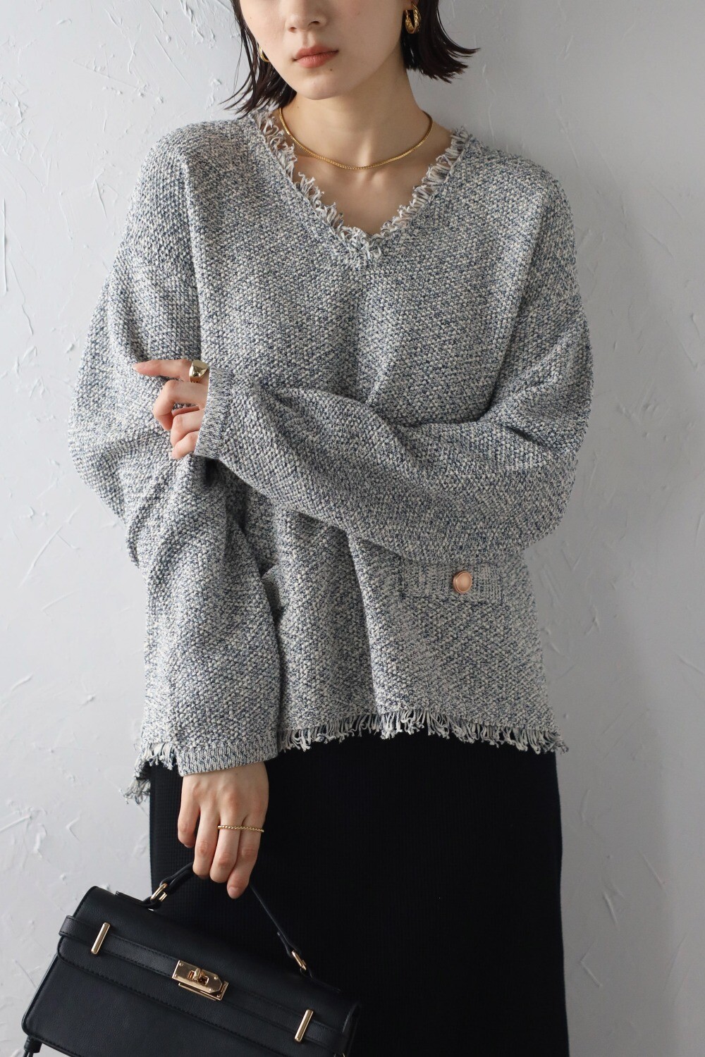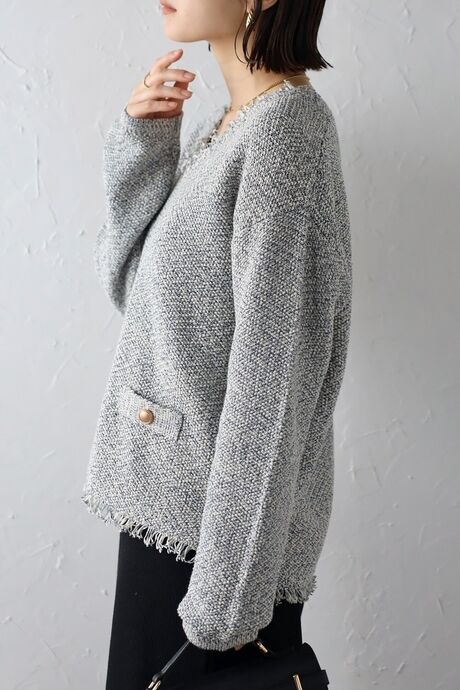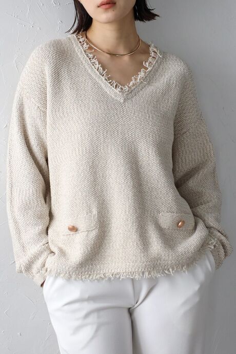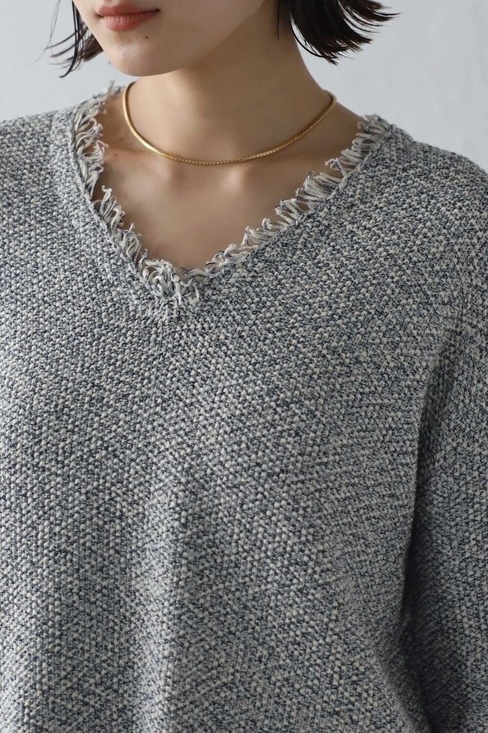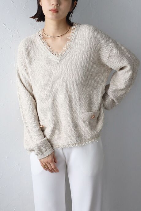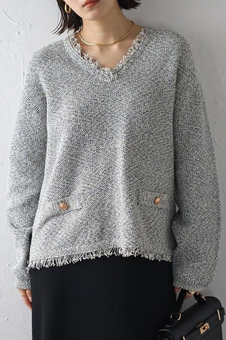 ドライタッチなサマーツイードで大人シックなスタイルに。Vネックプルオーバー