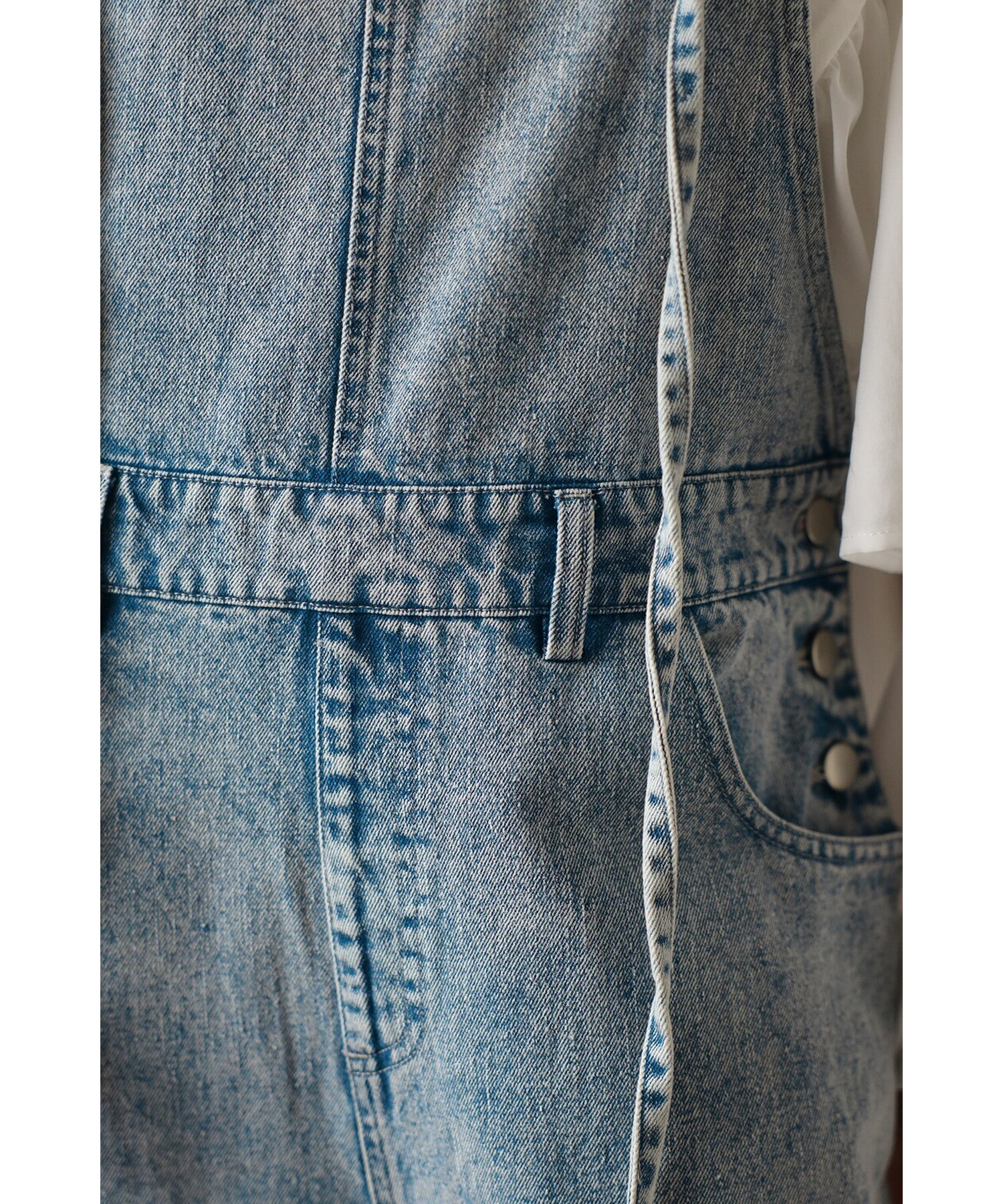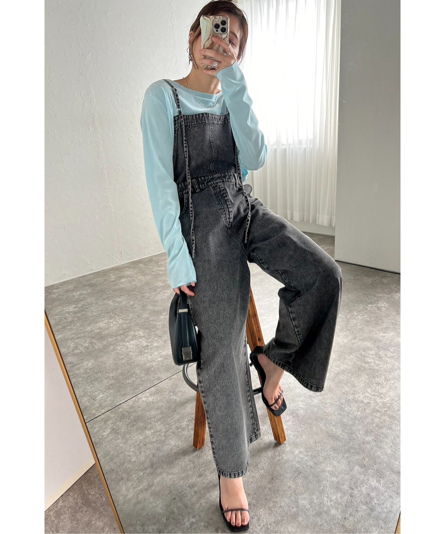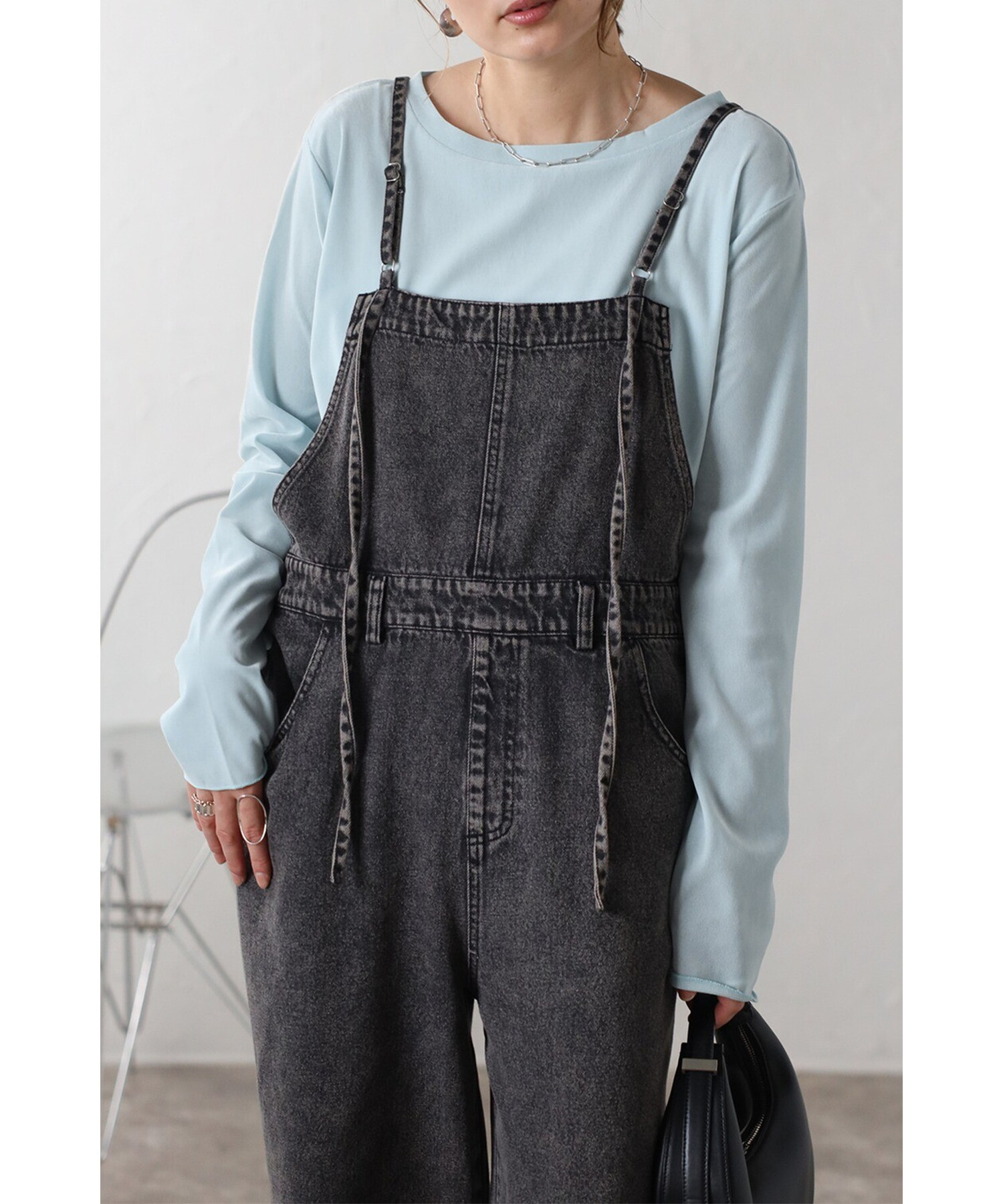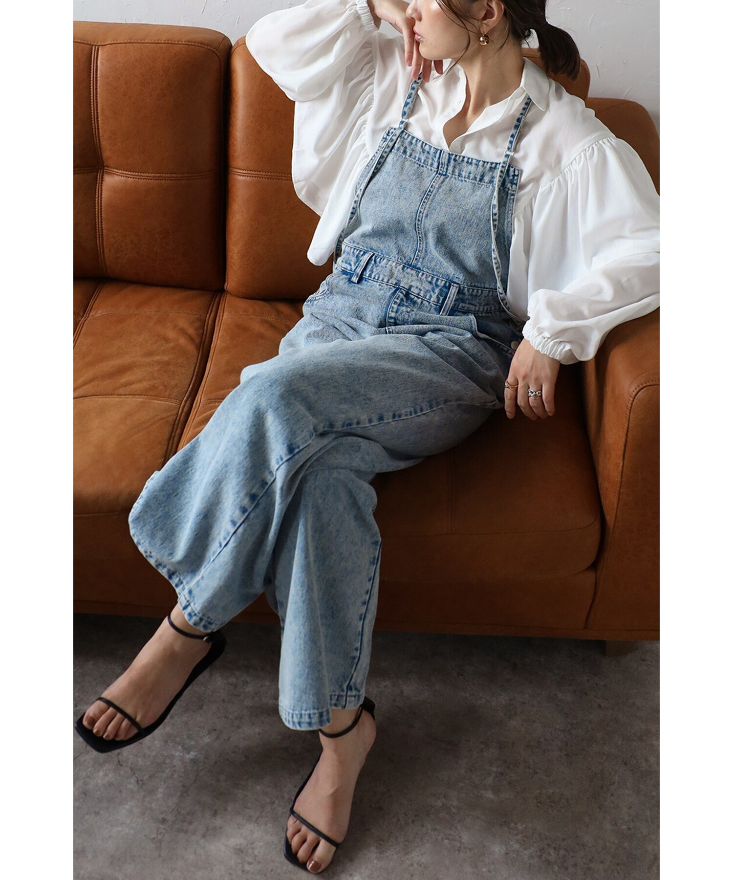 デニム素材を使用したオーバーオールは、カジュアルな装いにぴったり。