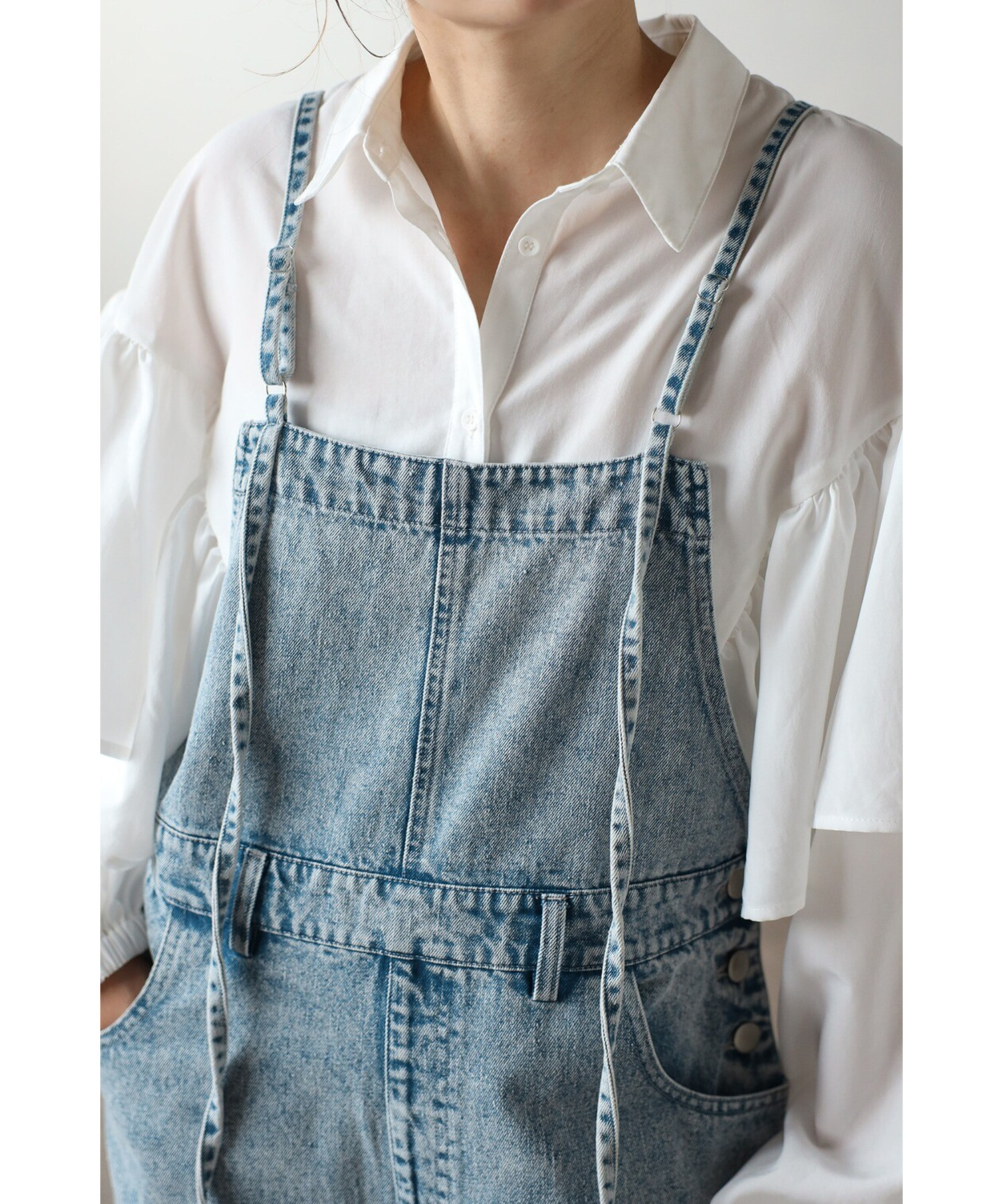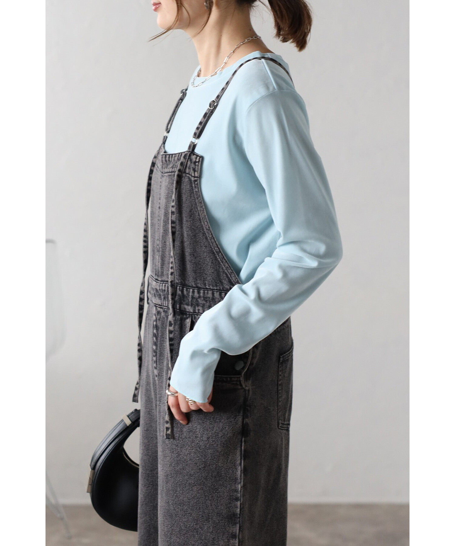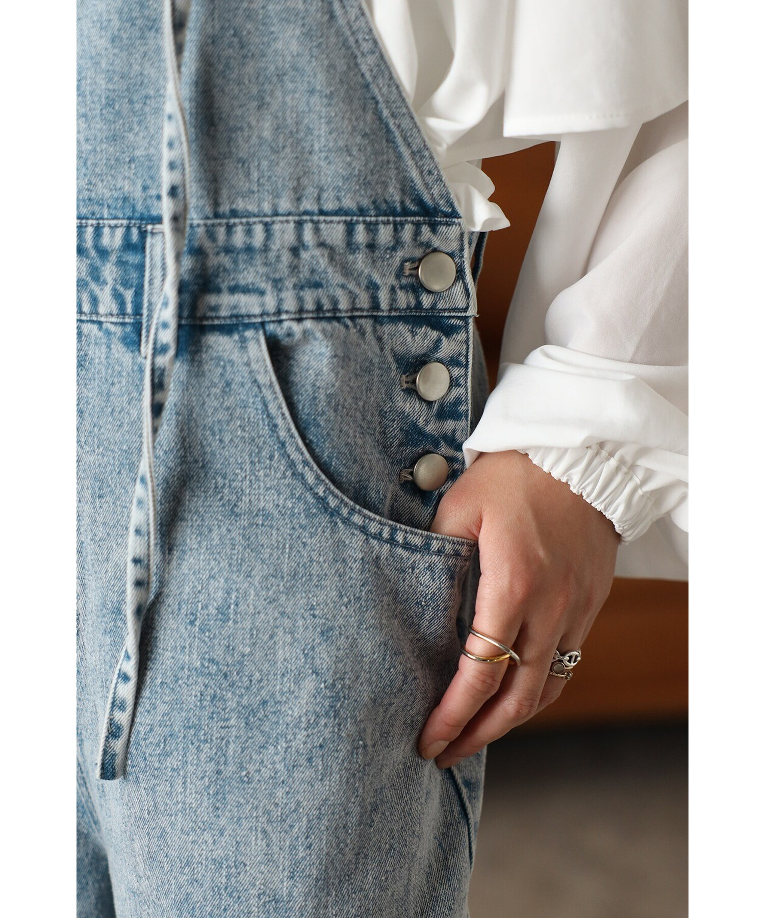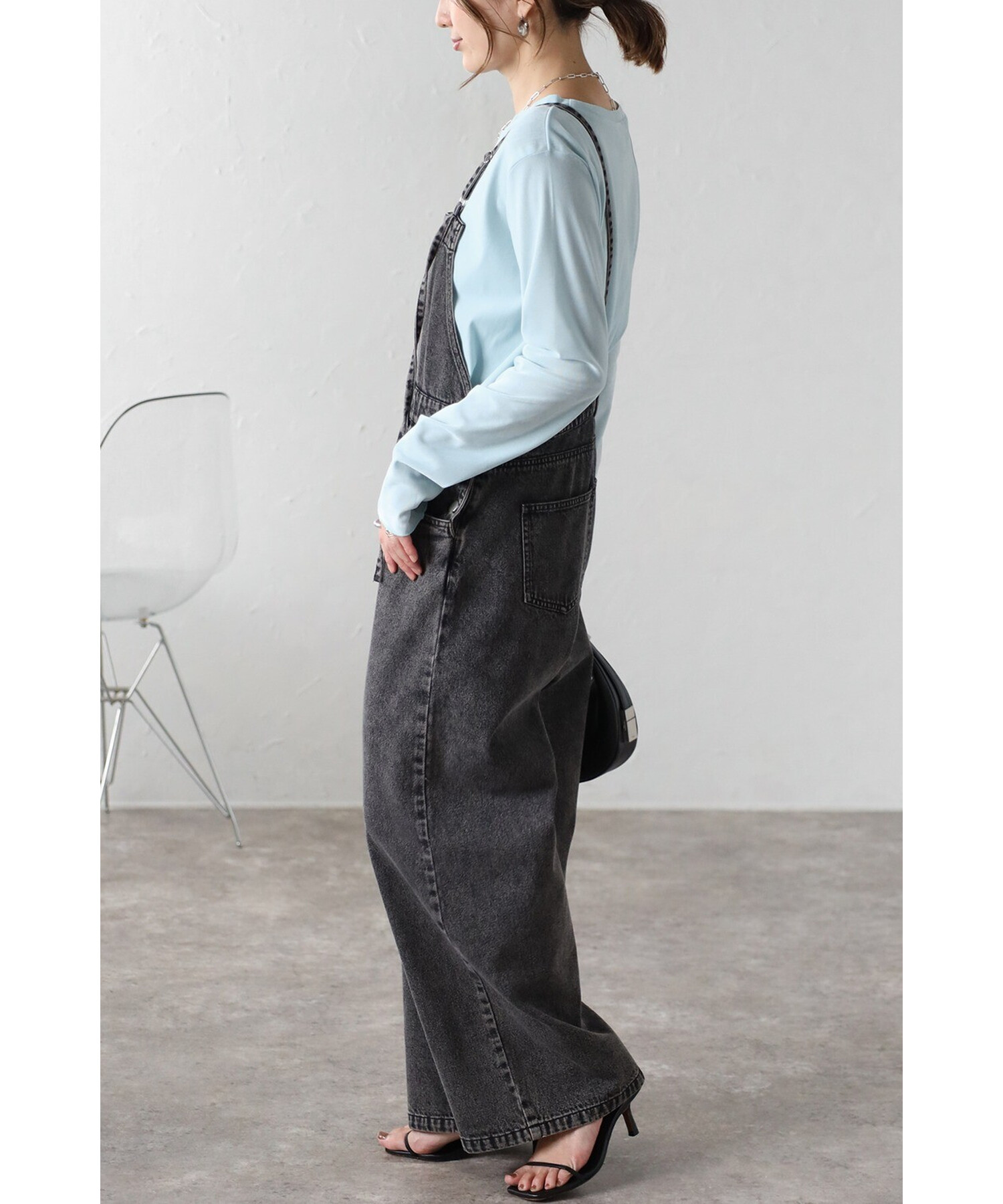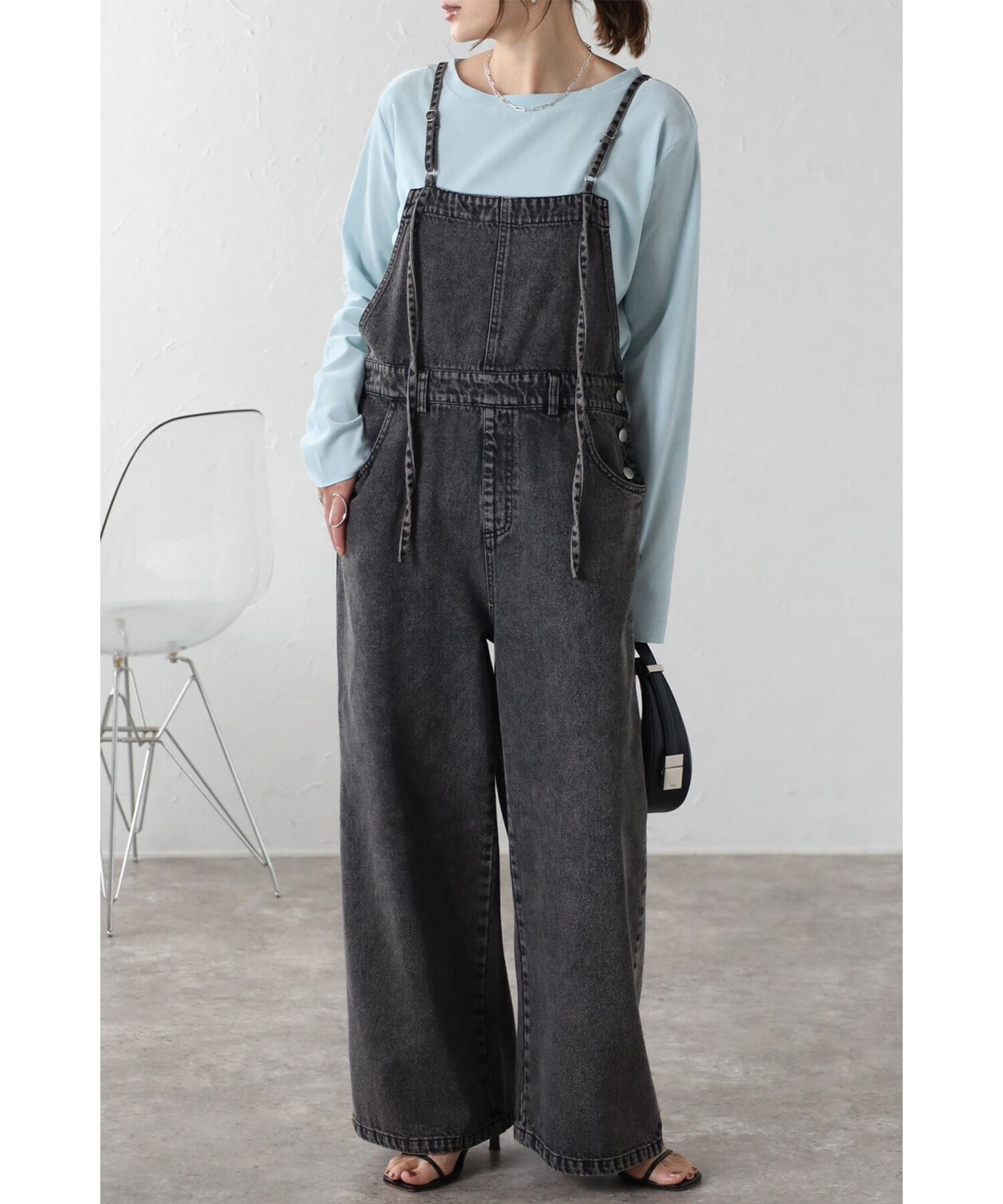 デニム素材を使用したオーバーオールは、カジュアルな装いにぴったり。