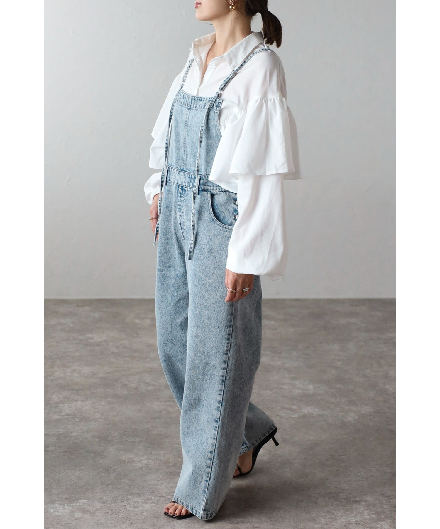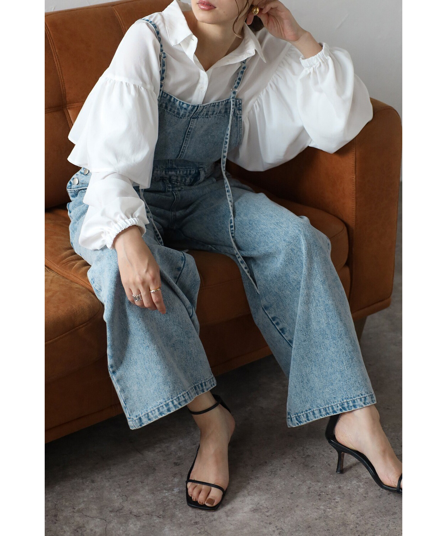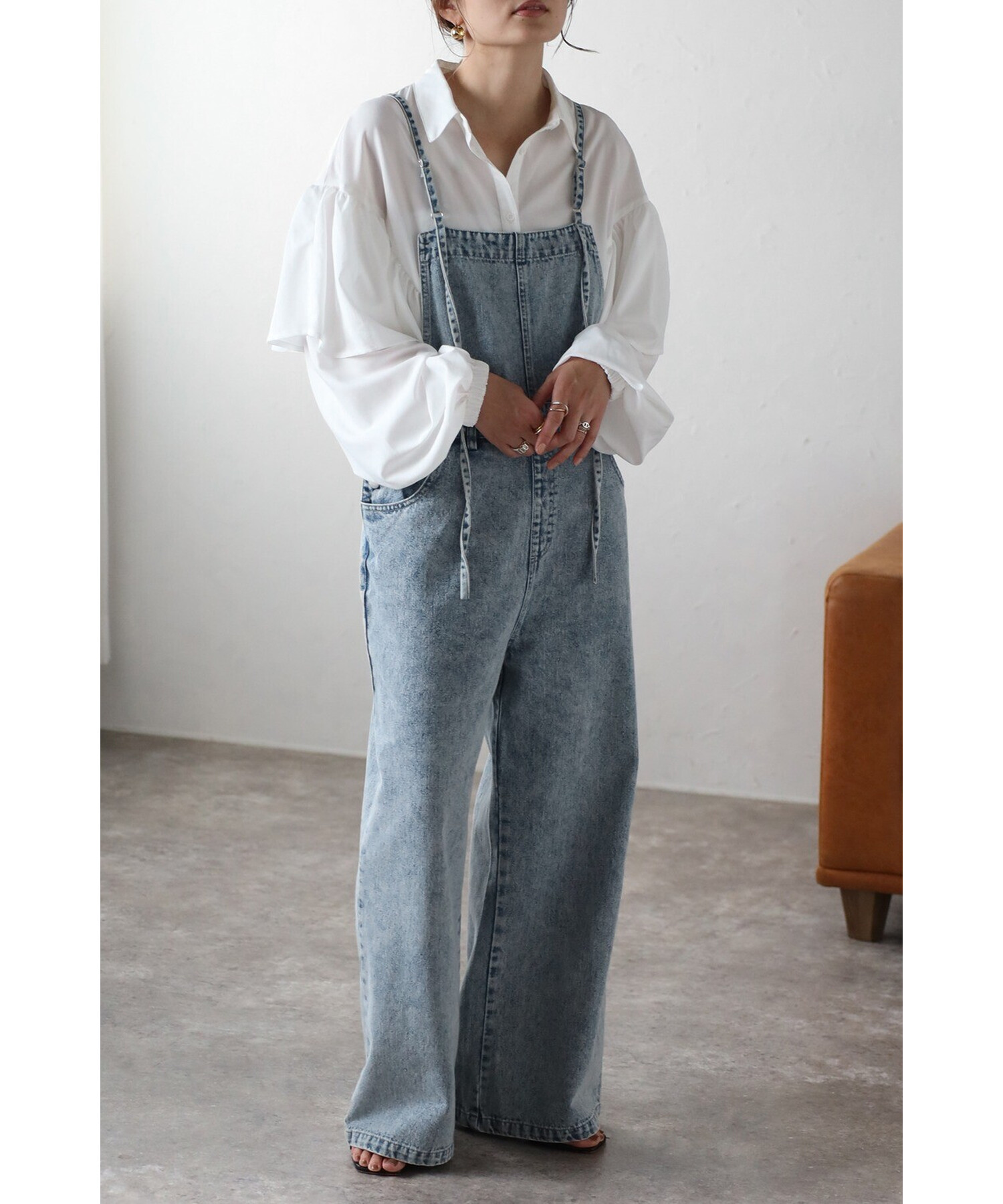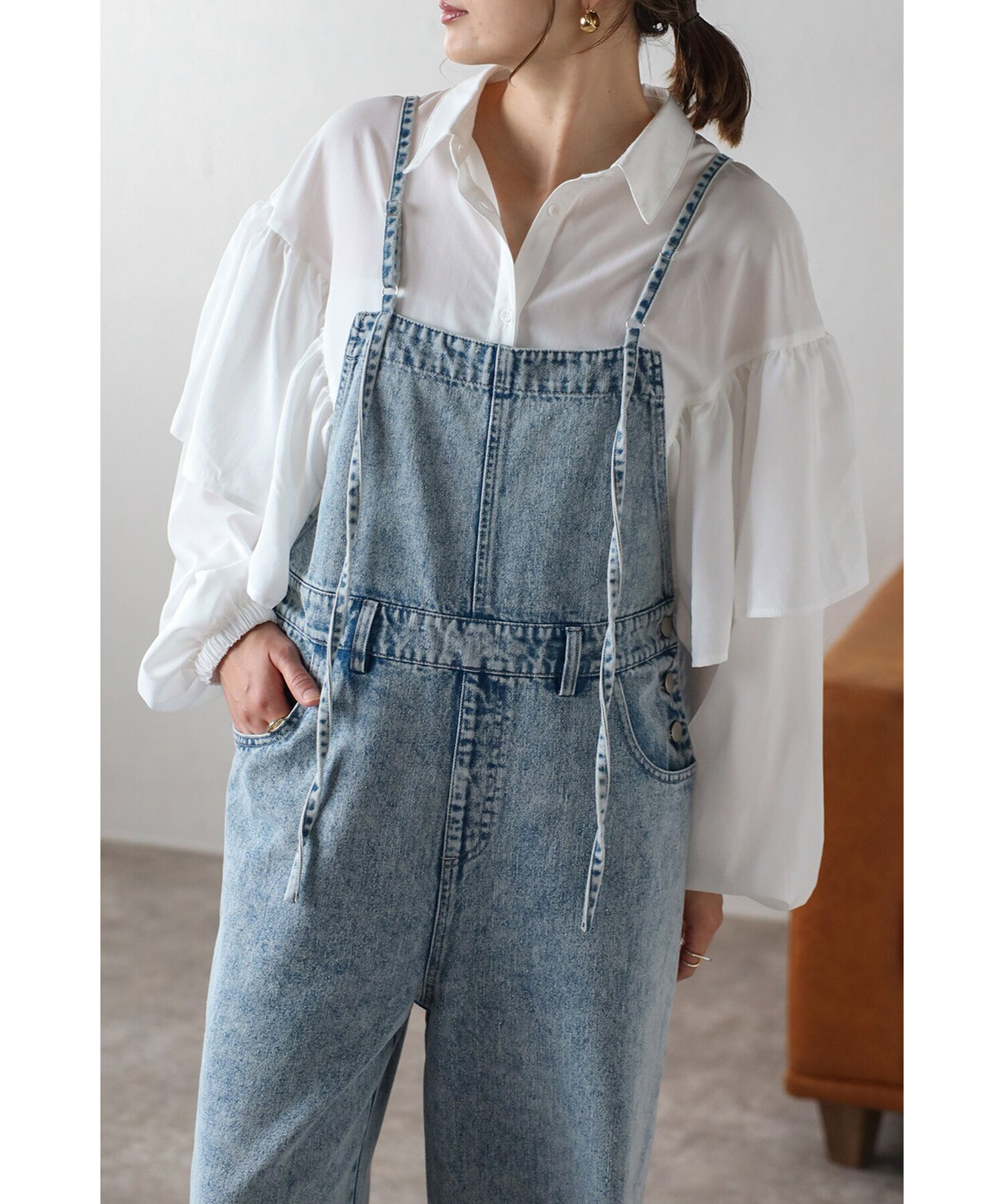 デニム素材を使用したオーバーオールは、カジュアルな装いにぴったり。