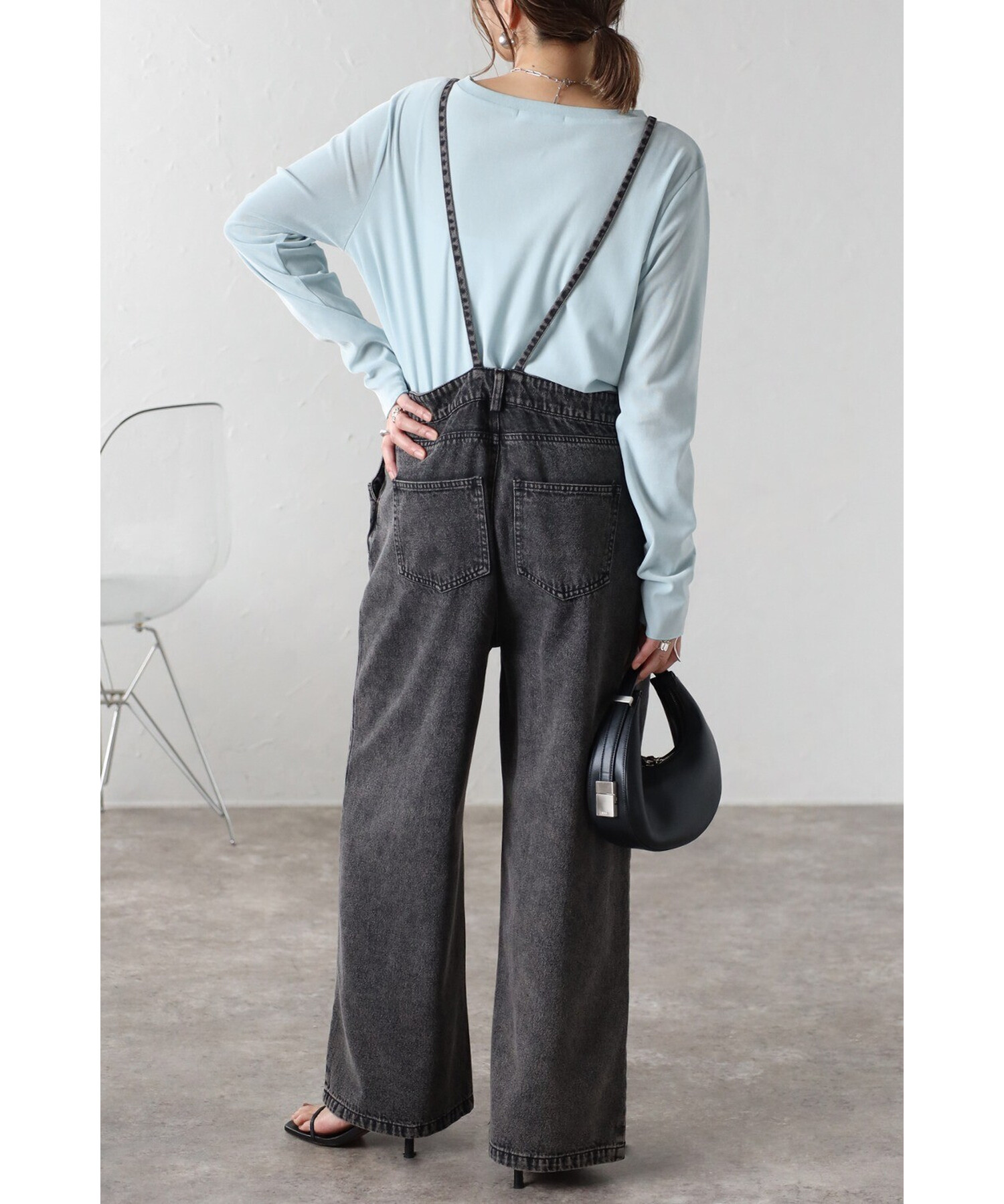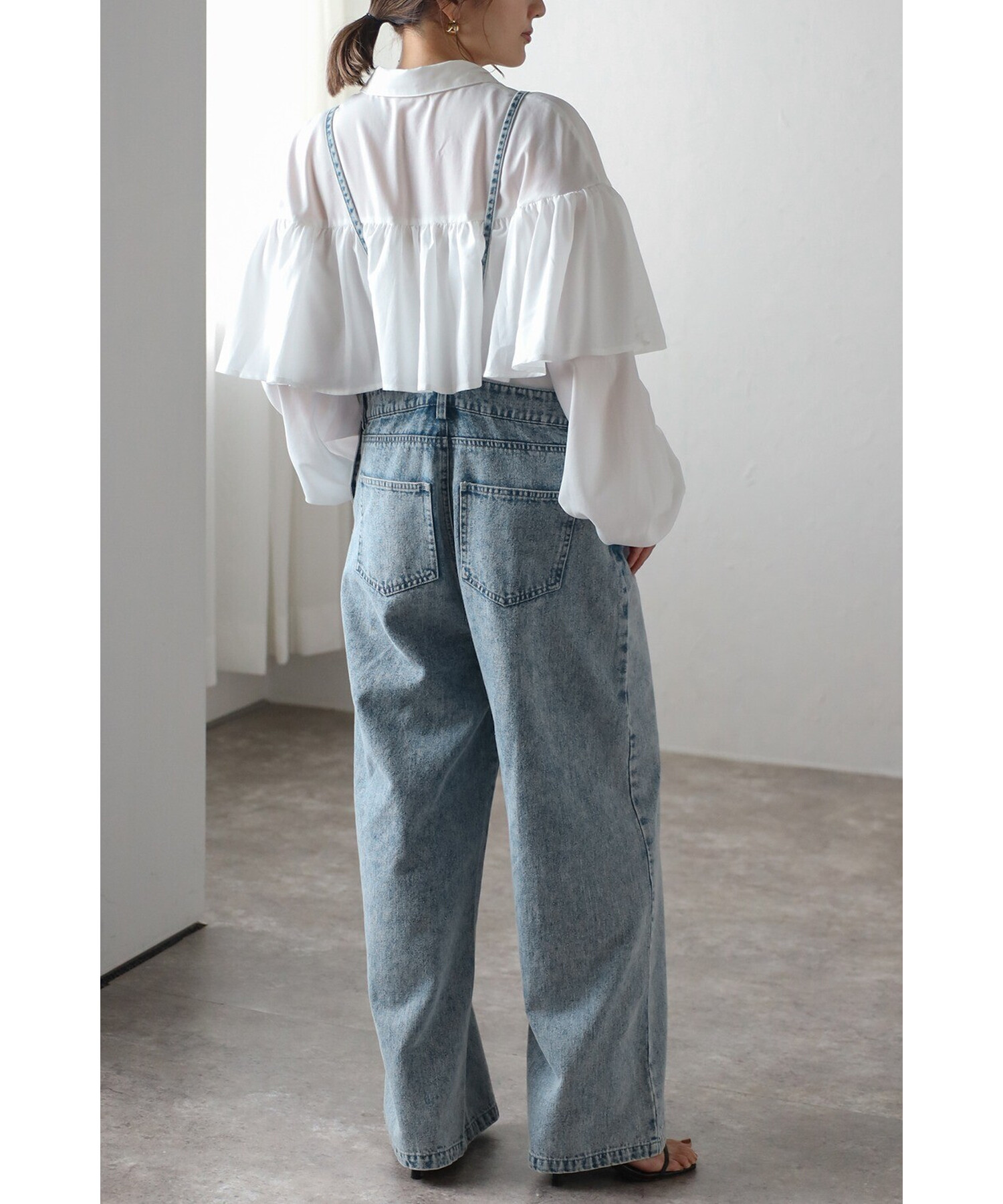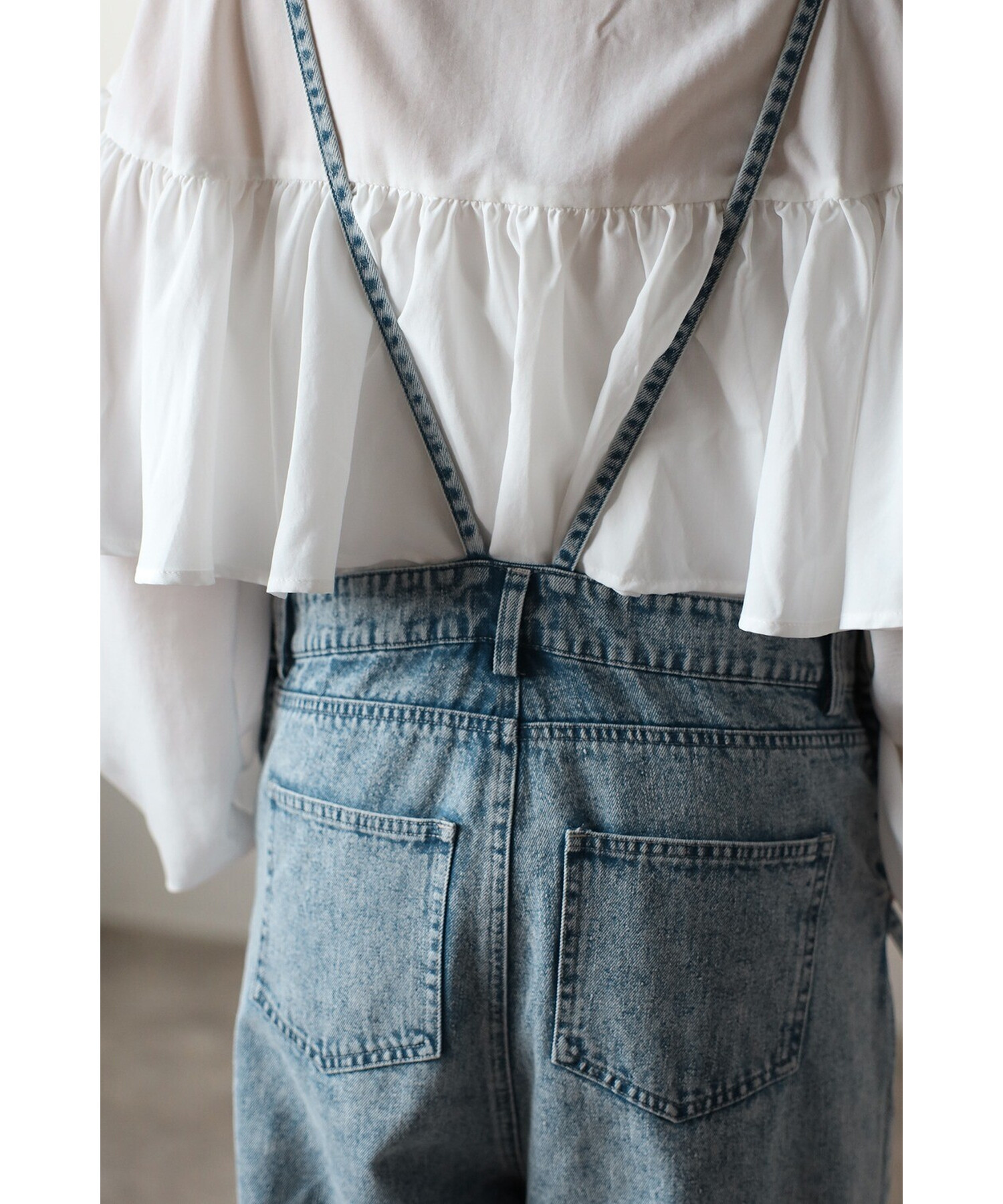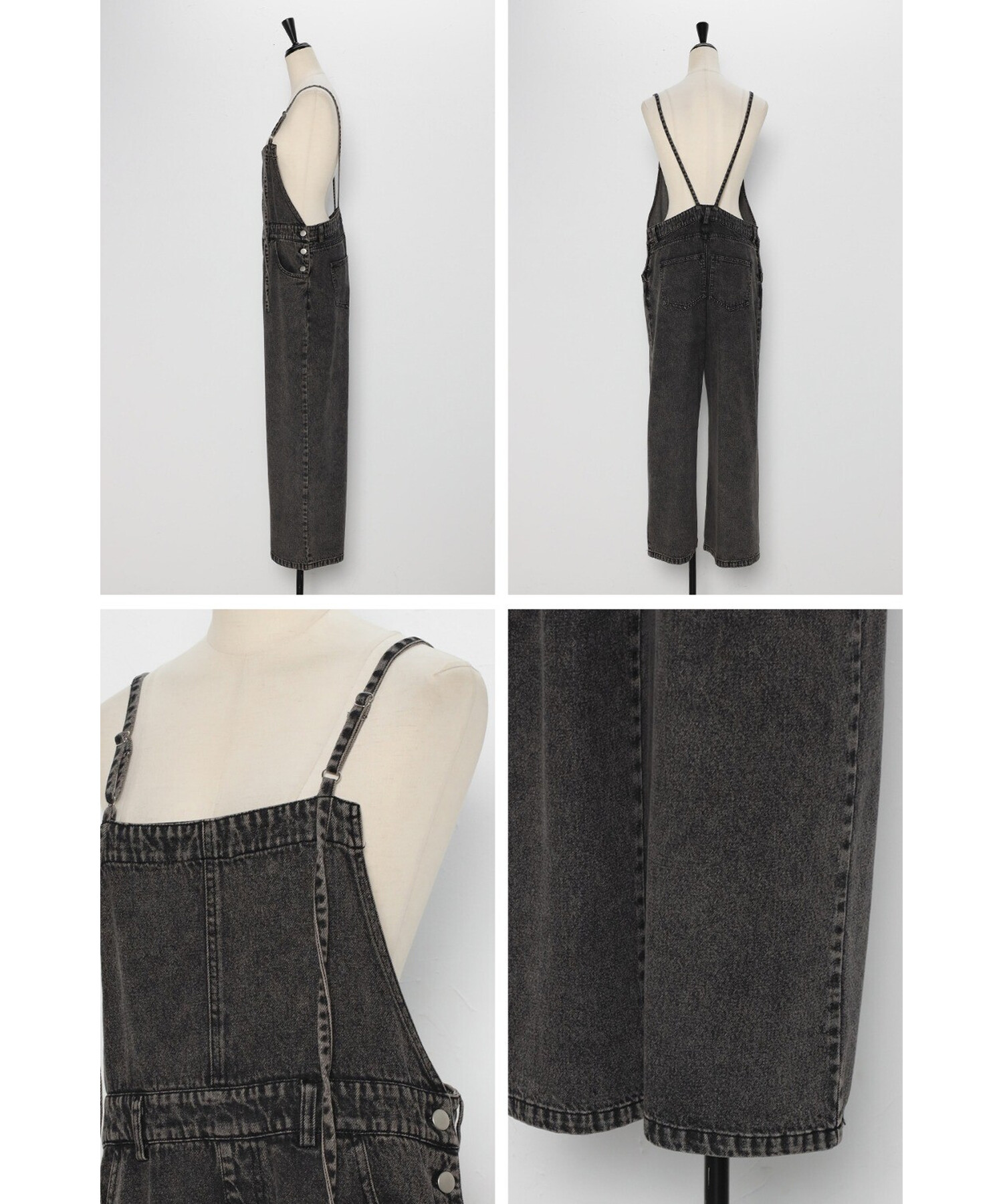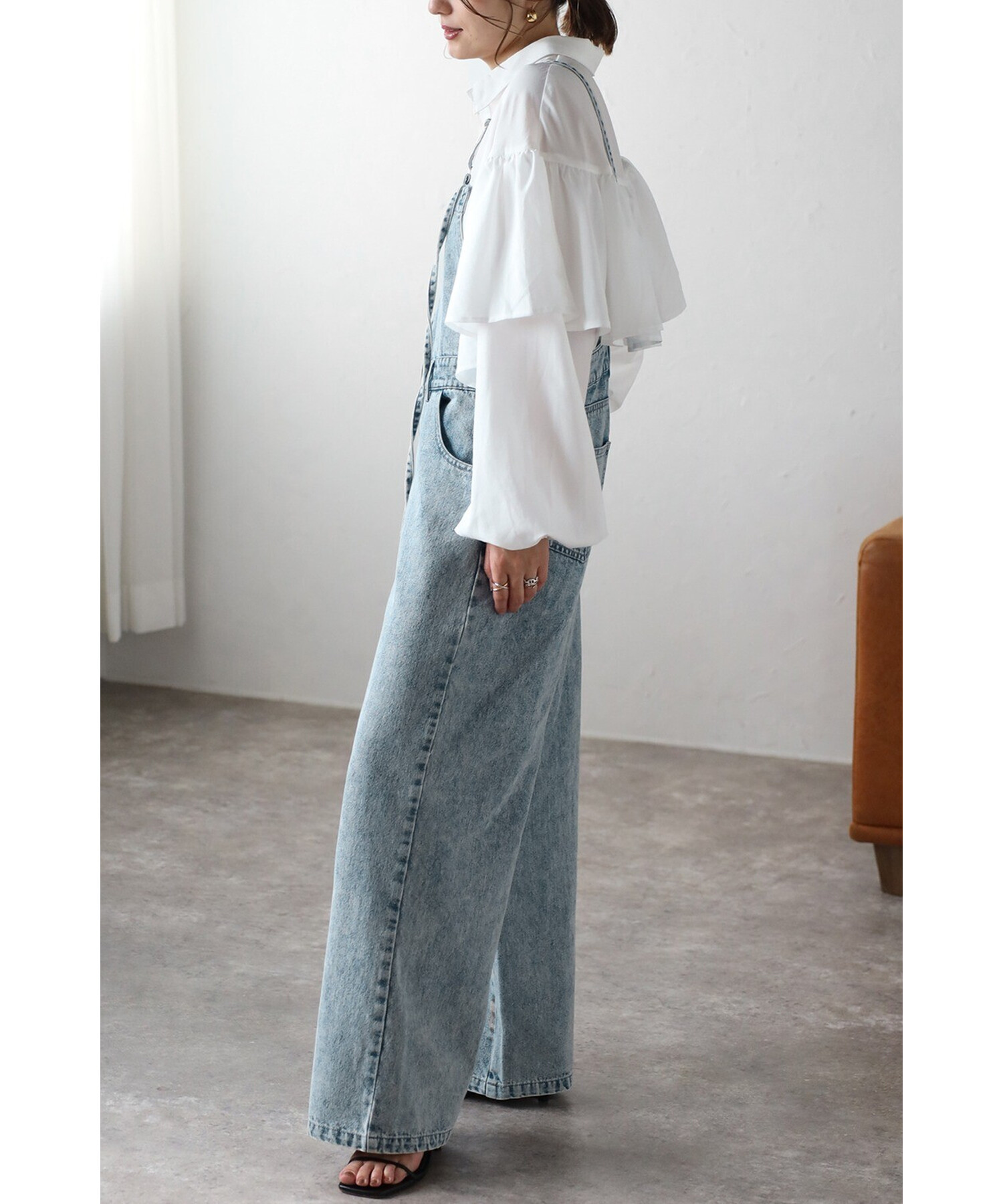 デニム素材を使用したオーバーオールは、カジュアルな装いにぴったり。