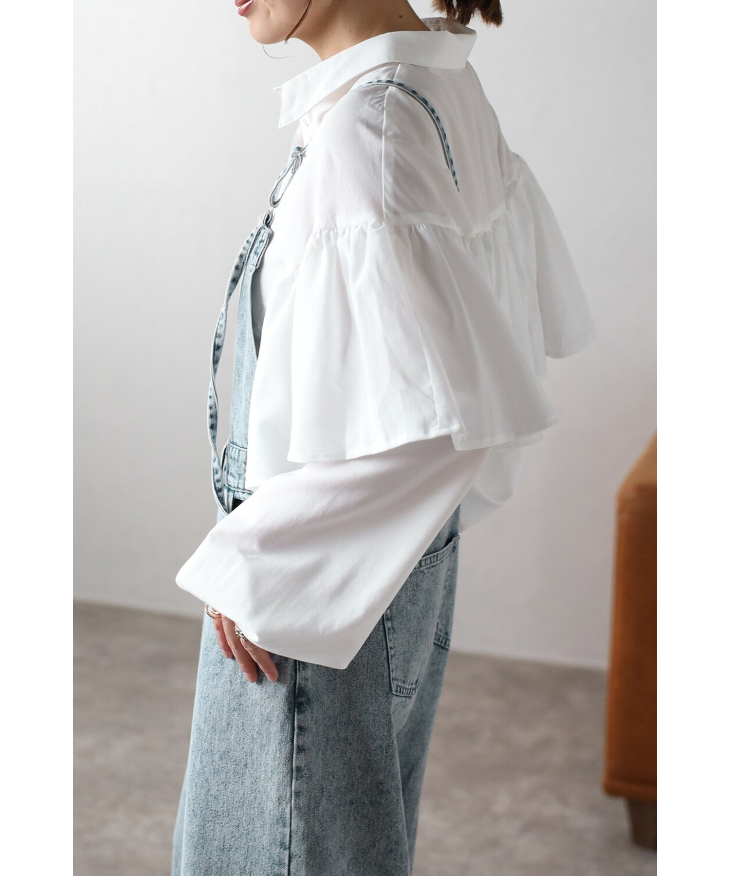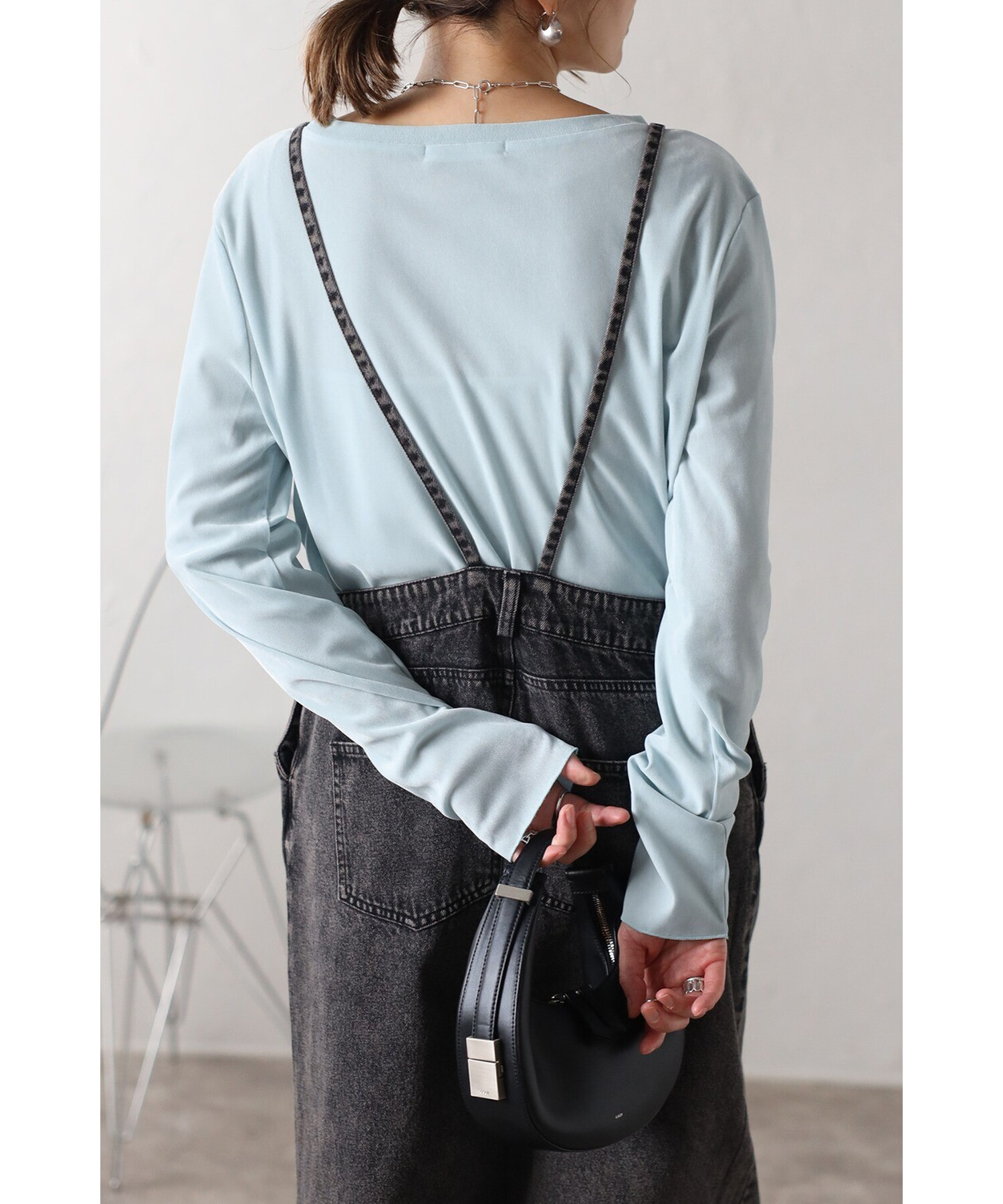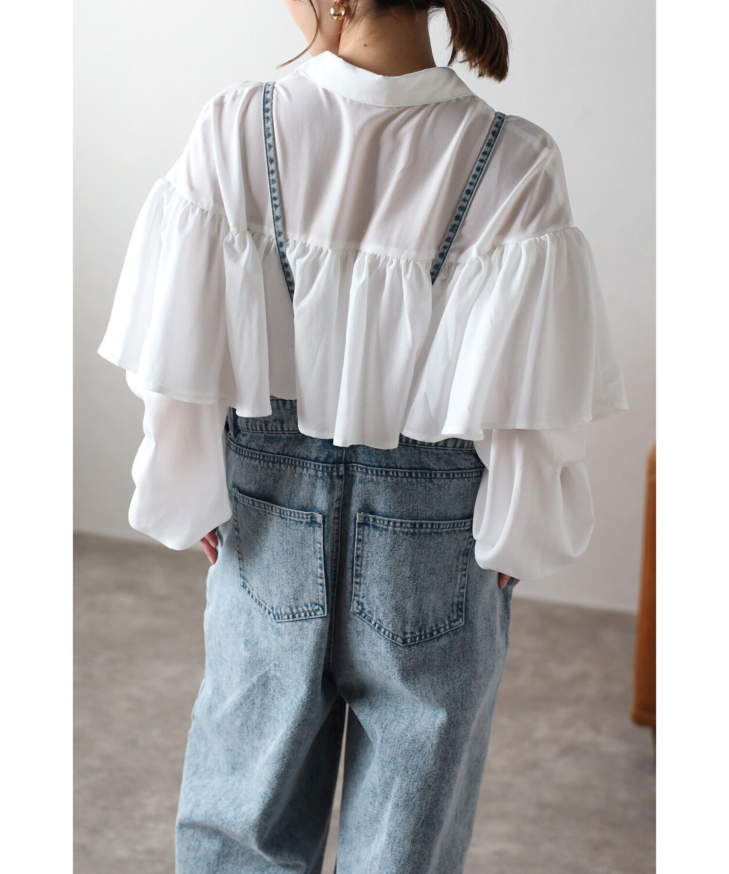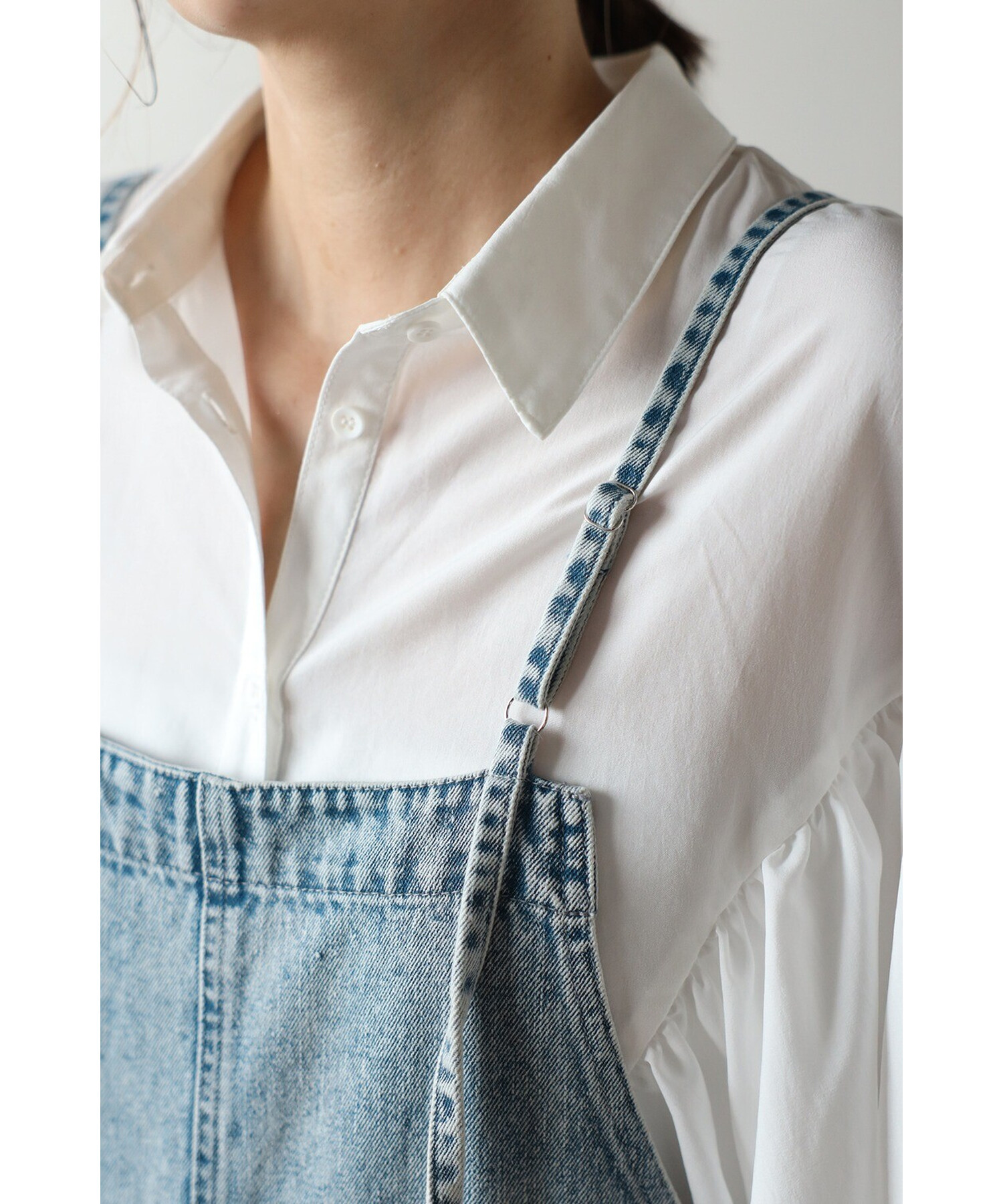 デニム素材を使用したオーバーオールは、カジュアルな装いにぴったり。