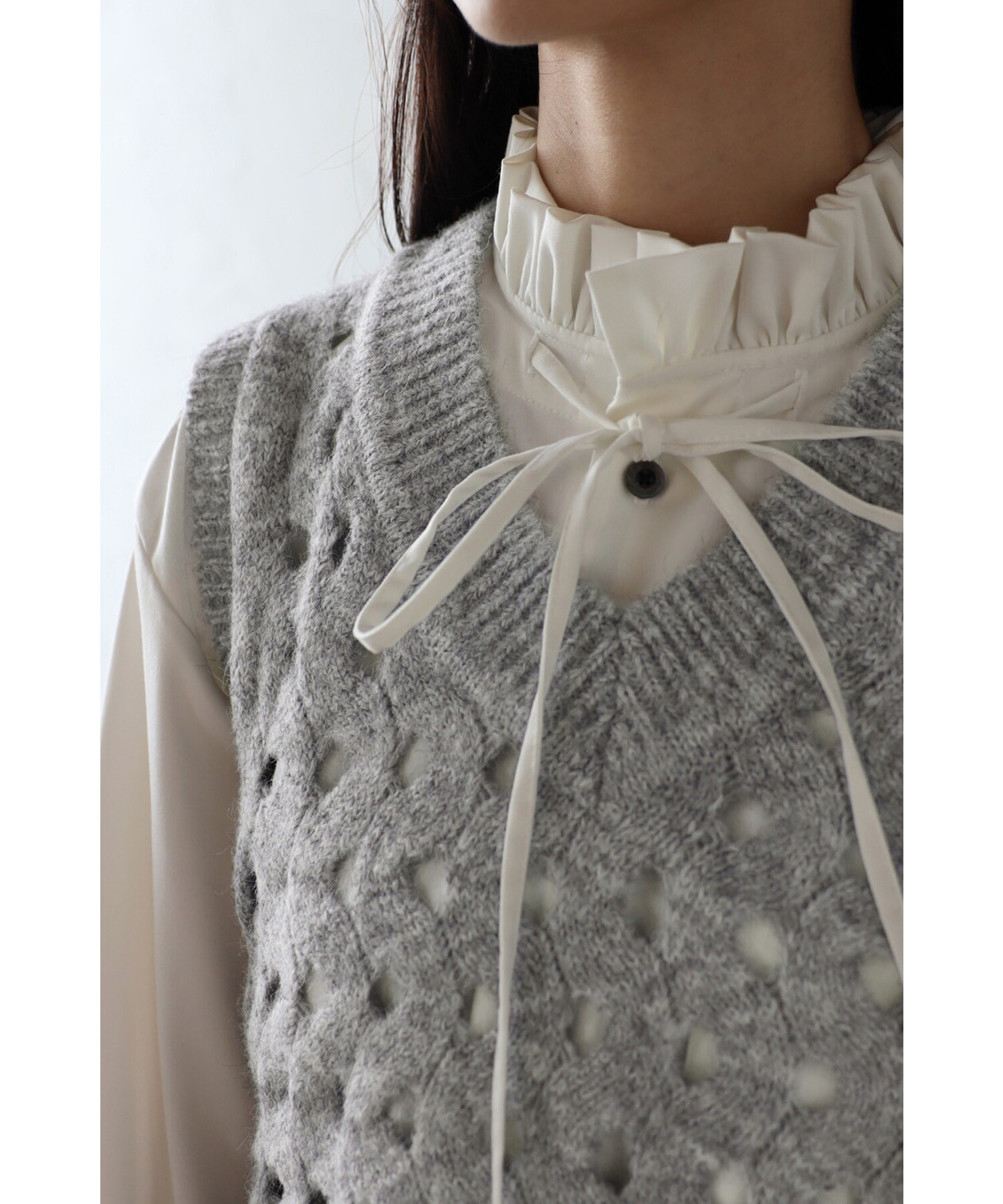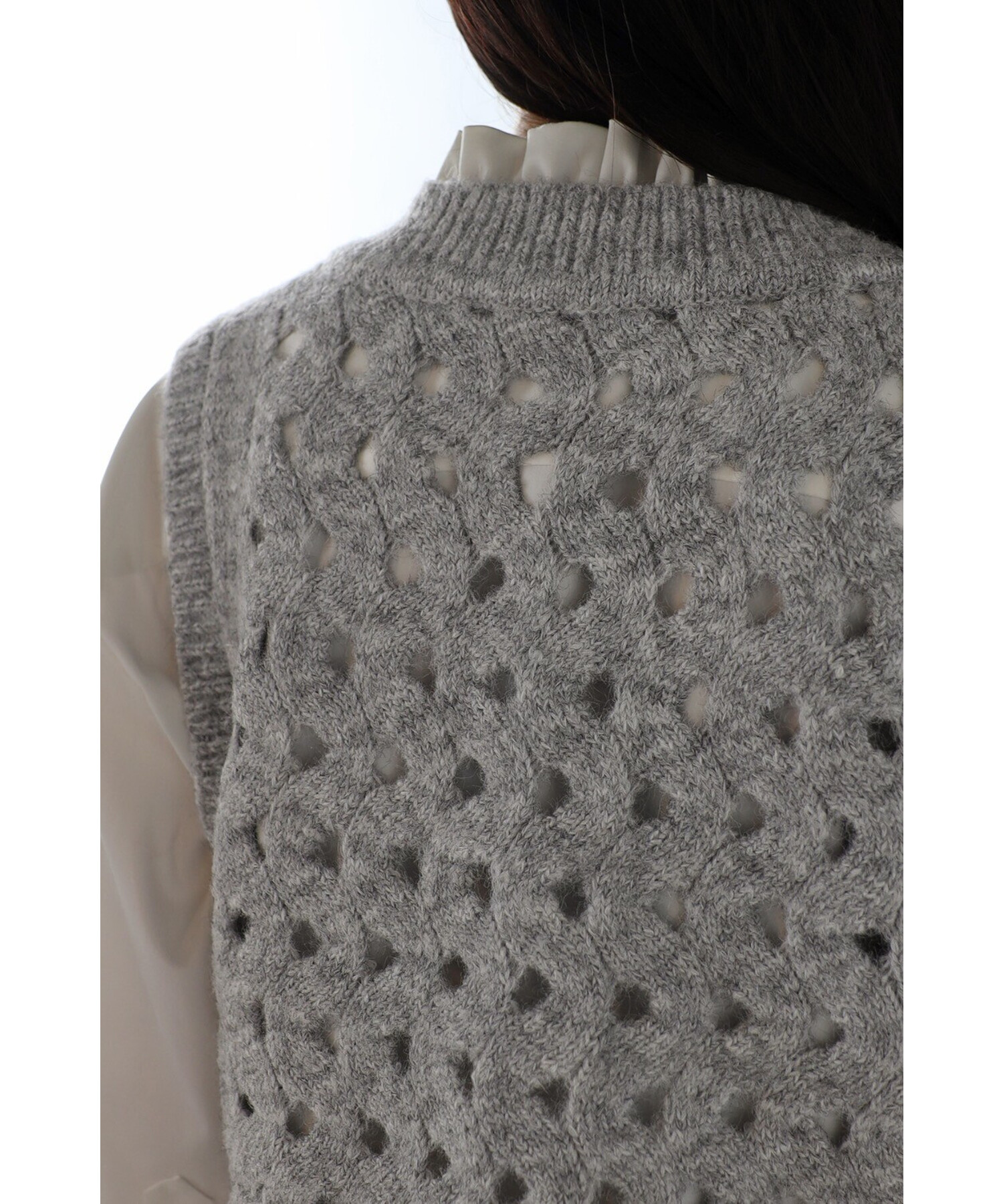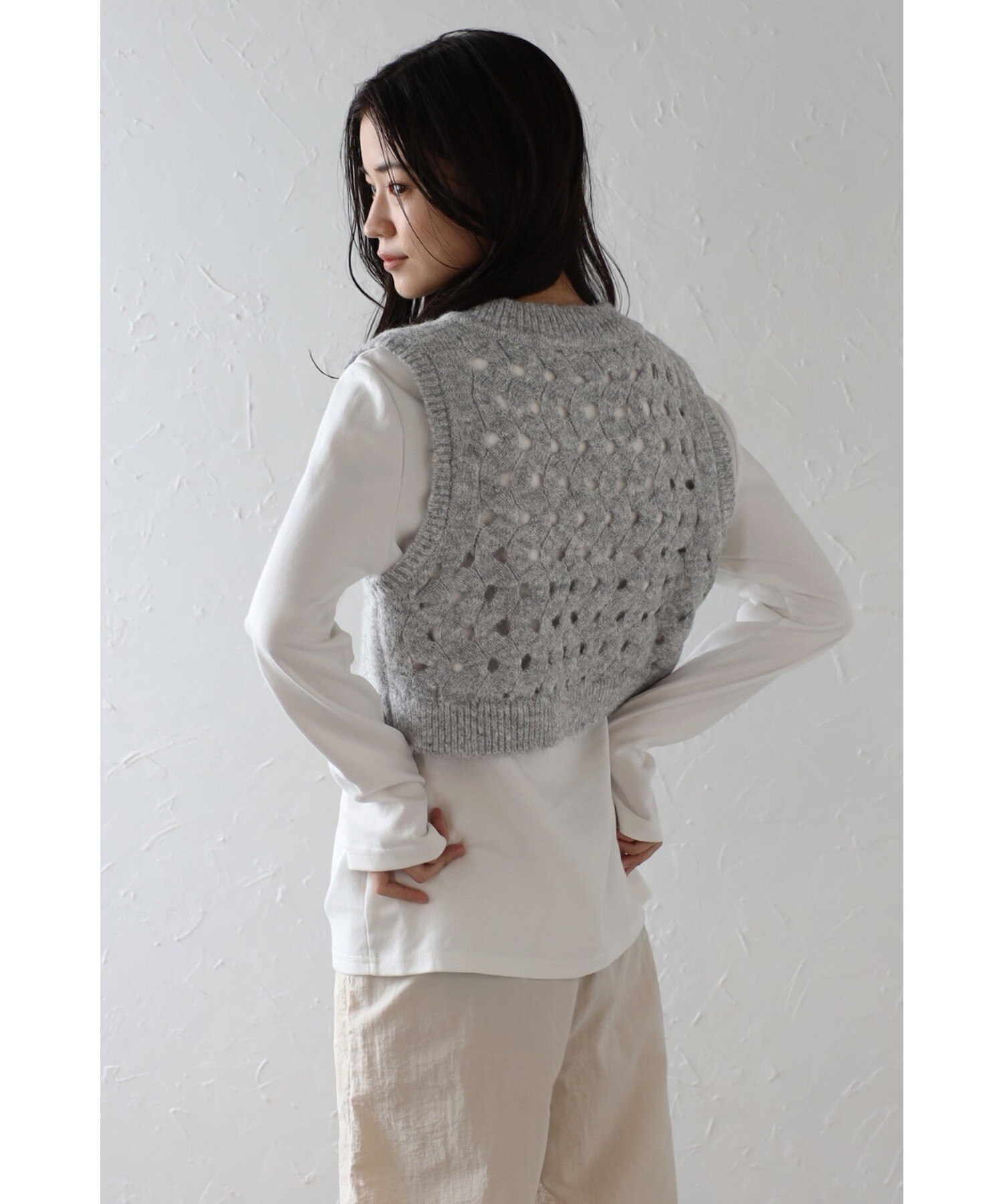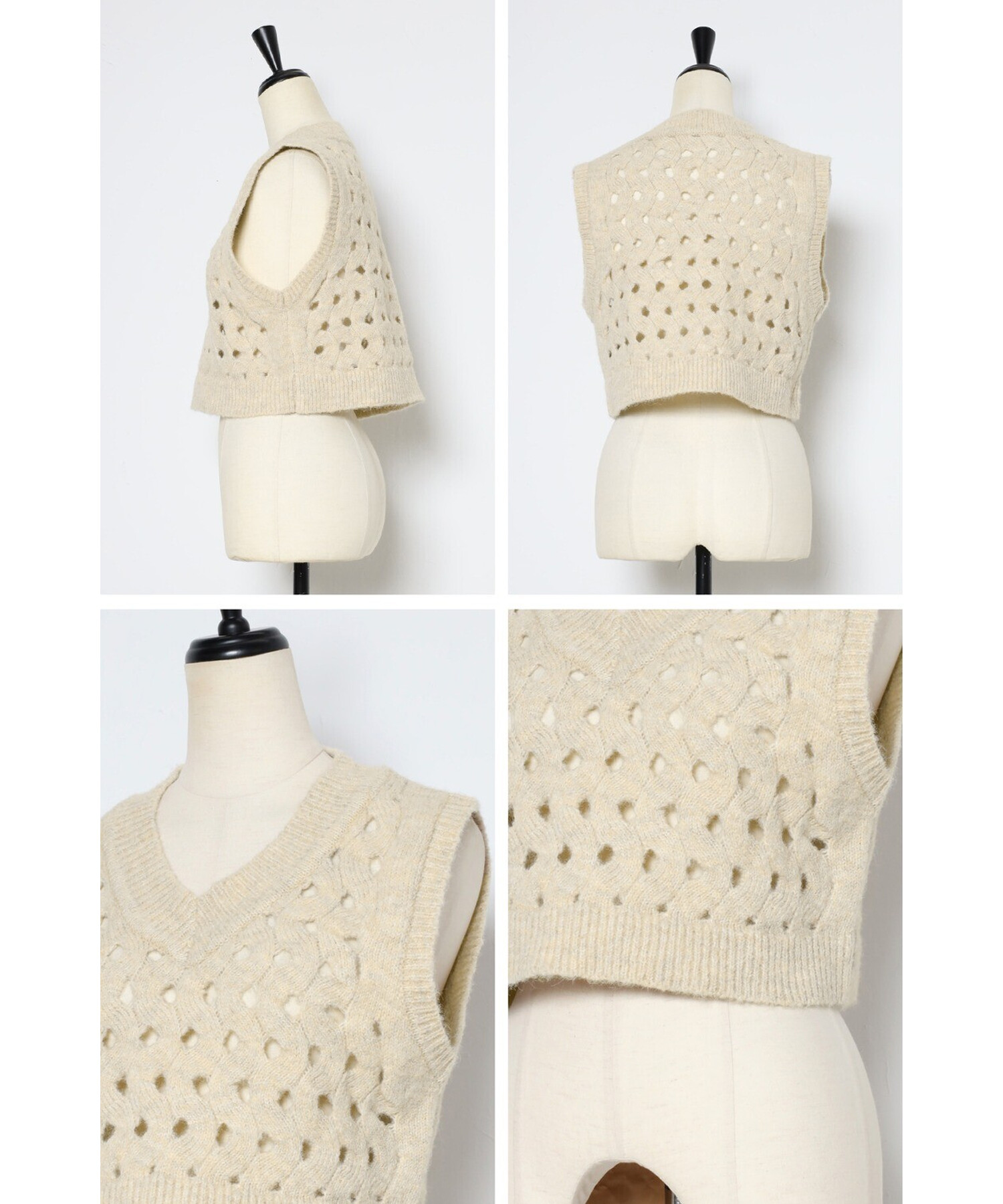 繊細なホール編みデザインが魅力のVネックニットベスト