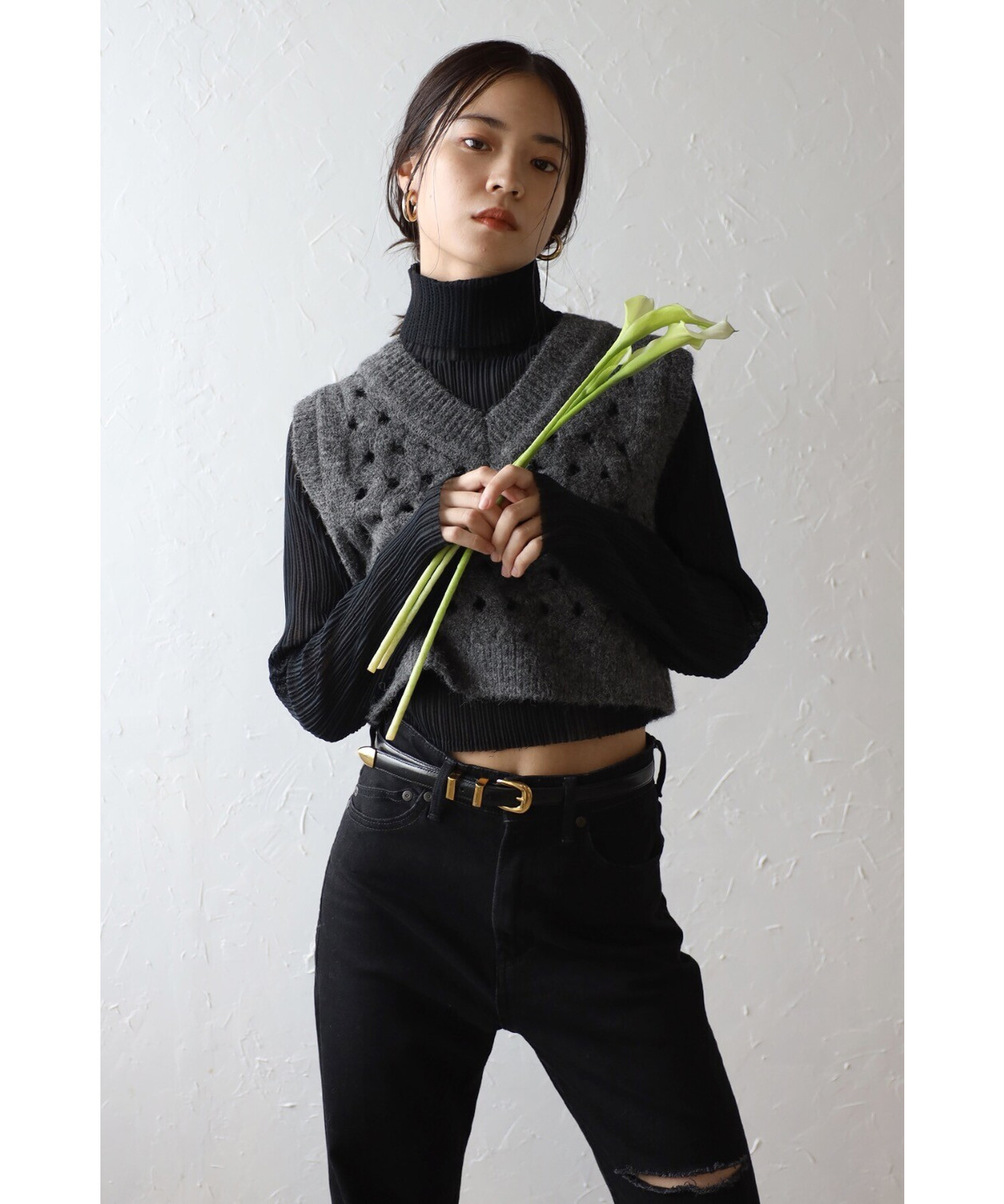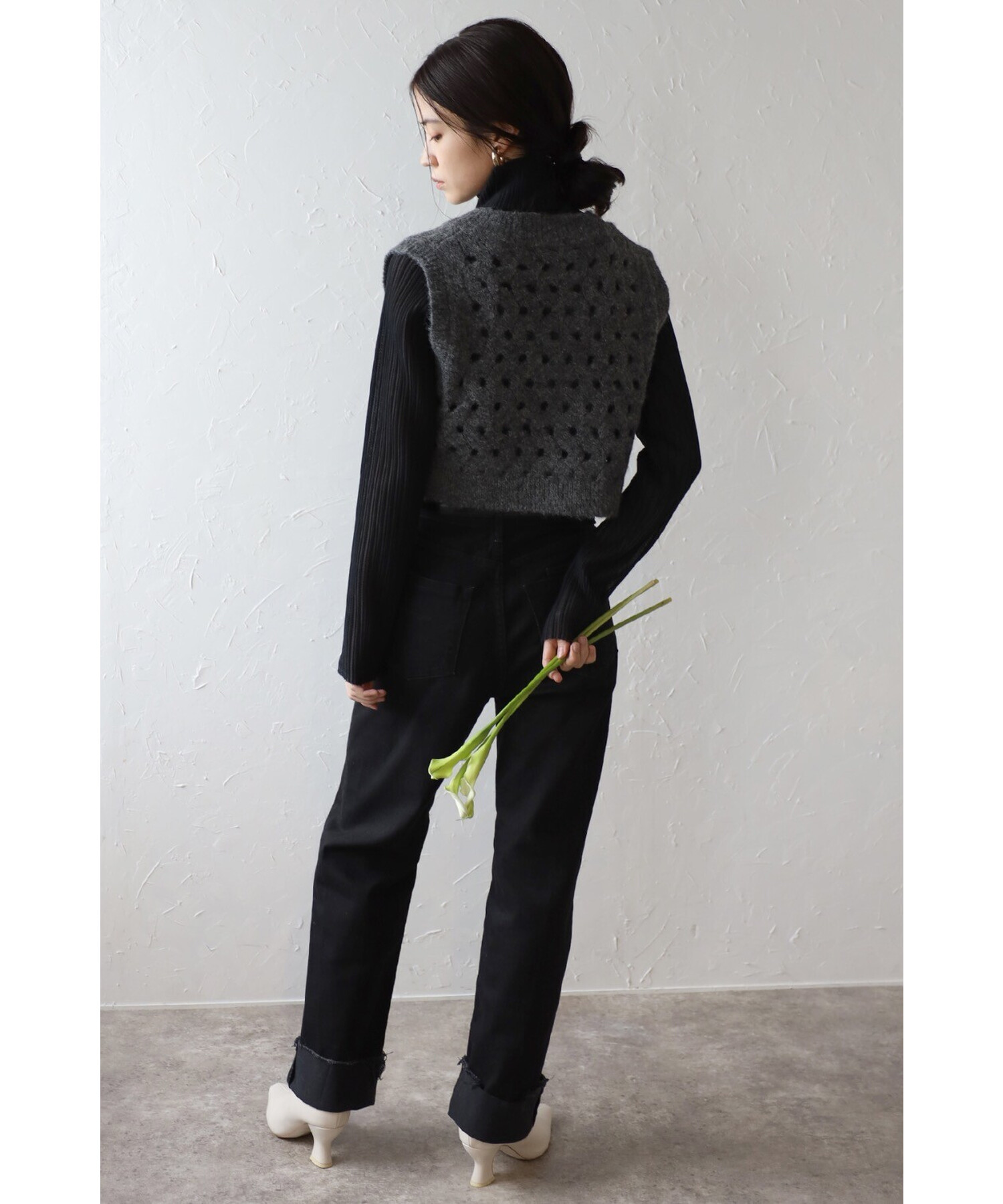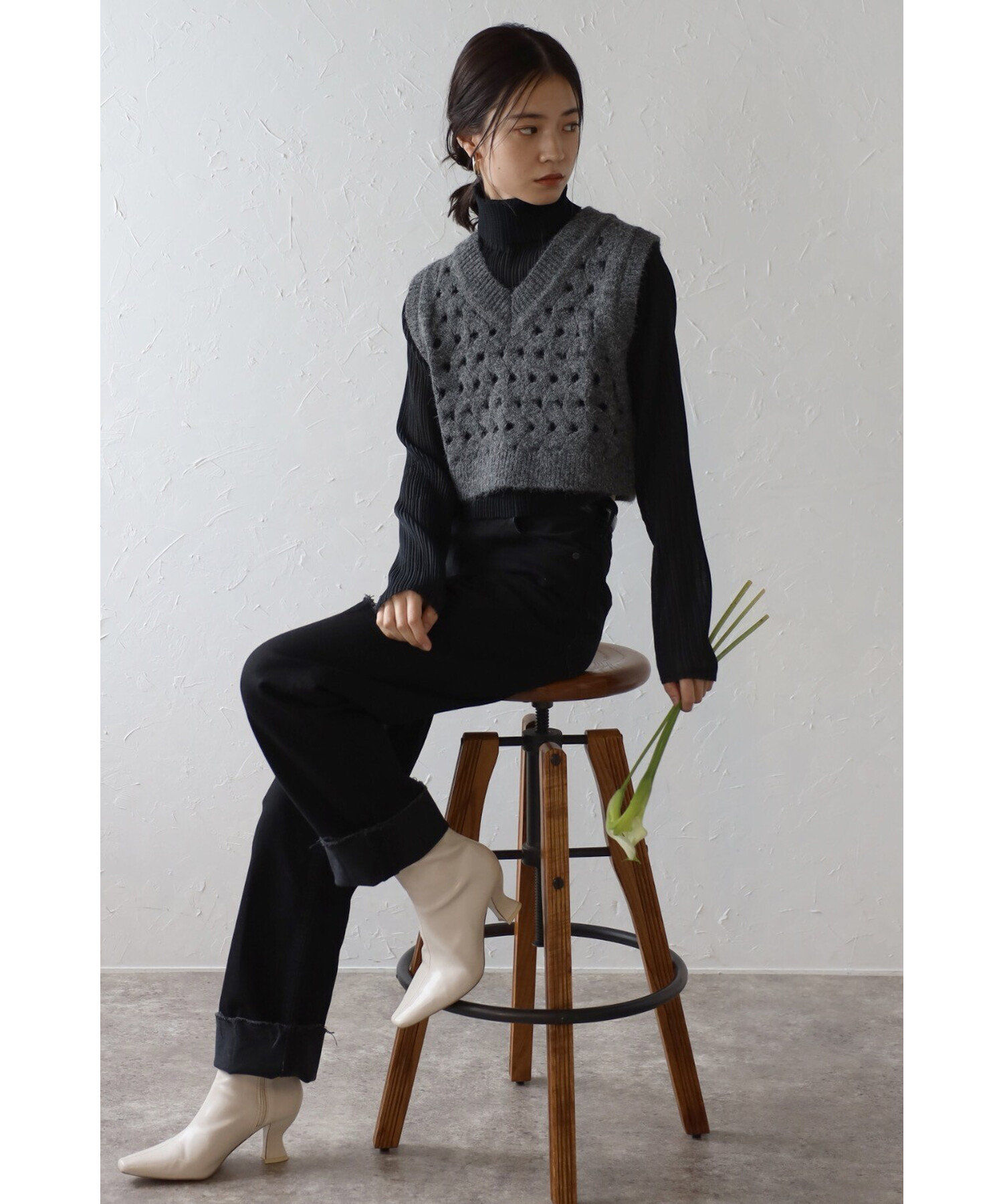 独特なホール編みパターンが目を惹くスタイリッシュなVネックベスト。
