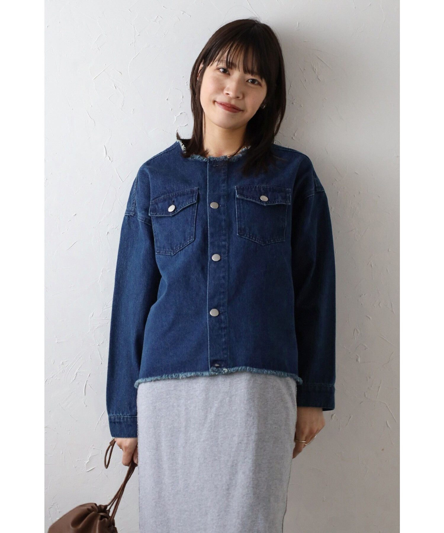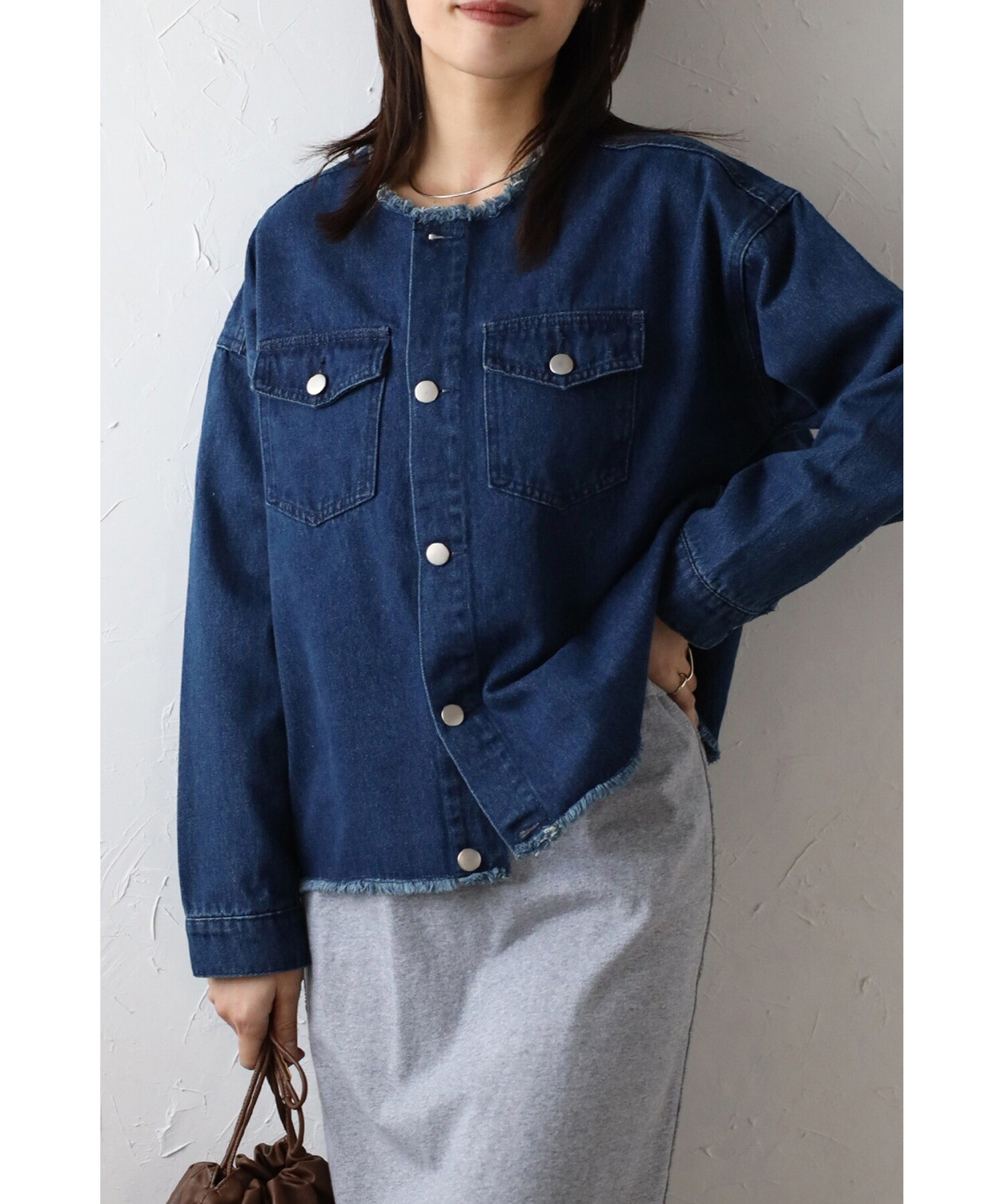 ラフなこなれ感を纏うノーカラーデニムジャケット
