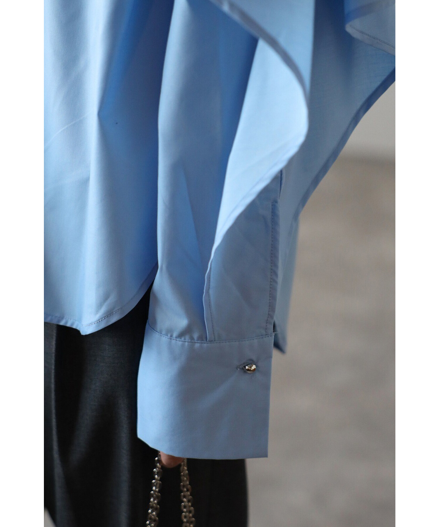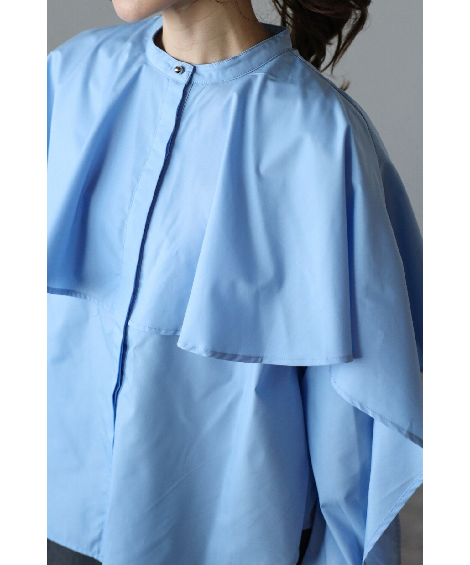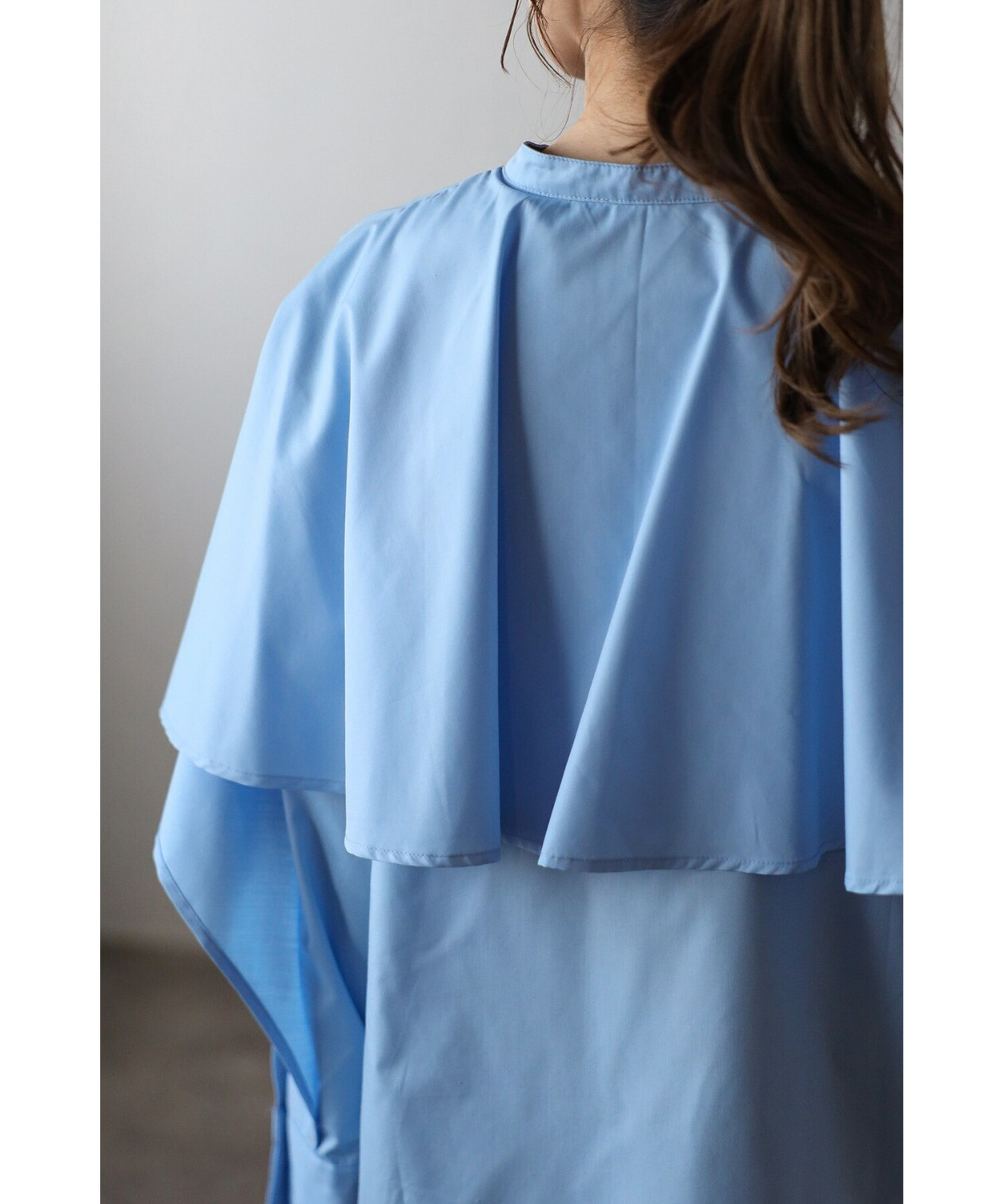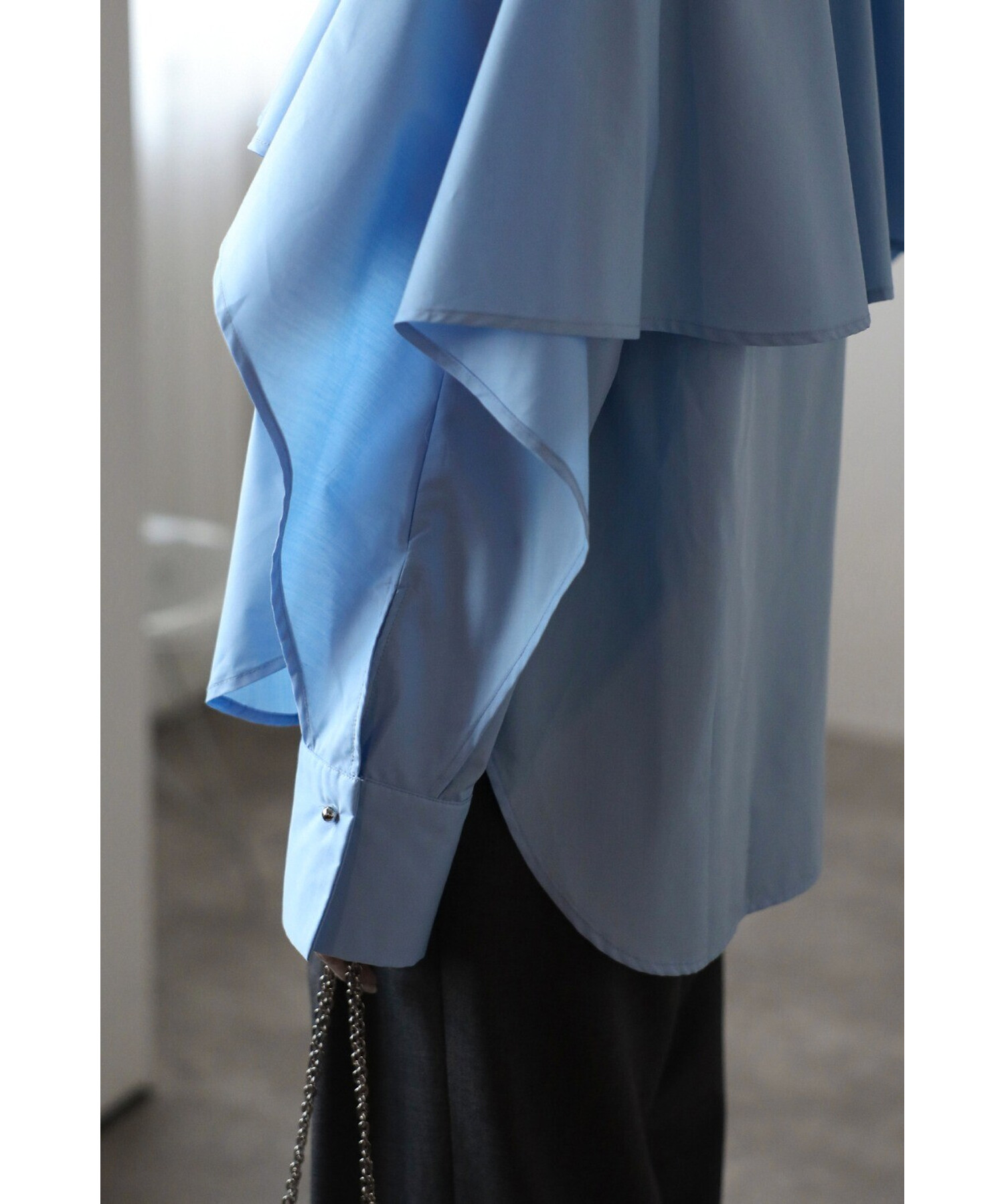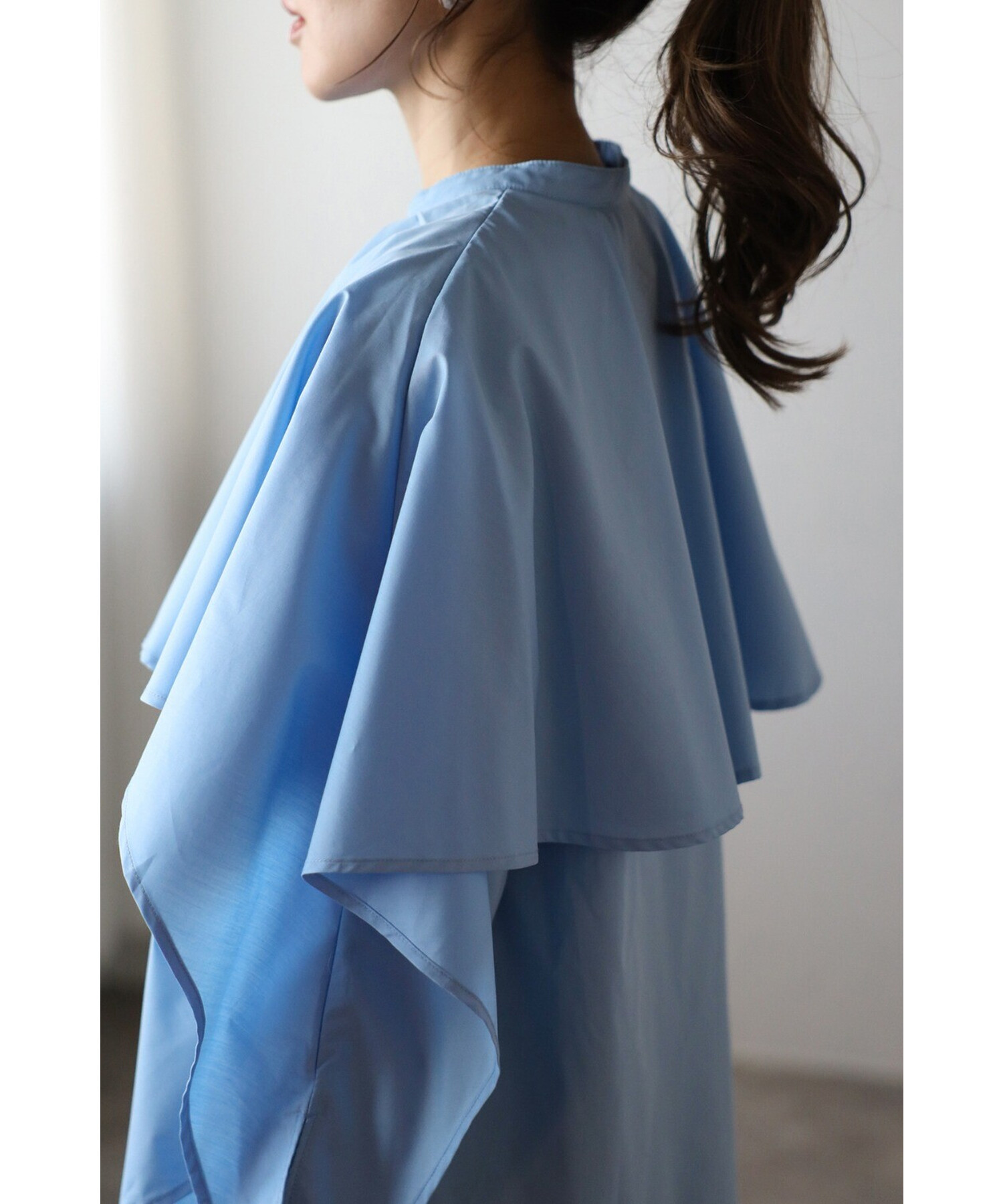 肩から袖にかけての立体的なフリルが、女性らしいシルエットを際立たせます。