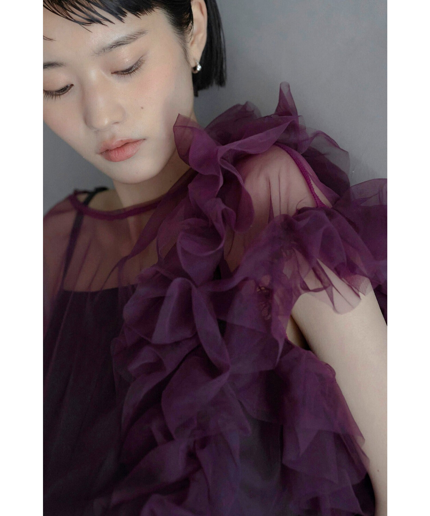 繊細なチュールにフリルをあしらった華やかなデザインが、特別感のある装いに。