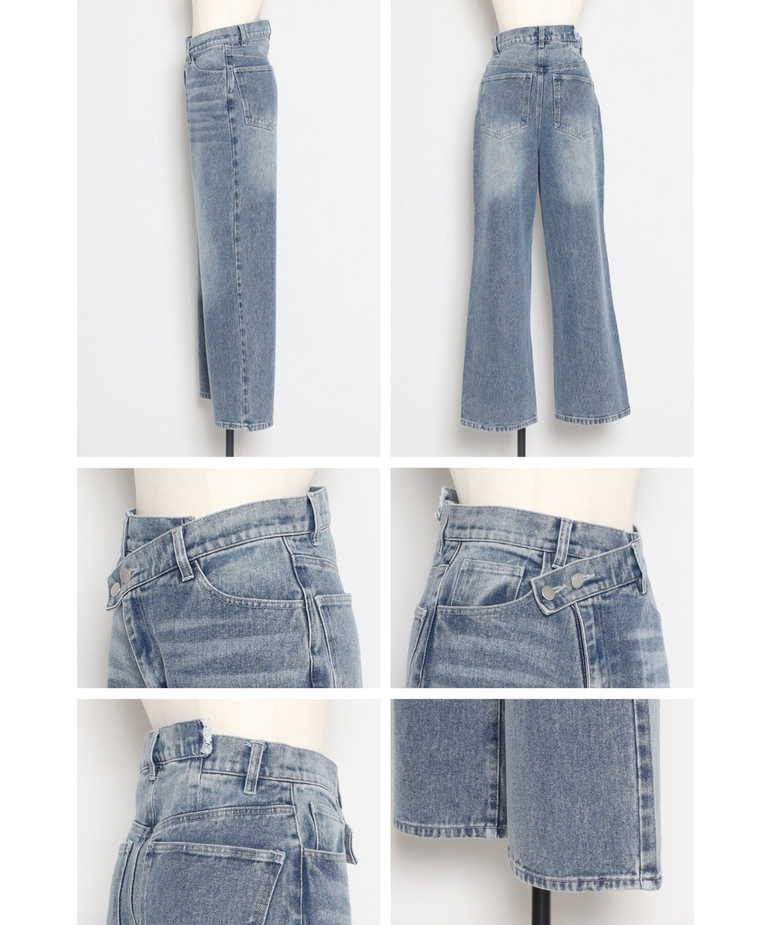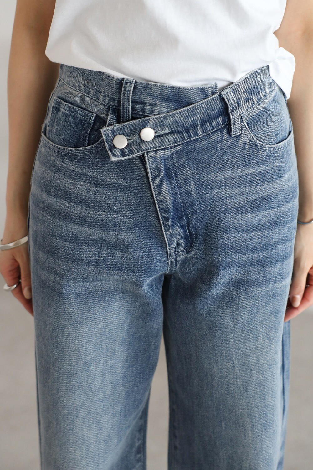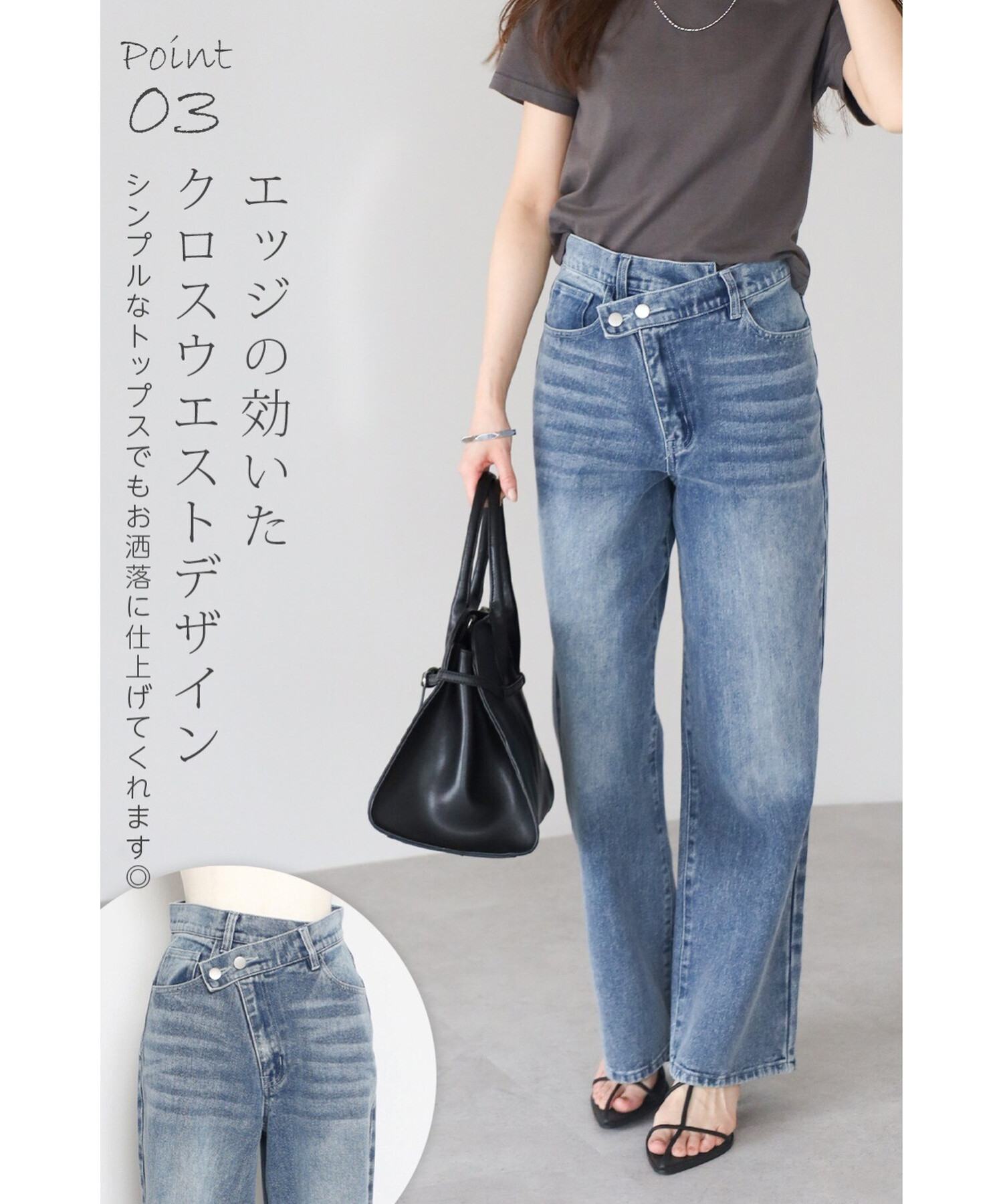 クロスウエストのディテールが、腰まわりに程よいアクセントを添えるデニムパンツ。