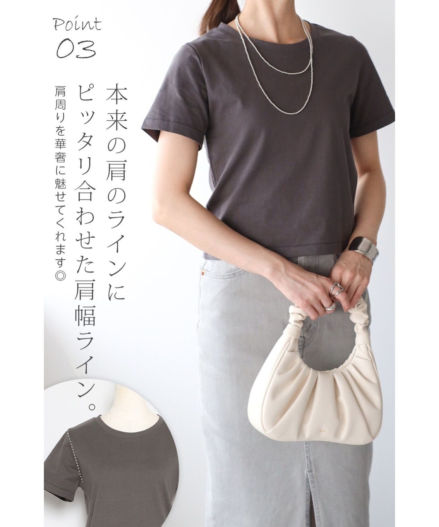 肩や二の腕を自然にカバーしながらすっきり見えを叶える、骨格ストレートさんのためのTシャツです。