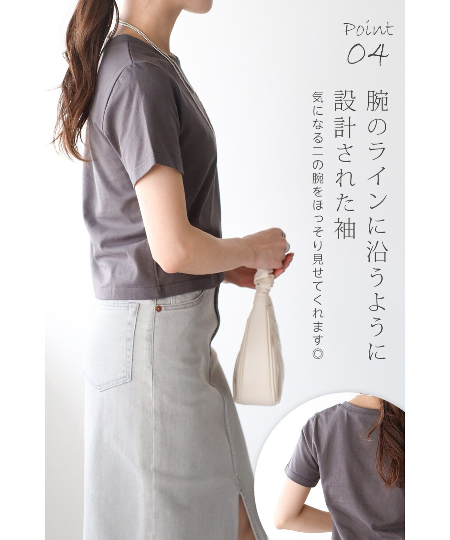 袖は着用したときにまっすぐになるよう設計され、気になる二の腕をカバーします。