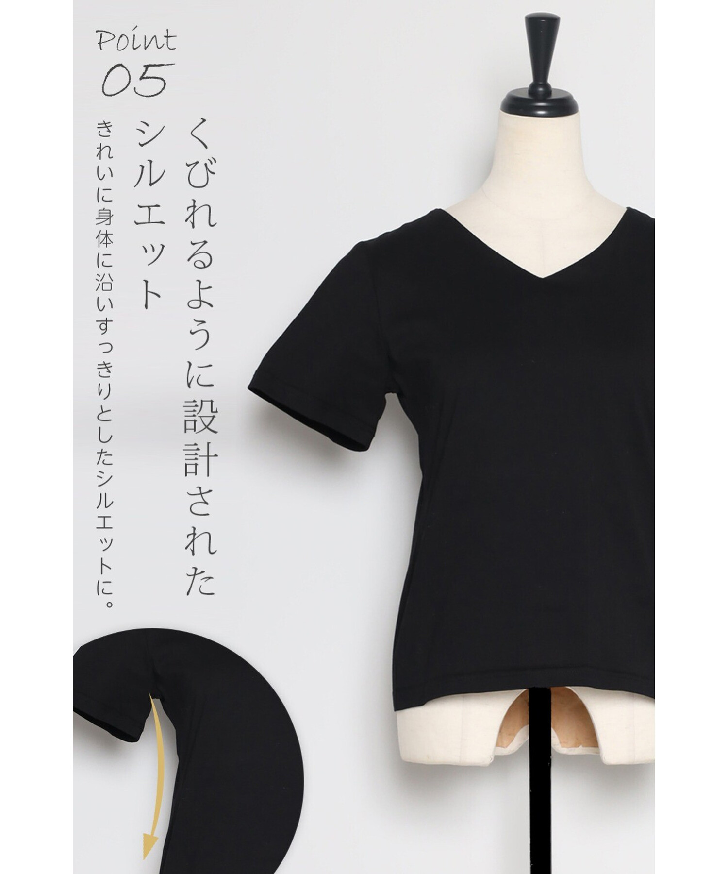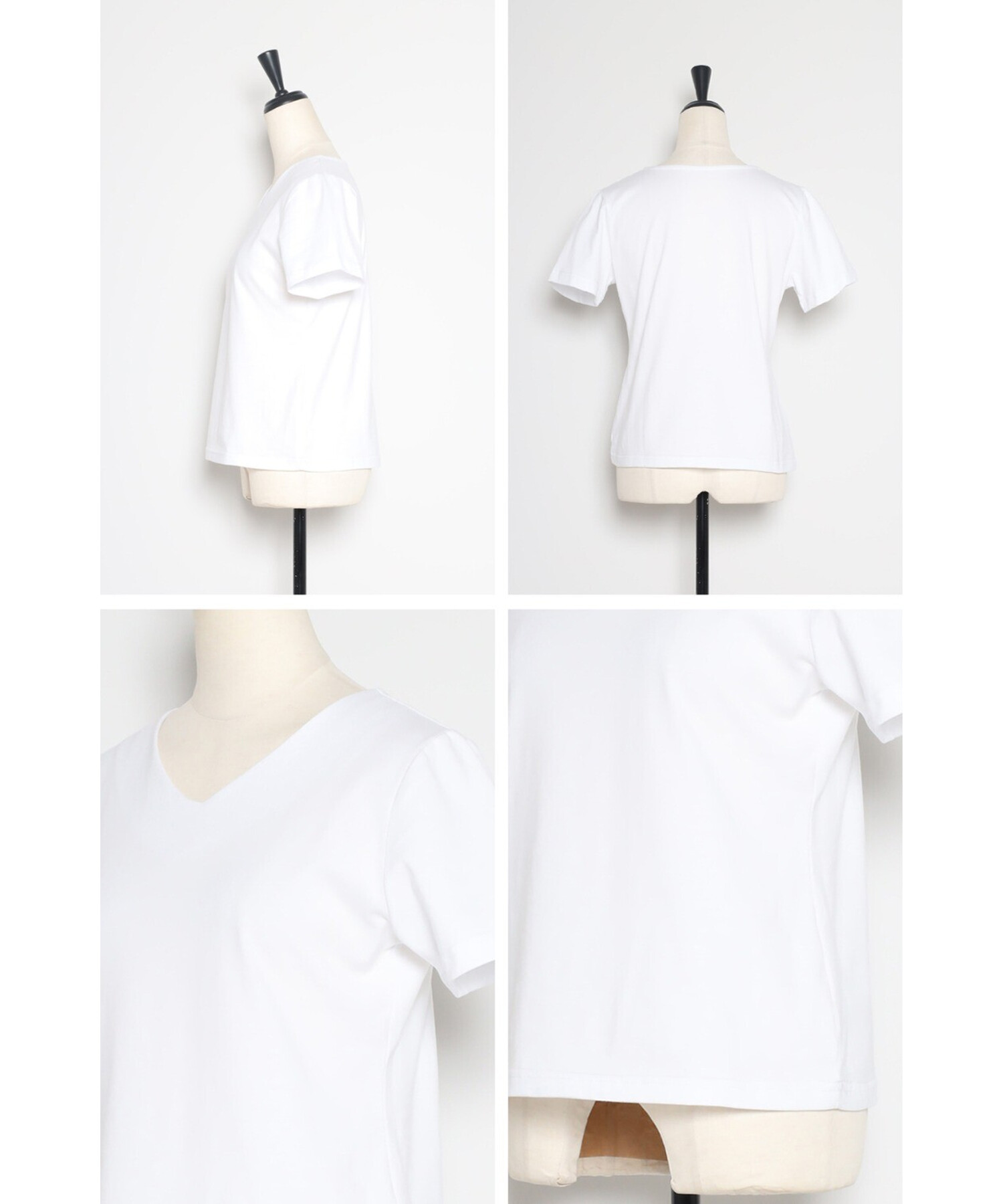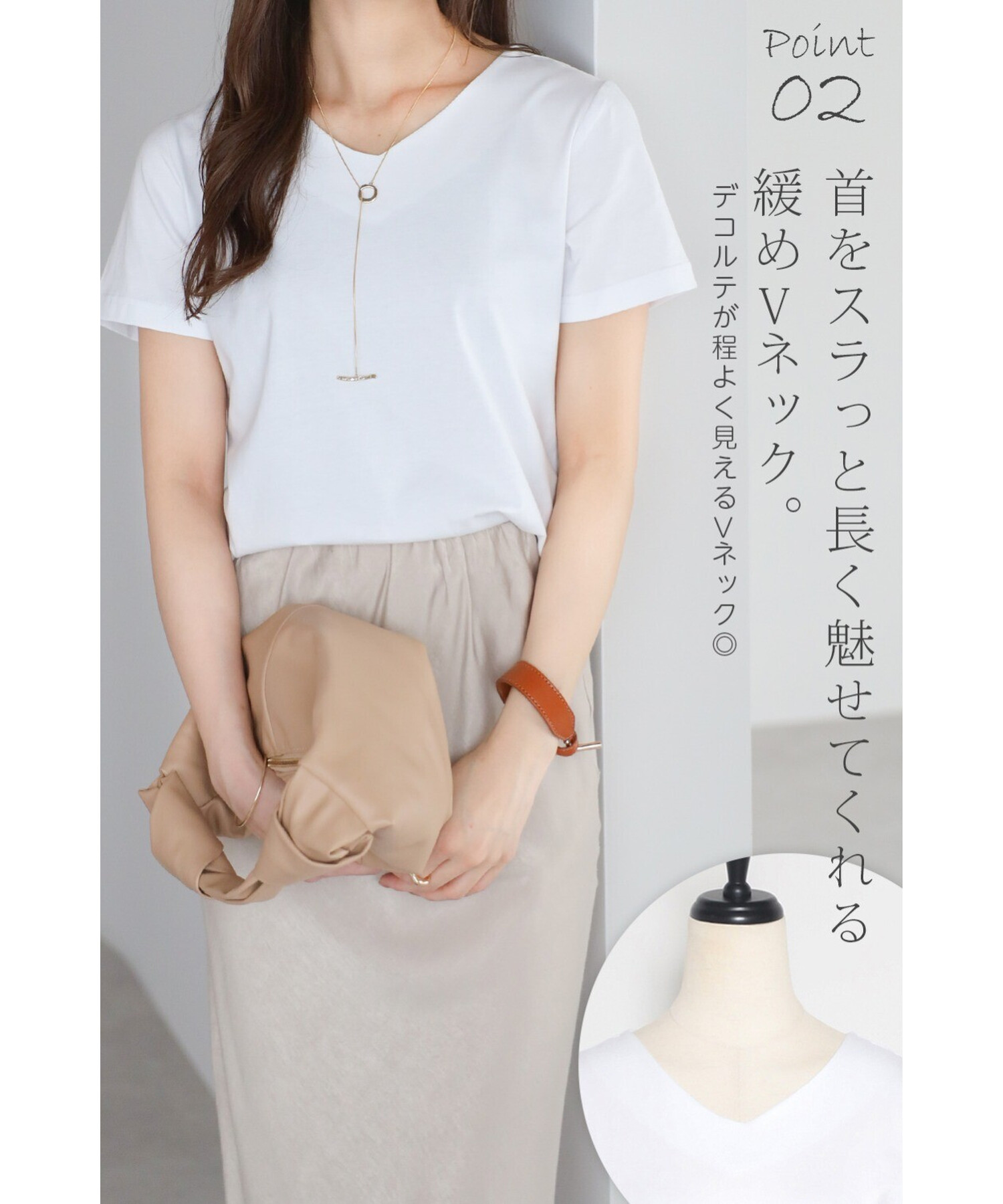 顔まわりをすっきり見せてくれるやわらかなVネックで、上品な抜け感を演出する半袖Tシャツ。