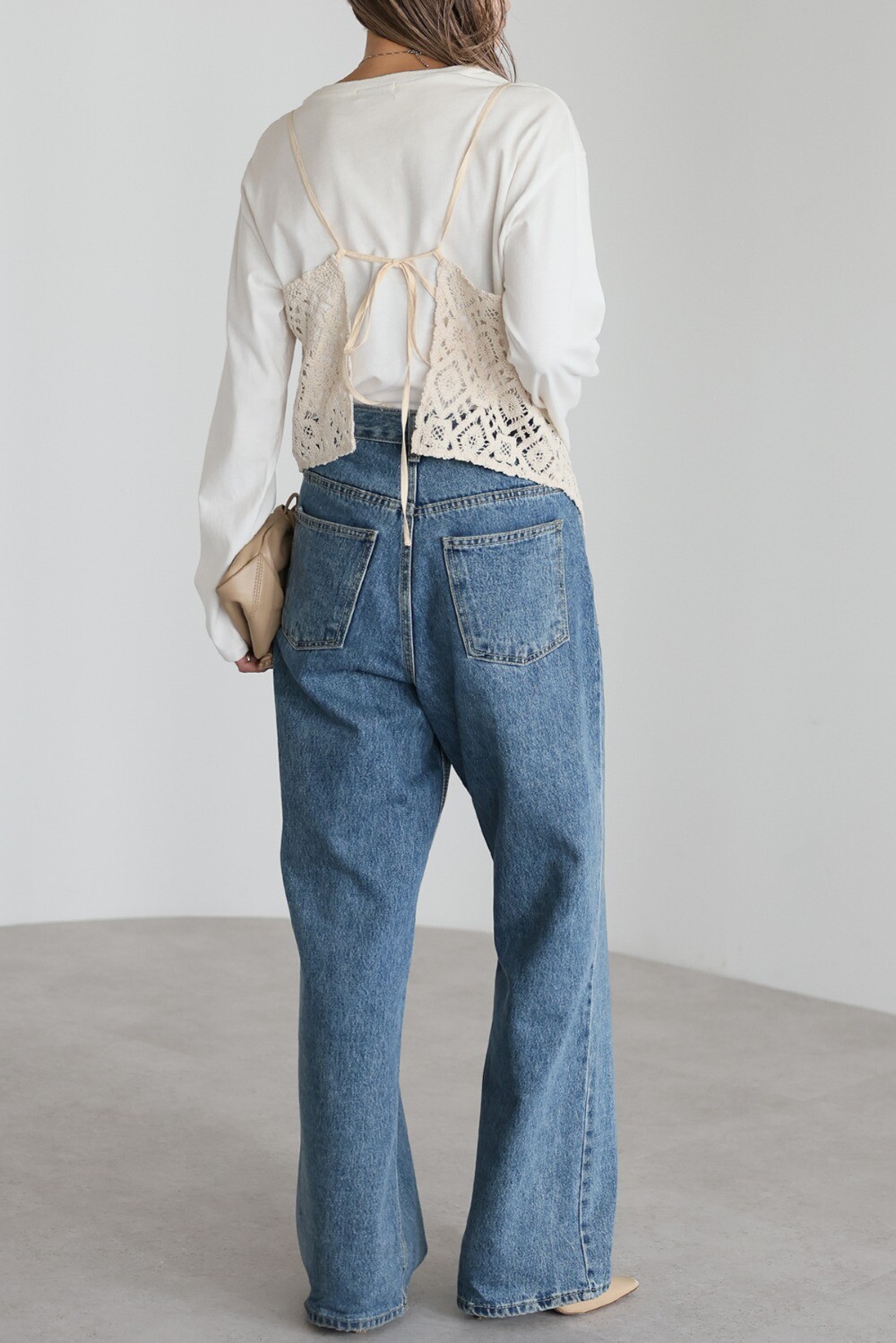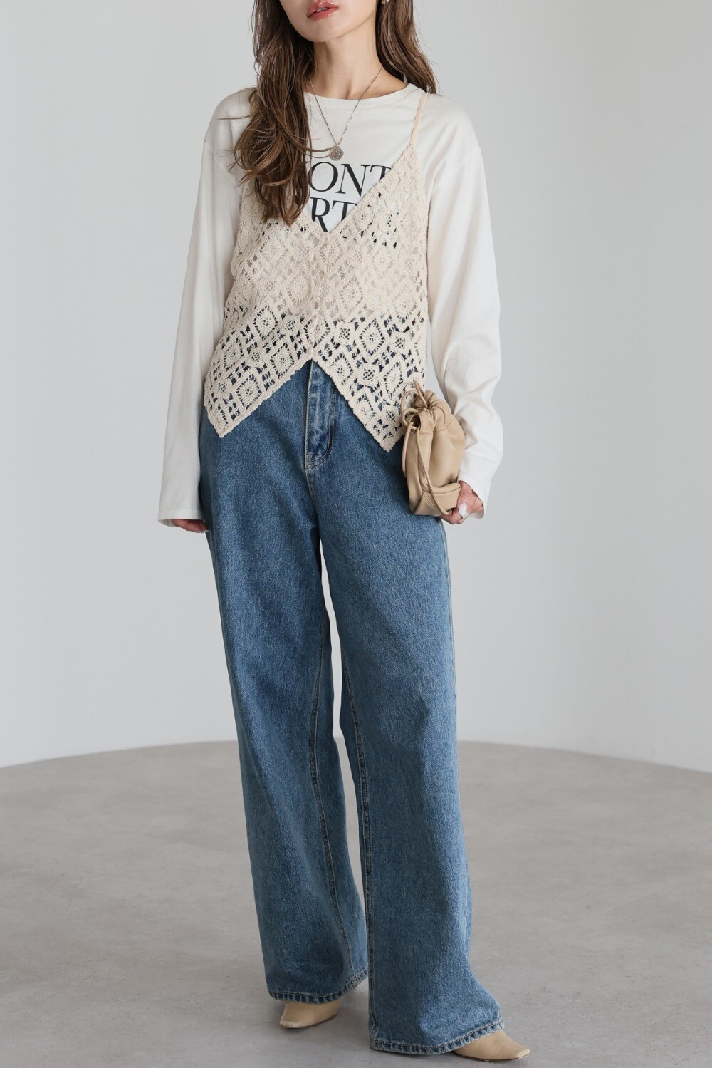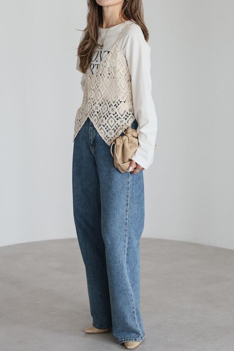 甘さ控えめの抜け感スタイルに。かぎ編みクロシェキャミ