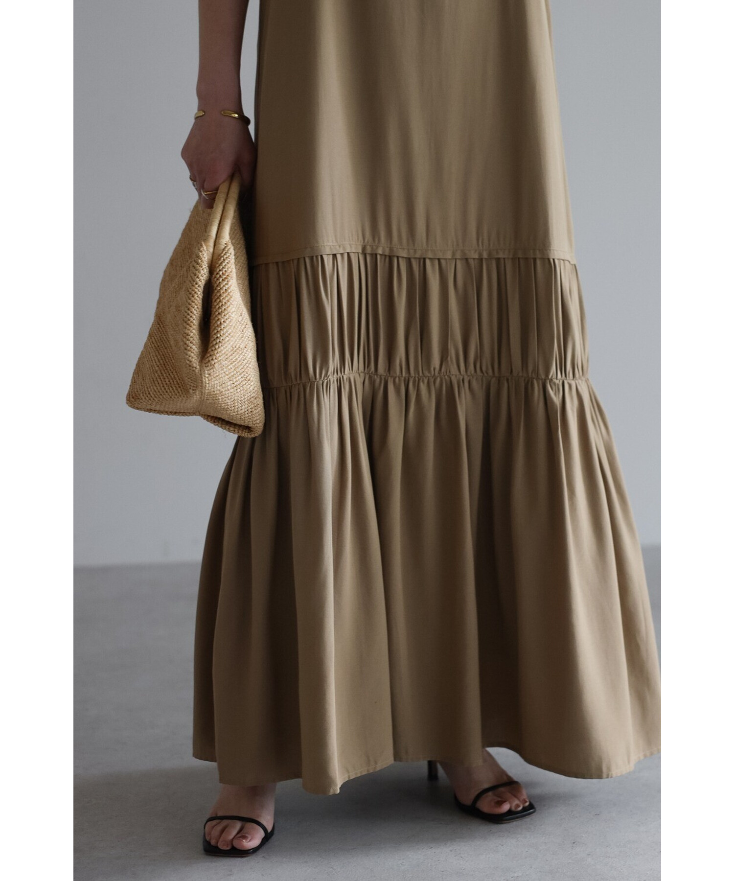 たっぷりギャザーの切り替えとフレアシルエットで、表情豊かなティアードワンピースです。