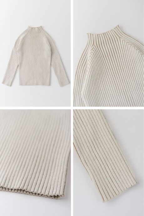 縦ラインを強調するワイドリブが、すっきりとした印象を与えるニット。