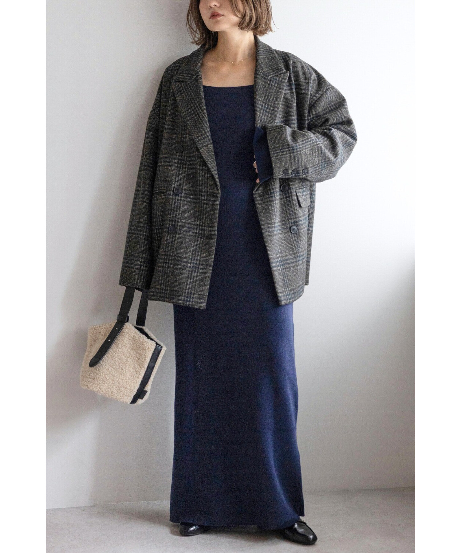 身体に沿いすぎないストレートラインが、すっきりとした縦のシルエットを際立たせます。