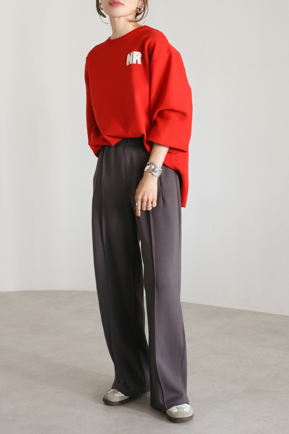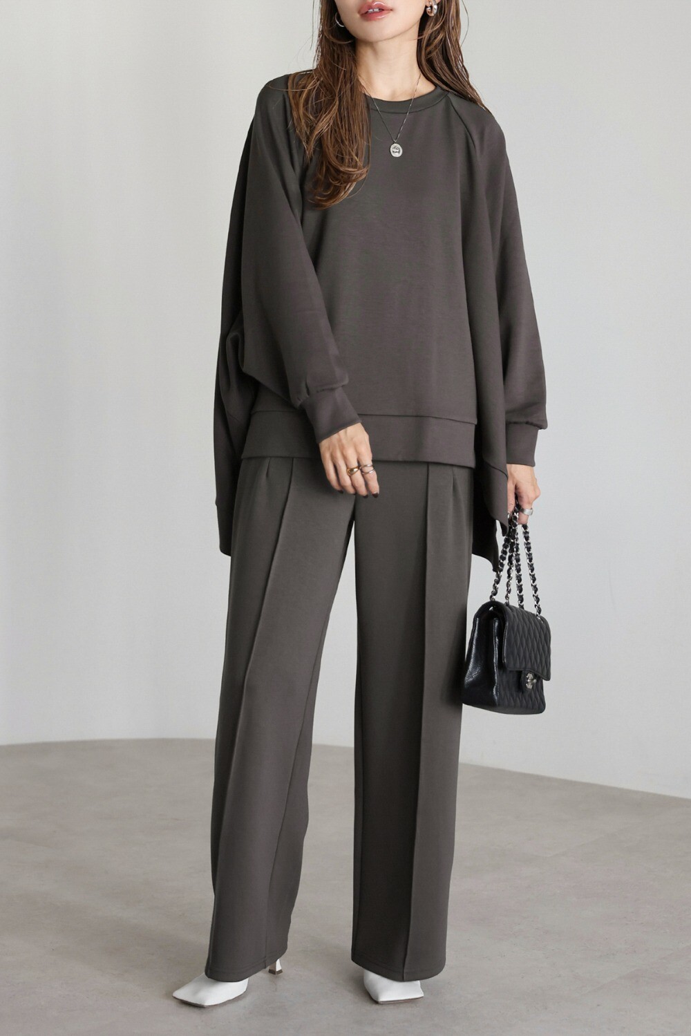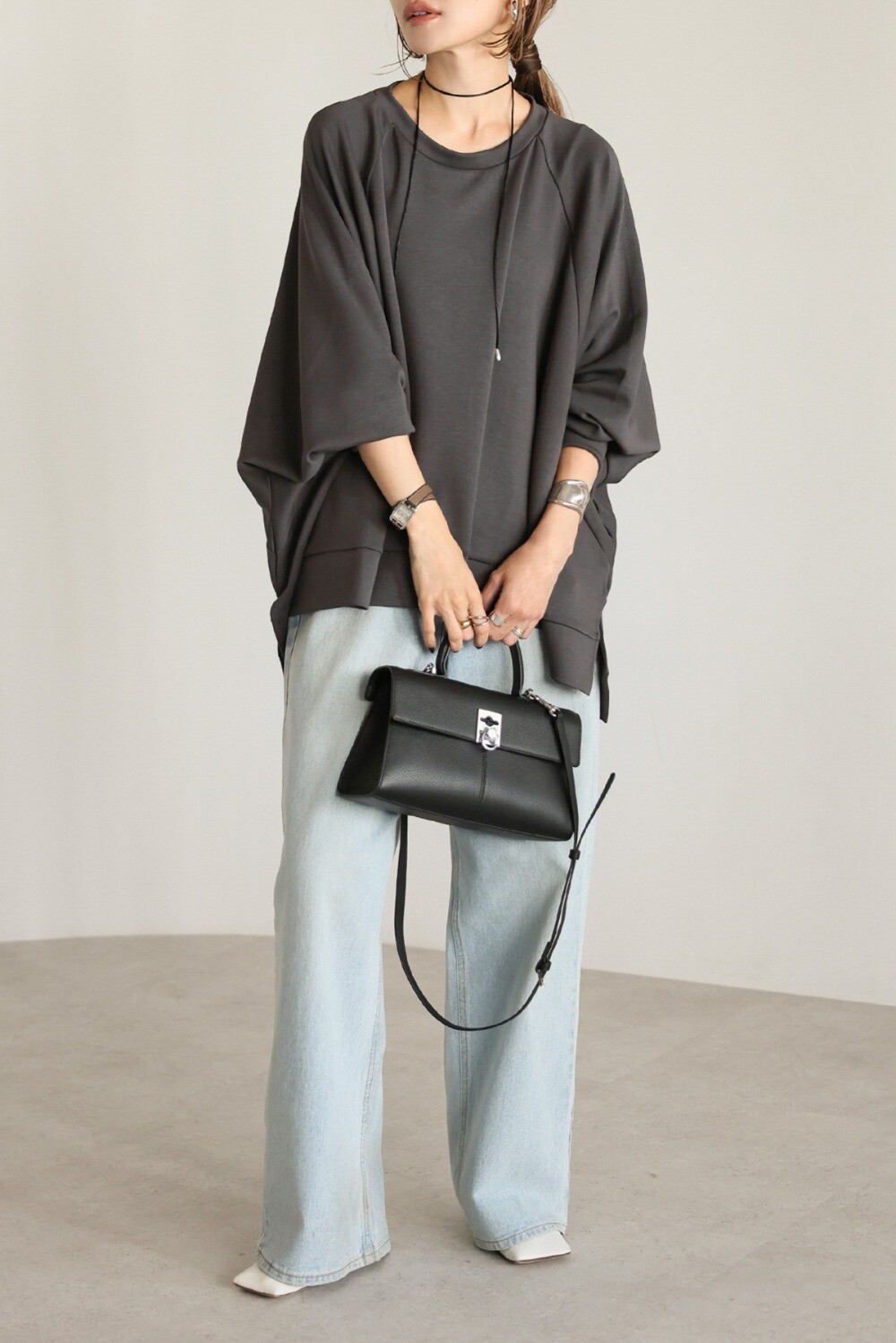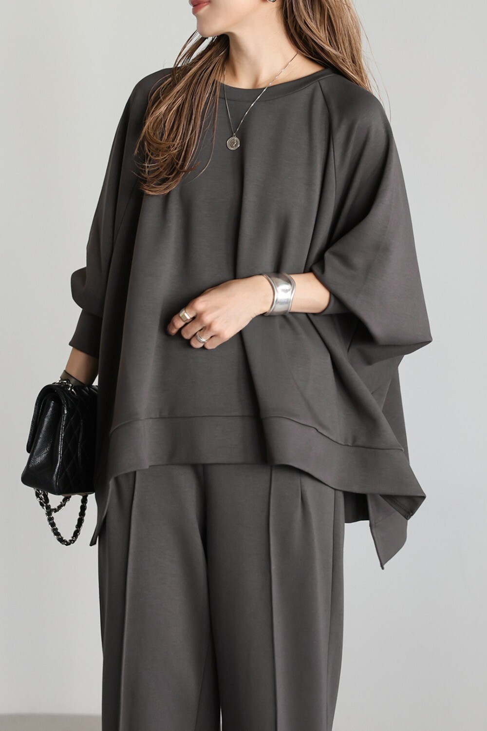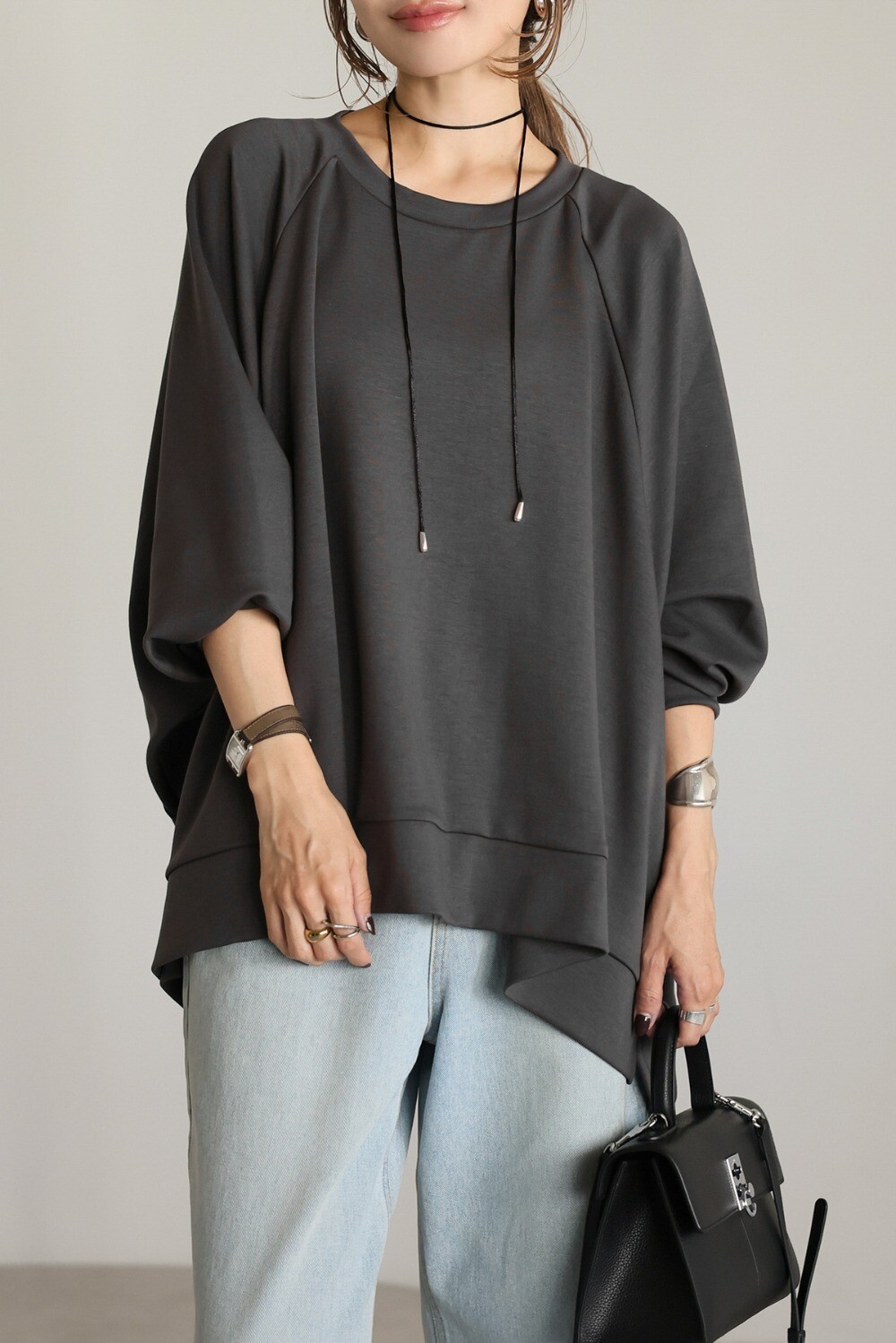ドルマンスリーブのゆとりのあるサイジングがリラクシーなプルオーバー。程よい厚みのポンチ素材で、カジュアルになり過ぎず綺麗見えする素材感です。袖ぐりはゆったりしたラグラン切替のドルマンのシルエットで、ボディラインを気にせずに着用していただけます。