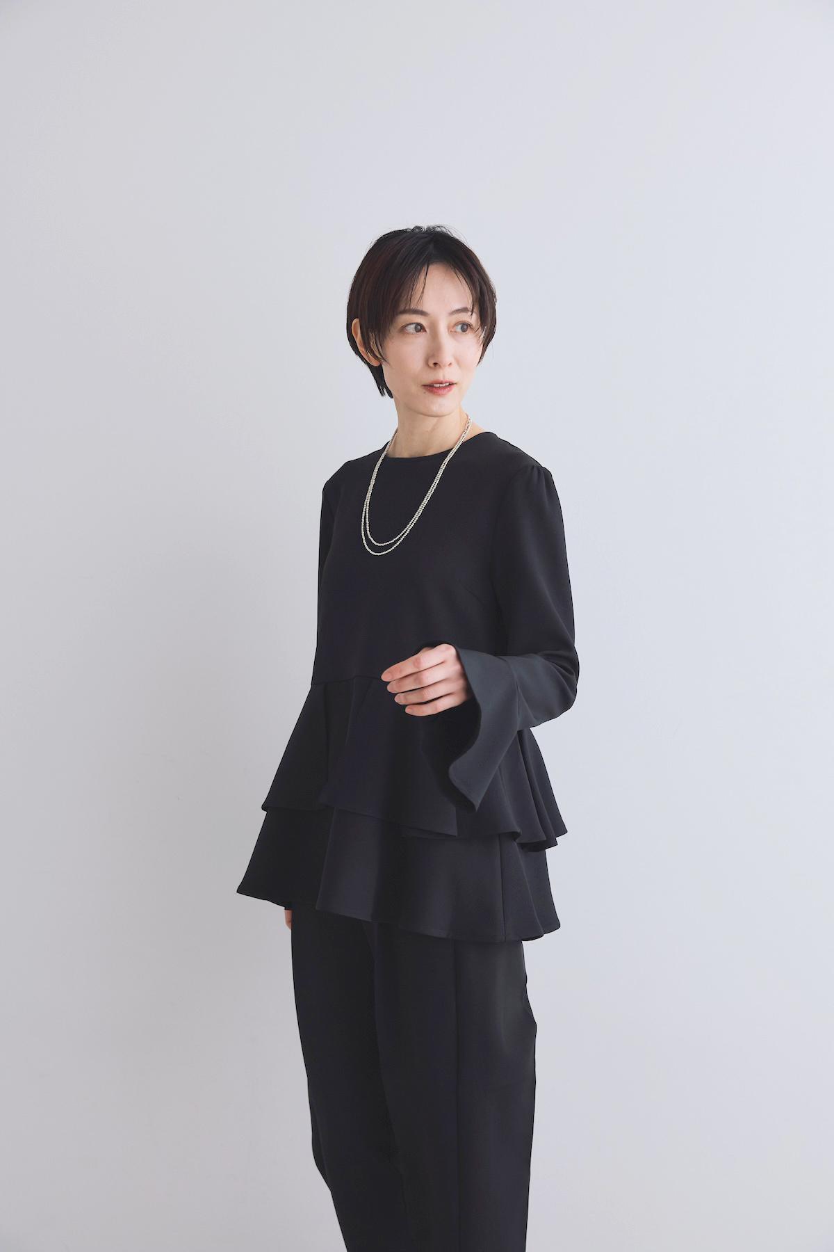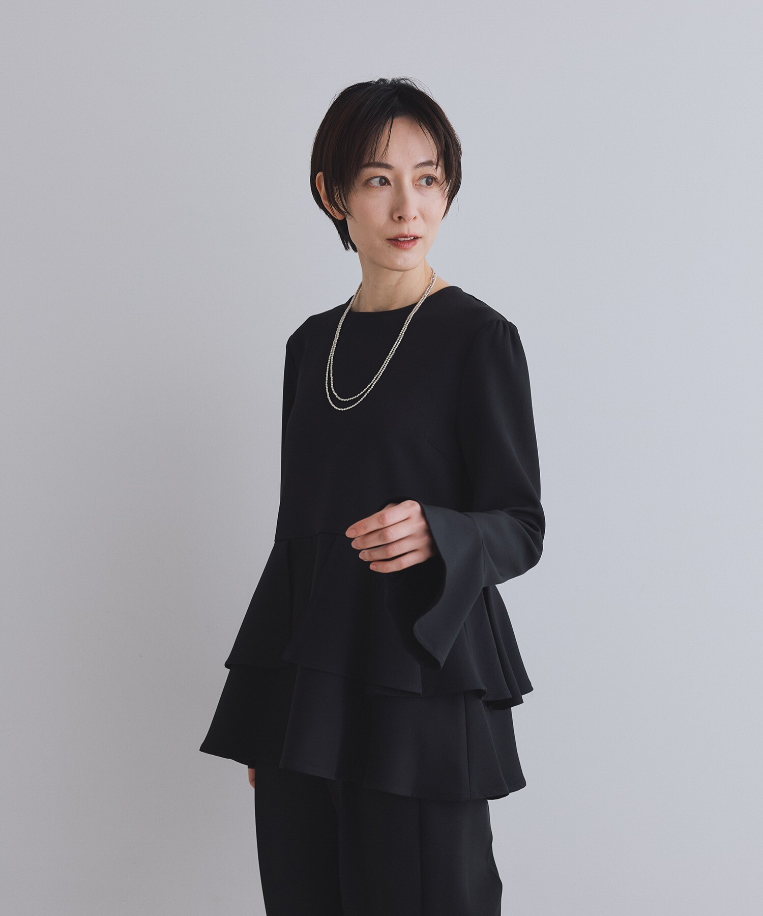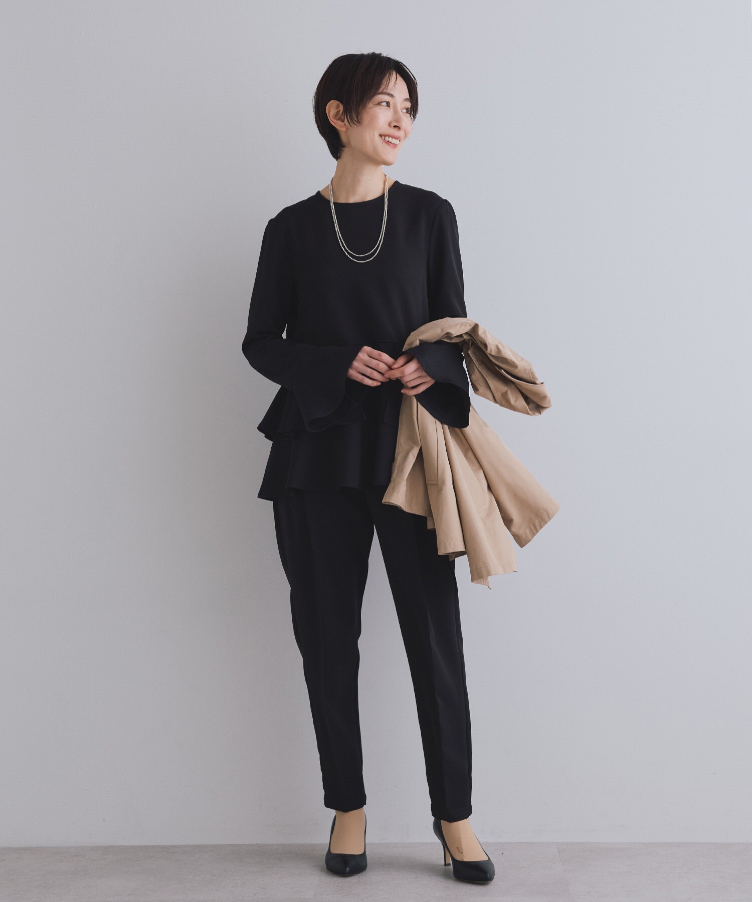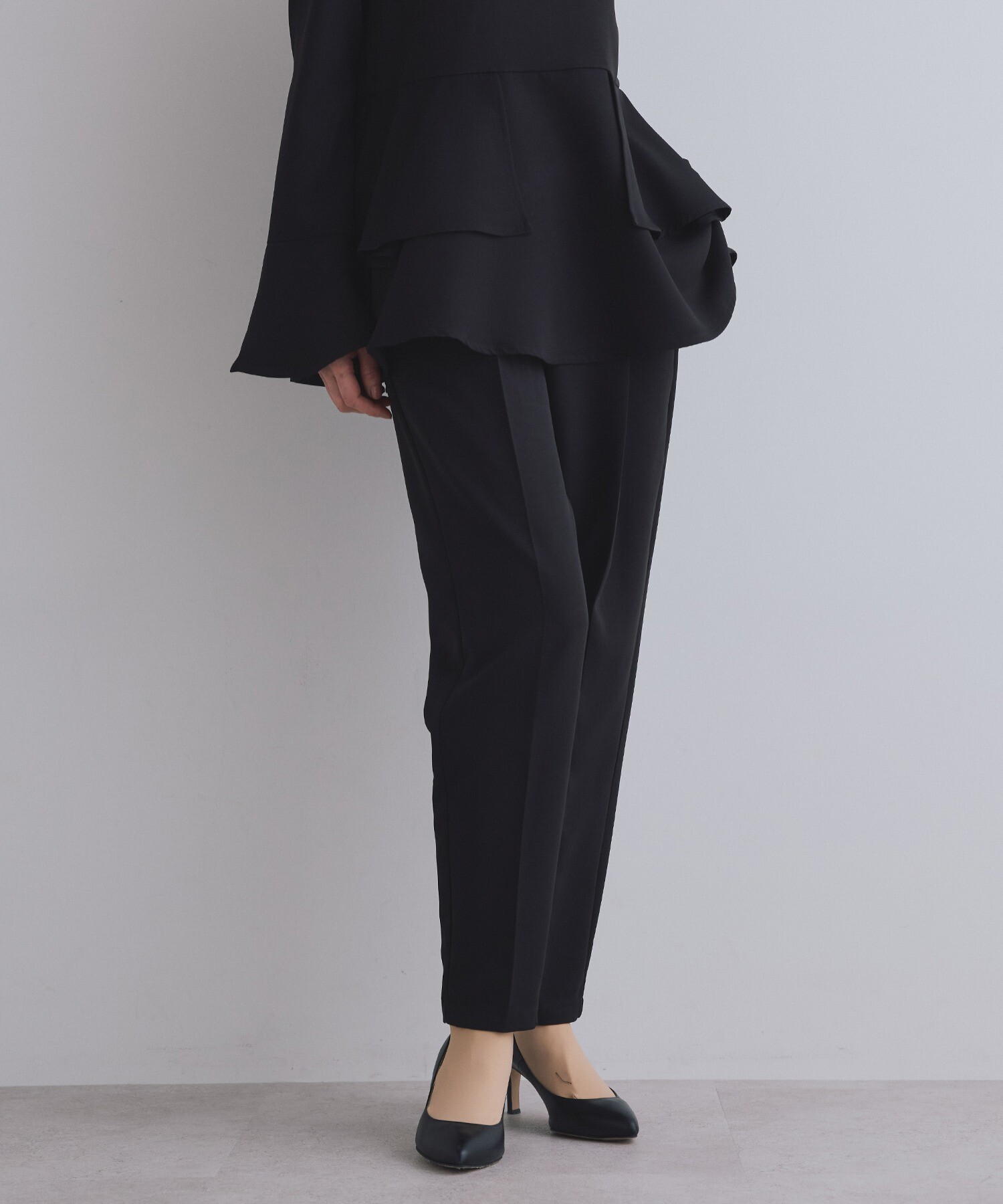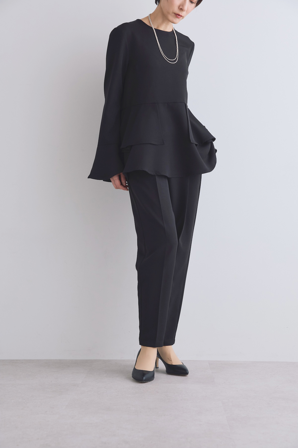 [SET]ペプラムフリルブラウス×ウエストサテンタックテーパードパンツ