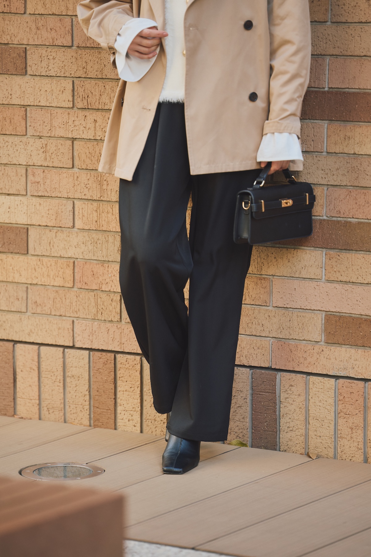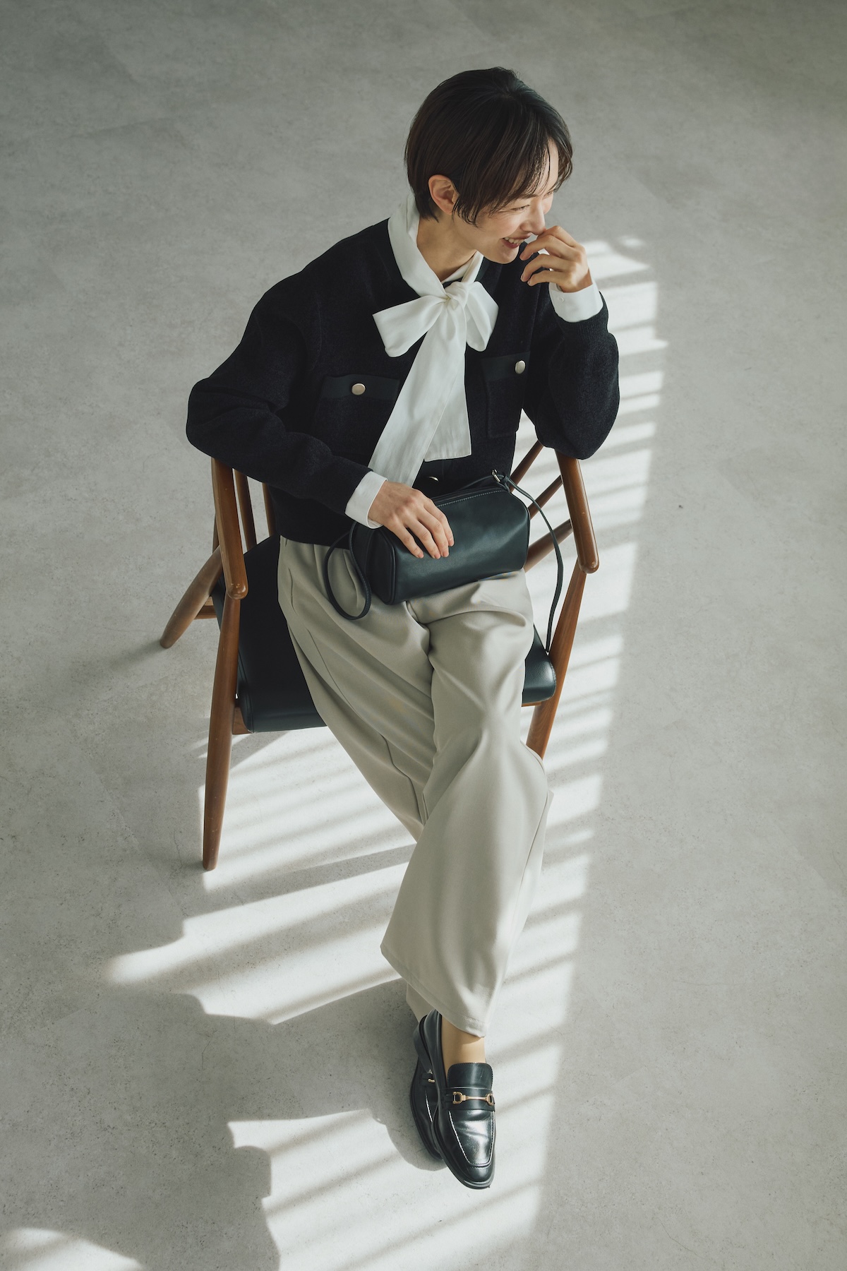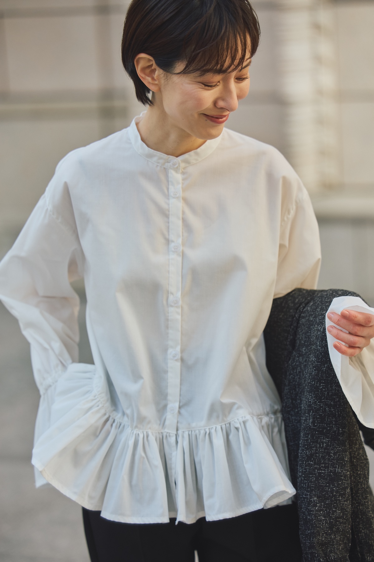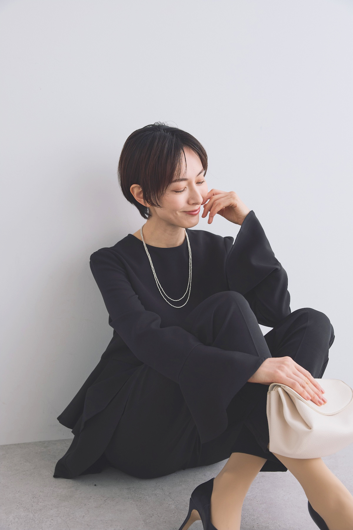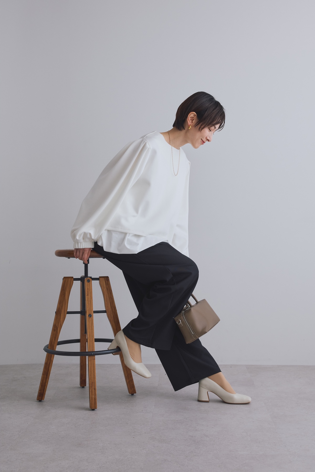 [SET]ペプラムフリルブラウス×ウエストサテンタックテーパードパンツ