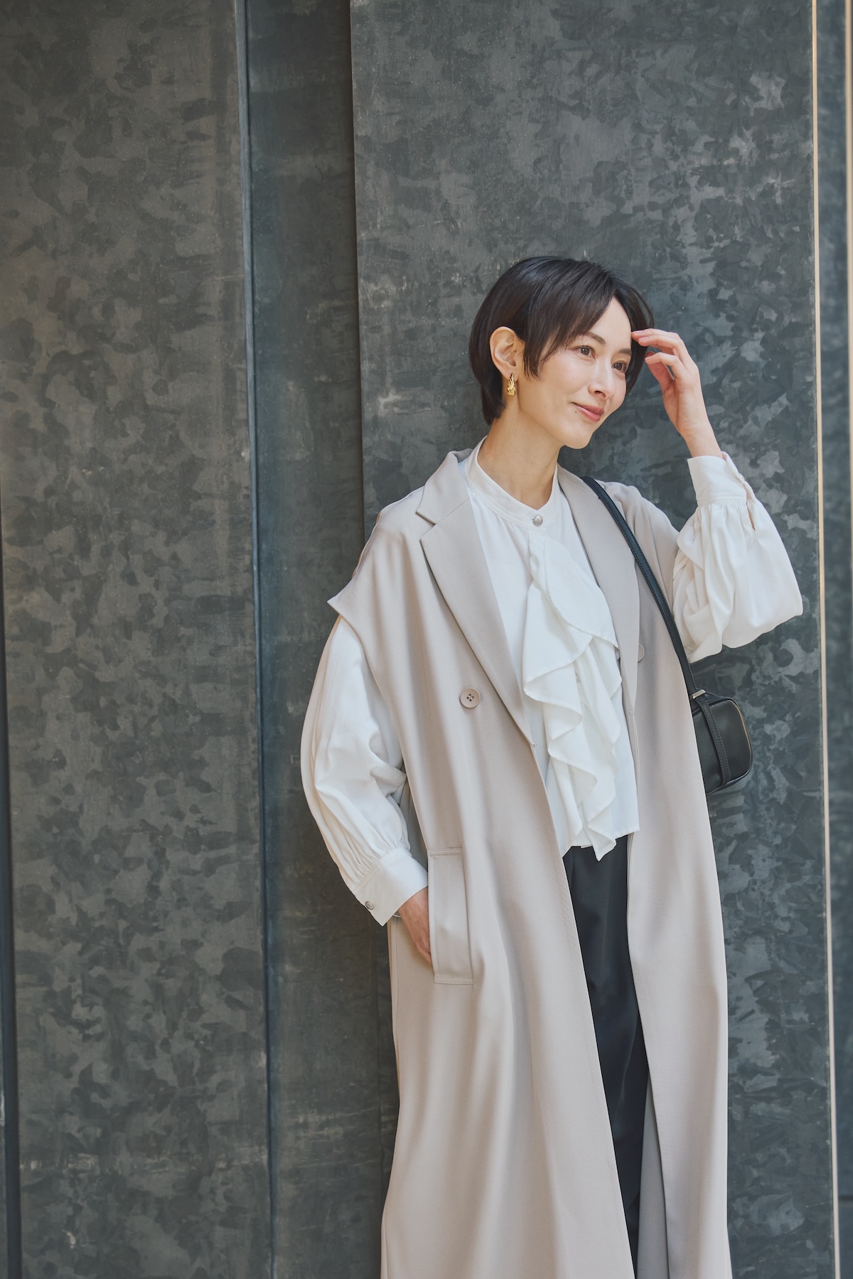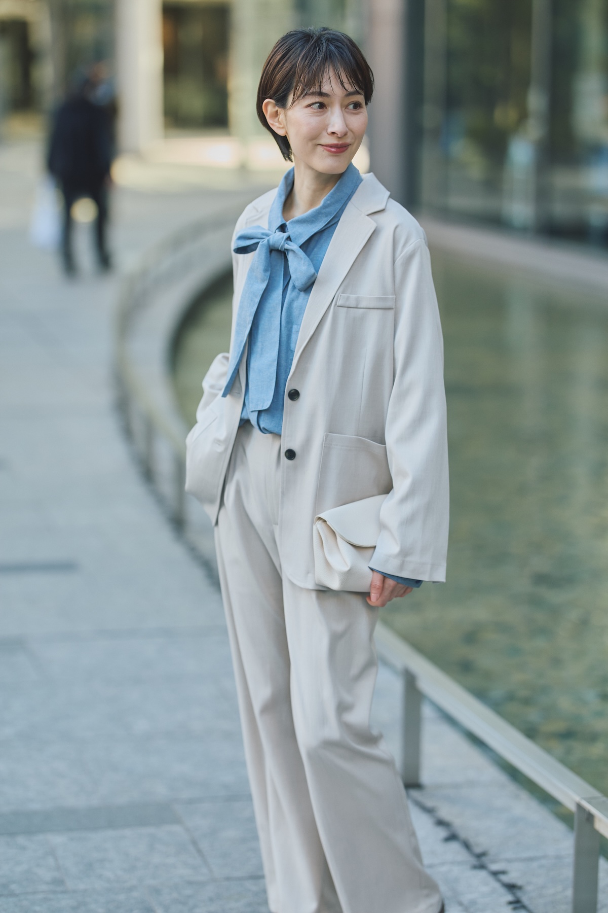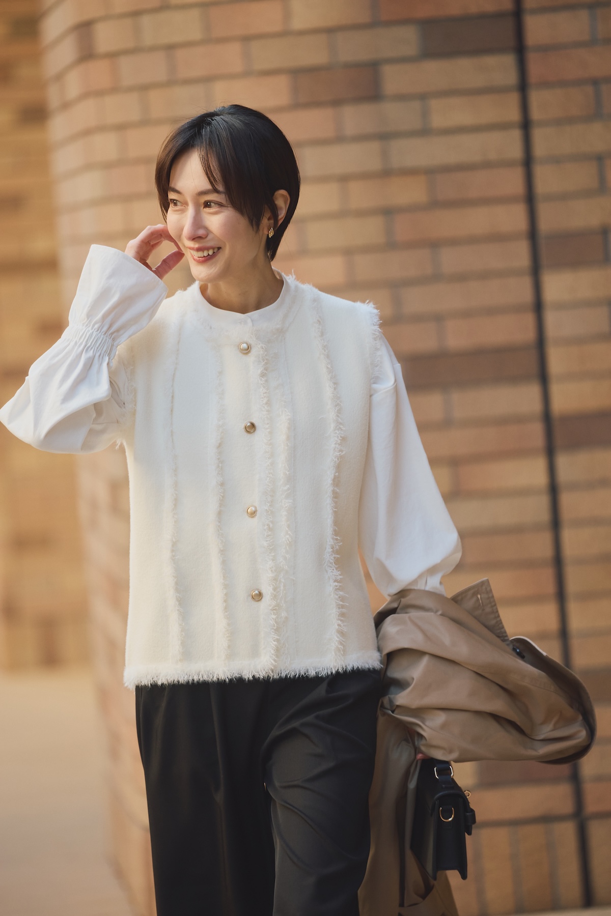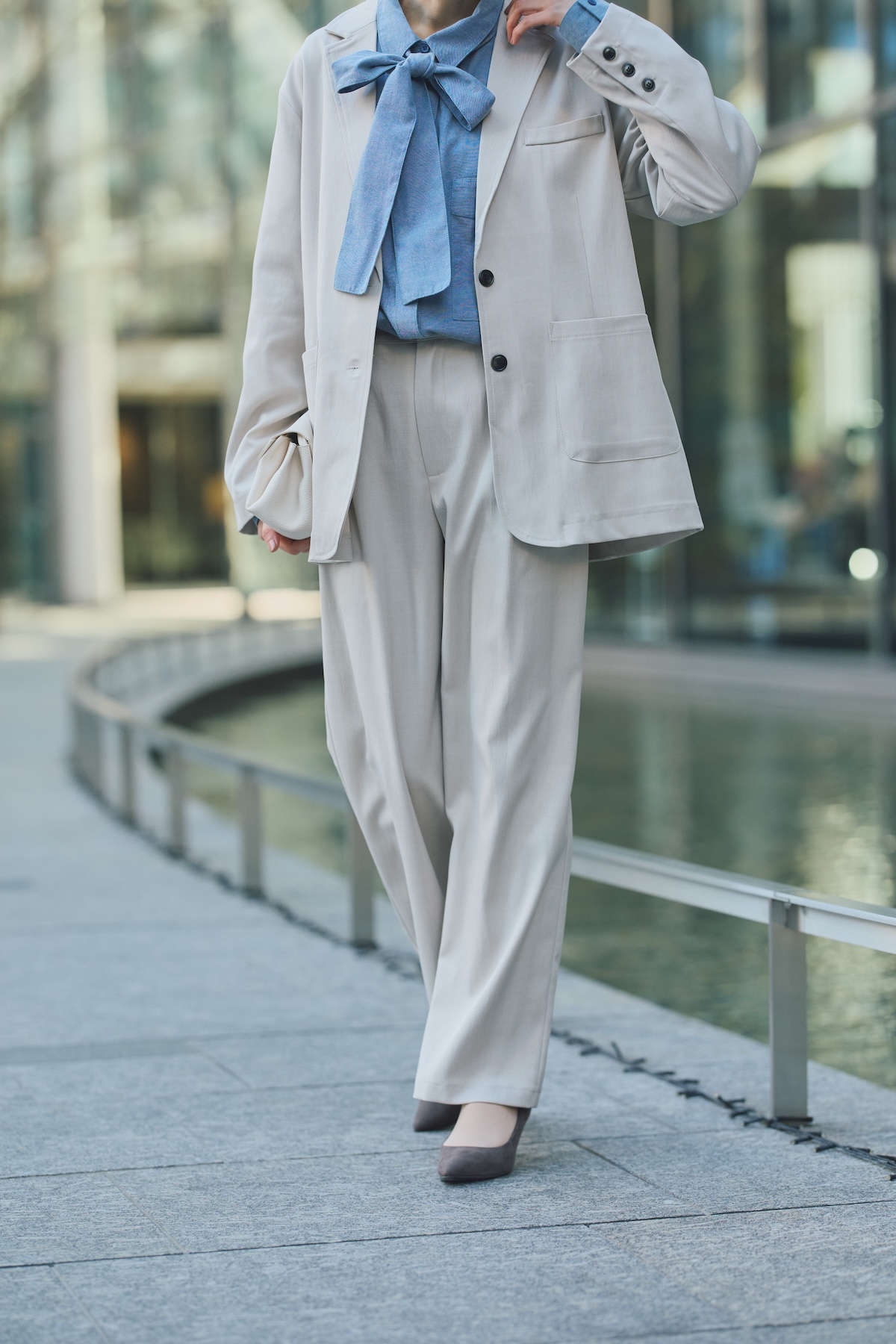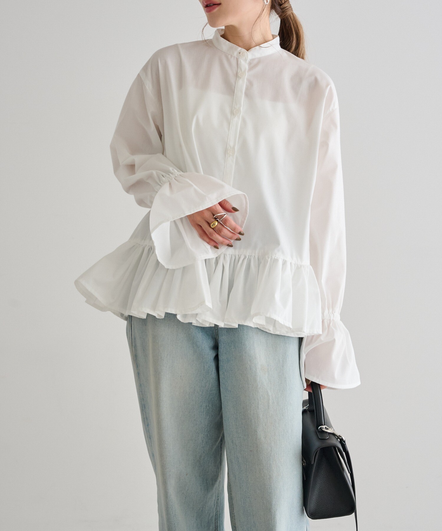 [SET]ペプラムフリルブラウス×ウエストサテンタックテーパードパンツ
